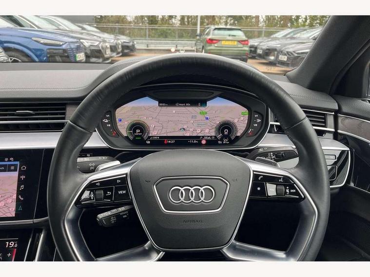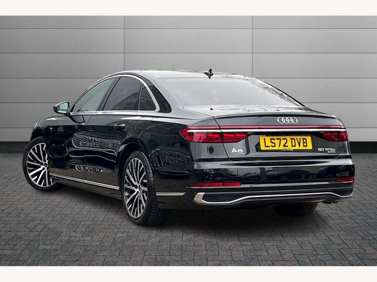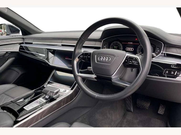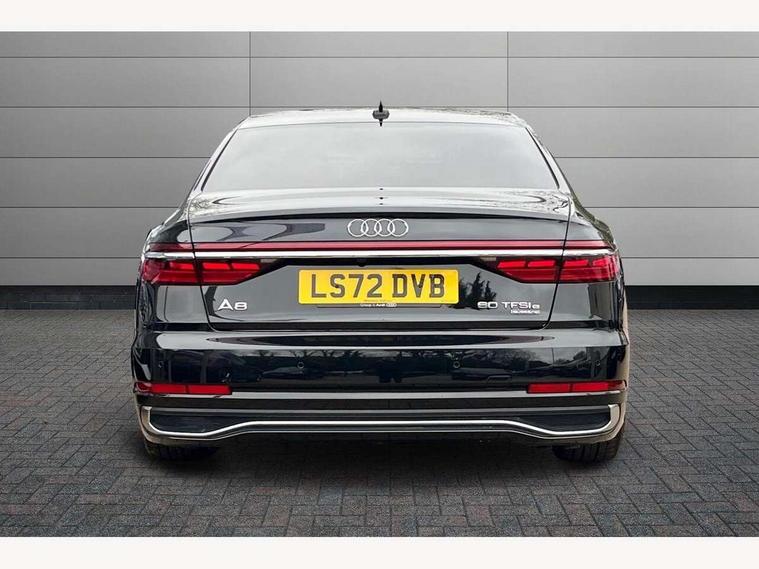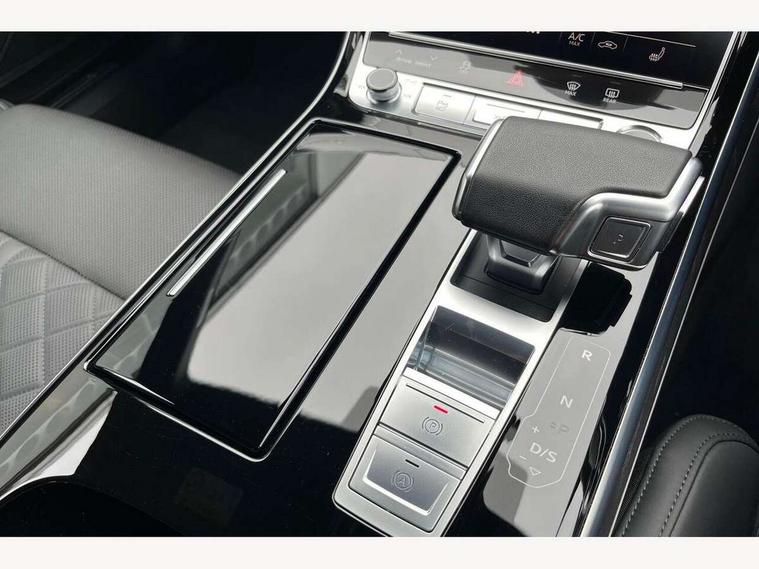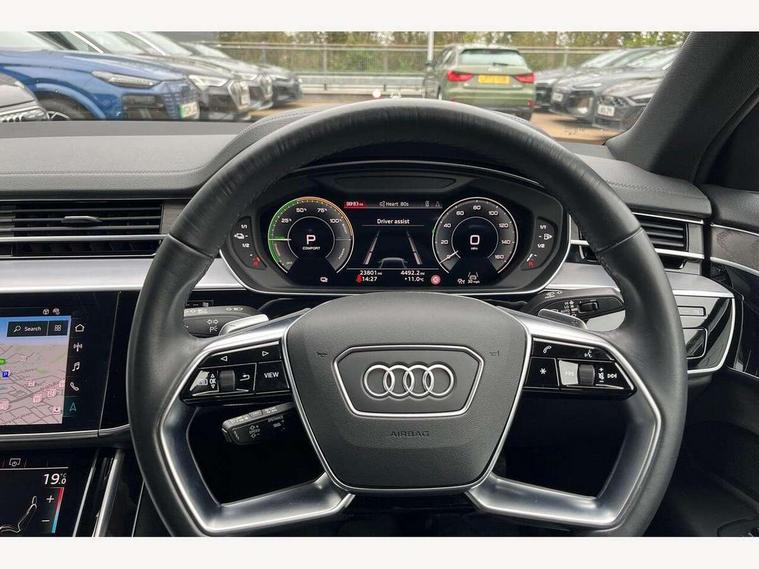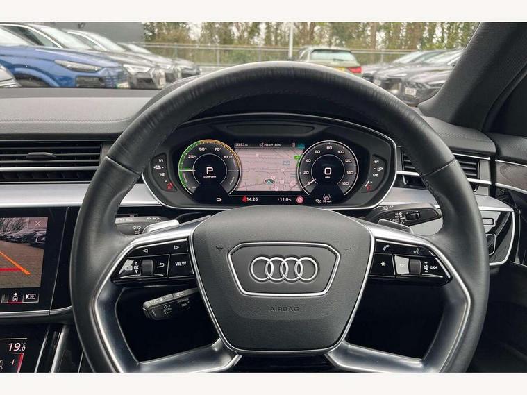 'Lights On' Reminder warning buzzer, Adaptive cruise control with cruise assist, emergency assist, efficiency assist, swerve assist, turn assist and speed limiter, Audi connect safety and service (e-call), Audi drive select, Audi parking system plus with front and rear sensors, Audi phone box with wireless charging, Audi virtual cockpit, Audi wireless smartphone interface, Bluetooth interface, Camera based traffic sign recognition, Convenience key, Electro - mechanical power assisted steering, Head up Display, MMI navigation plus with MMI touch + Twin touch screens with haptic feedback, Operating buttons in black, glass look with haptic feedback including extended aluminium look, Power door closure, Power operated tailgate, Rear view camera, Remote fuel filler release, Service interval indicator, 3 pin 10 amp domestic charging cable, 65 litre fuel tank, 7.4 kW onboard charger, 8 speed transmission with hill hold assist, Adaptive air suspension, Hybrid drive system PHEV, Industrial connector CEE 32A, 230V, long and straight for the e-tron charging system, Mode 3 charging cable for public charging (AC), Quattro all wheel drive with self locking centre differential, Type 2 socket for AC charging, Audi music interface, Audi sound system, DAB digital radio module, DVD System, MMI radio plus, USB connection, Acoustic double glazing, Audi space frame, Auto dimming rear view mirror, Body colour bumpers, Body colour door handles, Body colour exterior mirror housings, Body colour side protection with aluminium trim strips, Electric front windows, Electric rear windows with isolation switch, Electrically adjustable heated folding + automatically dimming exterior mirrors with memory function and integrated LED indicators, Headlight cleaning system, Heat insulating glass in side and rear windows, Heat insulating glass windscreen, Heated rear window, Heated windscreen washer jets, High beam assist, LED brake lights, LED daytime running lights, OLED rear lights with changeable rear light signature, Privacy glass, Rear boot, Rear side wing doors, Side skirts, Third brake light, 12V socket, 3 seat rear bench with centre armrest in 2nd row, 4 way electric lumbar support for driver and front passenger, 4 zone control automatic air conditioning, Auxiliary climate control with remote precondition, Black cloth headlining, Centre console with cupholders, Comfort centre armrest, Door pockets with bottle holder, Driver and front passenger side sunvisors with illuminated vanity mirrors, Dust/pollen filters, Electric front seats with memory function, Electric sunblinds for rear window and rear door windows, Front floor mats, Glove compartment cooling, Heated front seats, Height/reach electric steering column with easy exit function, Isofix child seat mounting points on outer rear seats, Leather gearknob, Passenger footwell storage net, Reading lights, Rear floor mats, Rear headrests, Roof mounted sunglasses holder, Single front passenger seat, Valcona leather upholstery with front sports seats in diamond quilted, Chrome exterior pack - A8, High gloss styling pack - A8, LED interior lighting pack - A8, S line exterior styling pack - A8, 3 point seatbelts on all rear seats, ABS/EBD, Acoustic vehicle alerting system, Active front headrest system, ASR traction control, Audi pre sense basic, Audi pre sense front, Driver/Front Passenger airbags, EDL traction control, Electromechanical parking brake, ESP, Extended pedestrian protection measures, Front and rear side airbags with head airbag system, Front brake discs, callipers painted black, Front passenger airbag deactivation, Rear brake discs, callipers painted black, Rear child proof door locks, Seatbelt reminder + electric contact in buckle + advanced safety equipment, Tyre pressure loss indicator, Warning triangle and first aid kit, Anti theft alarm tow away protection, Anti-theft wheel bolts and wheel loosening detection, Remote central locking, Dark matt brushed aluminium lower inlays, Tyre repair kit,