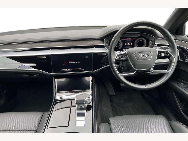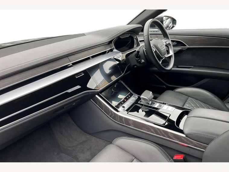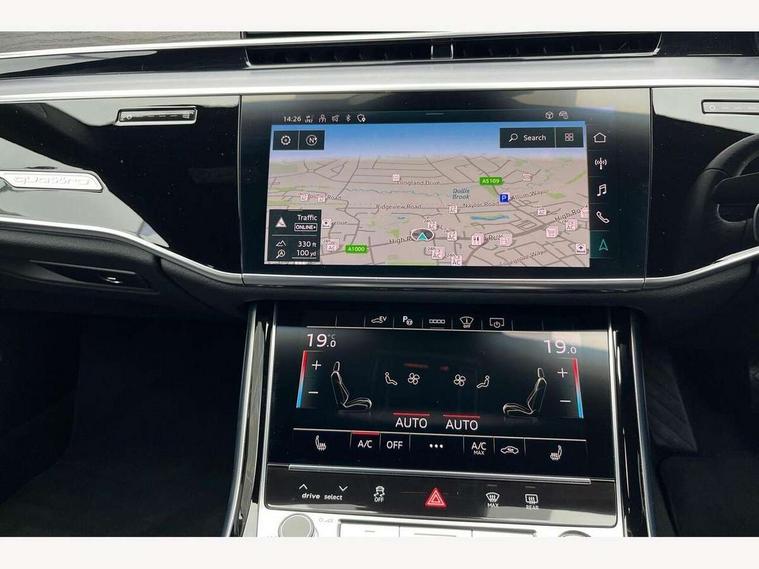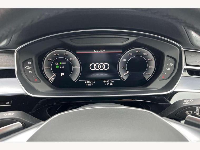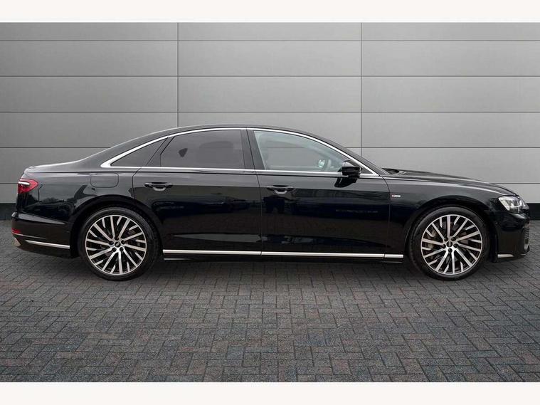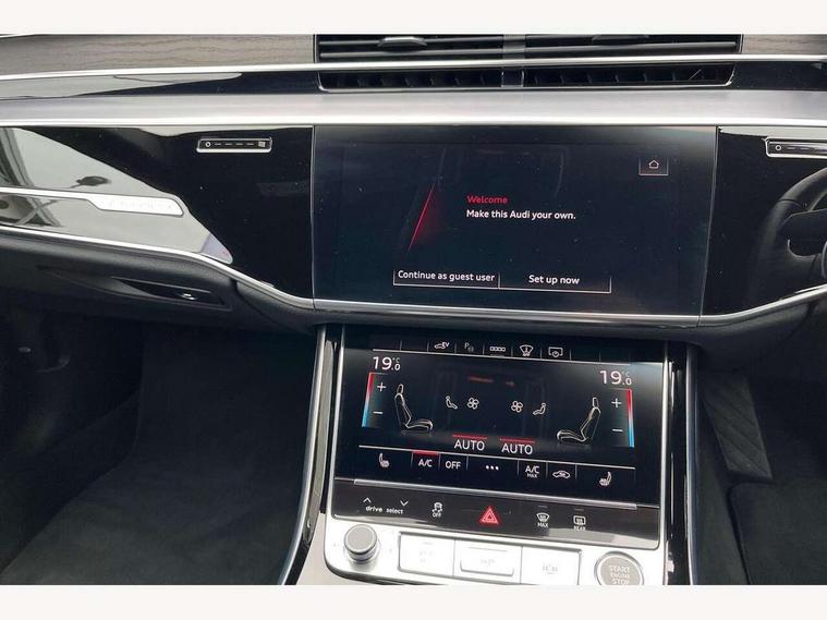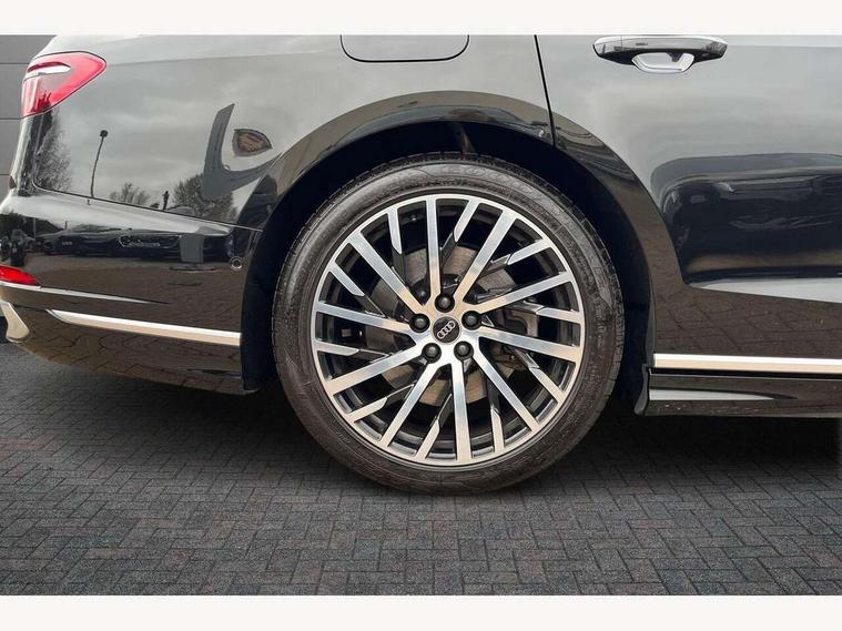 'Lights On' Reminder warning buzzer, Adaptive cruise control with cruise assist, emergency assist, efficiency assist, swerve assist, turn assist and speed limiter, Audi connect safety and service (e-call), Audi drive select, Audi parking system plus with front and rear sensors, Audi phone box with wireless charging, Audi virtual cockpit, Audi wireless smartphone interface, Bluetooth interface, Camera based traffic sign recognition, Convenience key, Electro - mechanical power assisted steering, Head up Display, MMI navigation plus with MMI touch + Twin touch screens with haptic feedback, Operating buttons in black, glass look with haptic feedback including extended aluminium look, Power door closure, Power operated tailgate, Rear view camera, Remote fuel filler release, Service interval indicator, 3 pin 10 amp domestic charging cable, 65 litre fuel tank, 7.4 kW onboard charger, 8 speed transmission with hill hold assist, Adaptive air suspension, Hybrid drive system PHEV, Industrial connector CEE 32A, 230V, long and straight for the e-tron charging system, Mode 3 charging cable for public charging (AC), Quattro all wheel drive with self locking centre differential, Type 2 socket for AC charging, Audi music interface, Audi sound system, DAB digital radio module, DVD System, MMI radio plus, USB connection, Acoustic double glazing, Audi space frame, Auto dimming rear view mirror, Body colour bumpers, Body colour door handles, Body colour exterior mirror housings, Body colour side protection with aluminium trim strips, Electric front windows, Electric rear windows with isolation switch, Electrically adjustable heated folding + automatically dimming exterior mirrors with memory function and integrated LED indicators, Headlight cleaning system, Heat insulating glass in side and rear windows, Heat insulating glass windscreen, Heated rear window, Heated windscreen washer jets, High beam assist, LED brake lights, LED daytime running lights, OLED rear lights with changeable rear light signature, Privacy glass, Rear boot, Rear side wing doors, Side skirts, Third brake light, 12V socket, 3 seat rear bench with centre armrest in 2nd row, 4 way electric lumbar support for driver and front passenger, 4 zone control automatic air conditioning, Auxiliary climate control with remote precondition, Black cloth headlining, Centre console with cupholders, Comfort centre armrest, Door pockets with bottle holder, Driver and front passenger side sunvisors with illuminated vanity mirrors, Dust/pollen filters, Electric front seats with memory function, Electric sunblinds for rear window and rear door windows, Front floor mats, Glove compartment cooling, Heated front seats, Height/reach electric steering column with easy exit function, Isofix child seat mounting points on outer rear seats, Leather gearknob, Passenger footwell storage net, Reading lights, Rear floor mats, Rear headrests, Roof mounted sunglasses holder, Single front passenger seat, Valcona leather upholstery with front sports seats in diamond quilted, Chrome exterior pack - A8, High gloss styling pack - A8, LED interior lighting pack - A8, S line exterior styling pack - A8, 3 point seatbelts on all rear seats, ABS/EBD, Acoustic vehicle alerting system, Active front headrest system, ASR traction control, Audi pre sense basic, Audi pre sense front, Driver/Front Passenger airbags, EDL traction control, Electromechanical parking brake, ESP, Extended pedestrian protection measures, Front and rear side airbags with head airbag system, Front brake discs, callipers painted black, Front passenger airbag deactivation, Rear brake discs, callipers painted black, Rear child proof door locks, Seatbelt reminder + electric contact in buckle + advanced safety equipment, Tyre pressure loss indicator, Warning triangle and first aid kit, Anti theft alarm tow away protection, Anti-theft wheel bolts and wheel loosening detection, Remote central locking, Dark matt brushed aluminium lower inlays, Tyre repair kit,