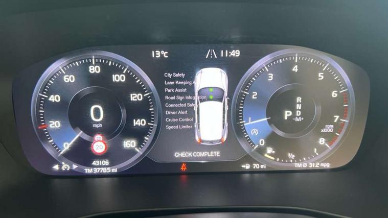 12.3" Active TFT crystal driver's instrument display, 9" centre console portrait touch screen, Adjustable steering wheel force, Bluetooth hands free telephone kit, Drive mode selector, Lane keep assist with driver alert control, Oncoming Lane Mitigation, Sensus navigation with European mapping and traffic information, Speed limiter, Speed sensitive steering, Voice control system, Volvo on call, DAB Digital radio, Steering wheel mounted remote controls, Adaptive brake lights with high level LED brake lights, Auto dimming interior mirror, Automatic headlamp levelling, Body colour door mirrors, Chrome window surround, Colour coordinated auto folding and heated power door mirrors, Dual exhaust pipes, Electrically adjustable and heated door mirrors, Embossed rear side roof pillar, Front and rear electric windows, Front tread plates, High gloss black grille with chrome inserts, Home safe and approach lighting, LED front fog lights, LED Headlights + Active high beam incorporating daytime running lights, Matt silver front and rear skid plate, Rain sensor windscreen wipers, Rear wiper, Roof antenna, Roof spoiler, Silver roof rails, Visible VIN plate, 12V socket in front tunnel console and cargo compartment, 2 zone electronic climate control with Clean zone air quality system + pollen filter + cooled glovebox, 3 spoke leather steering wheel with chrome trim, 60/40 split folding rear seat, A-pillar parking ticket holder, Ambient front door and instrumental panel lighting, Bright metal luggage threshold, Centre console cupholders and storage, Driver seat height/tilt/lumbar adjust, Driver's side lower dashboard credit card storage compartment, Front door pocket and front cupholder illumination, Front footwell illumination, Front tunnel net pocket and integrated waste bin, Glovebox bag hook, Height/reach adjustable steering column, High gloss centre tunnel deco, Illuminated luggage compartment, Illuminated tailgate, Illuminated vanity mirrors + ticket holder, Isofix attachments on rear seats, Leather coloured key integrated remote, Leather faced upholstery, Load protection net, Lockable/illuminated glovebox, Luxury floor mats, Multicolour theatre lights, Orrefors Crystal Gear Lever Knob, Passenger seat adjustable for lumbar support, Power driver seat with memory + exterior mirrors memory, Rear armrest / integral cup holders / storage tray, Rear reading and courtesy lights, Underfloor stowage compartment, 3x3 point rear seatbelts, City safety, Drivers knee airbag, DSTC-Dynamic Stability and Traction Control, Dual stage driver/passenger airbags, Electronic parking brake with auto hold, Fasten seatbelt reminder, First aid kit, Hill descent control, Hill start assist, Inflatable curtain, Passenger airbag cut-off device, Road sign information display, Run off Road Mitigation, Run off Road Protection, Seatbelt reminder and pretensioners, SIPS (Side Impact Protection System), SIPS airbags, Slippery road and hazard light alert, Tyre pressure monitoring system, Vehicle deceleration control with Anti-lock Brake System, Electronic Brake Distribution and Emergency Brake Assist, Warning triangle, WHIPS whiplash protection system - front, Anti-theft alarm including immobiliser/volume sensor + level sensor, Fuel flap with deadlocking system, Key integrated remote control central locking, Locking wheel nuts, Private locking for tailgate,