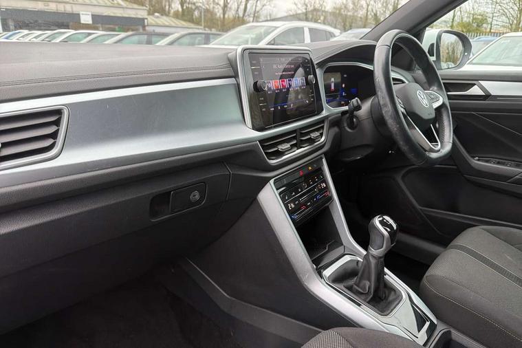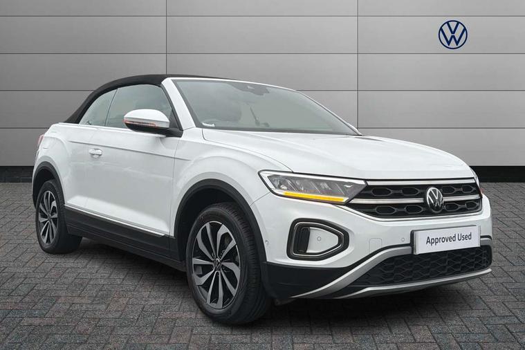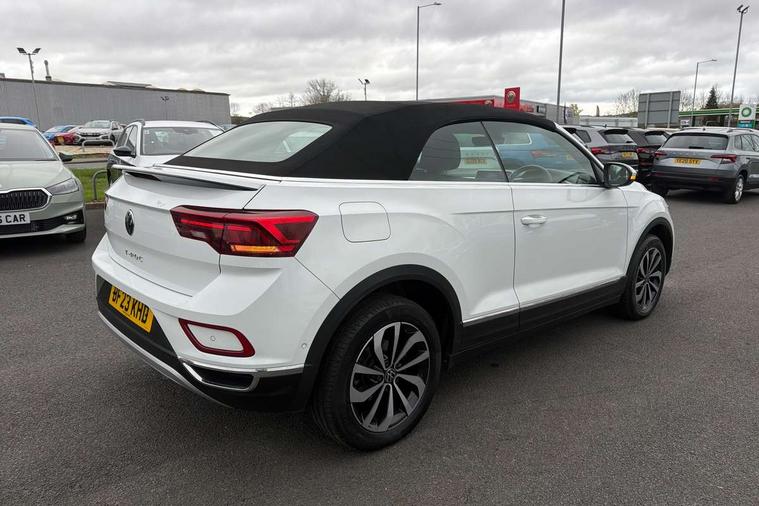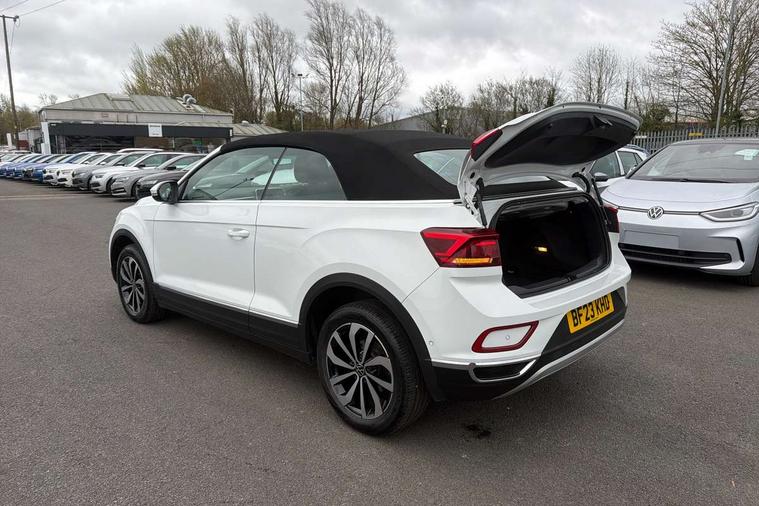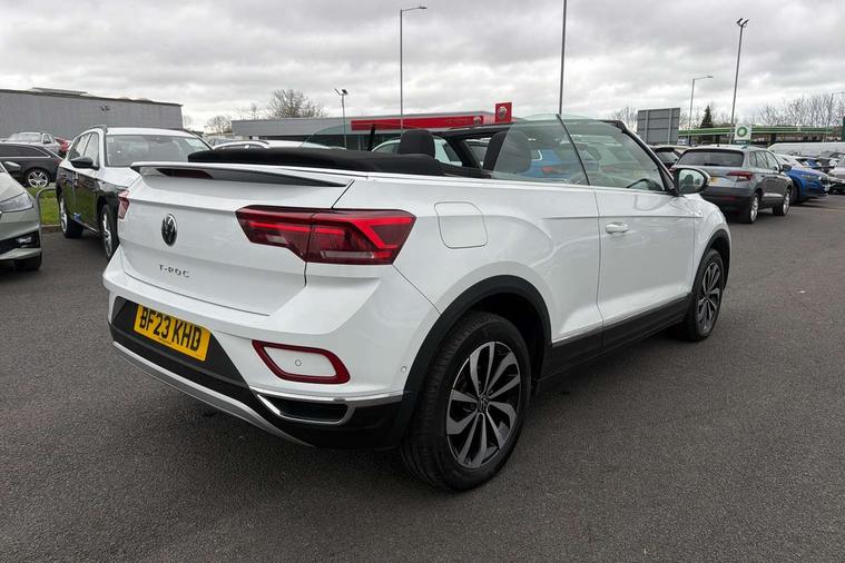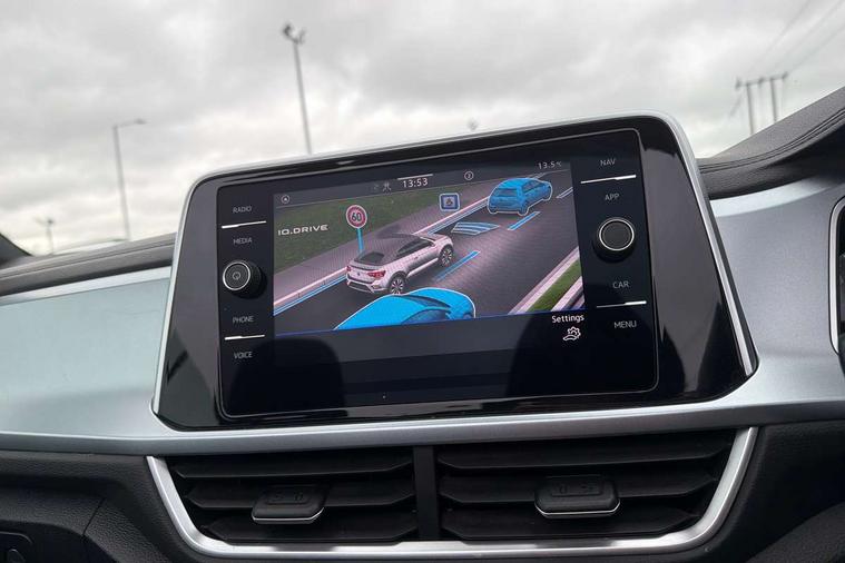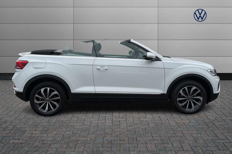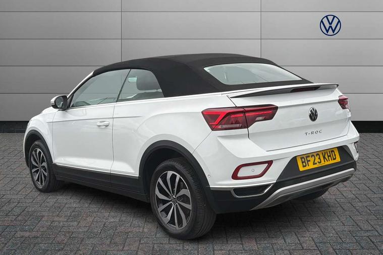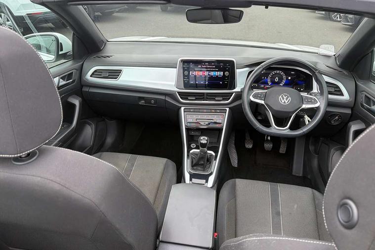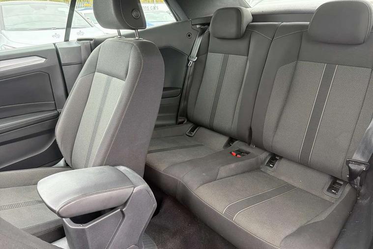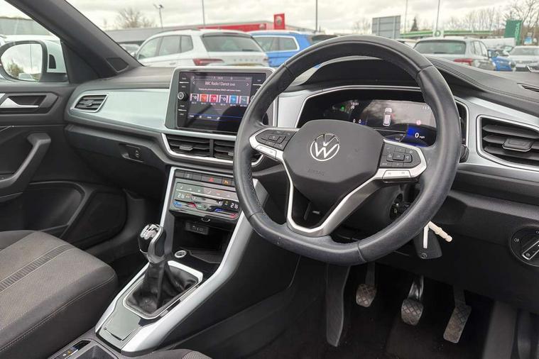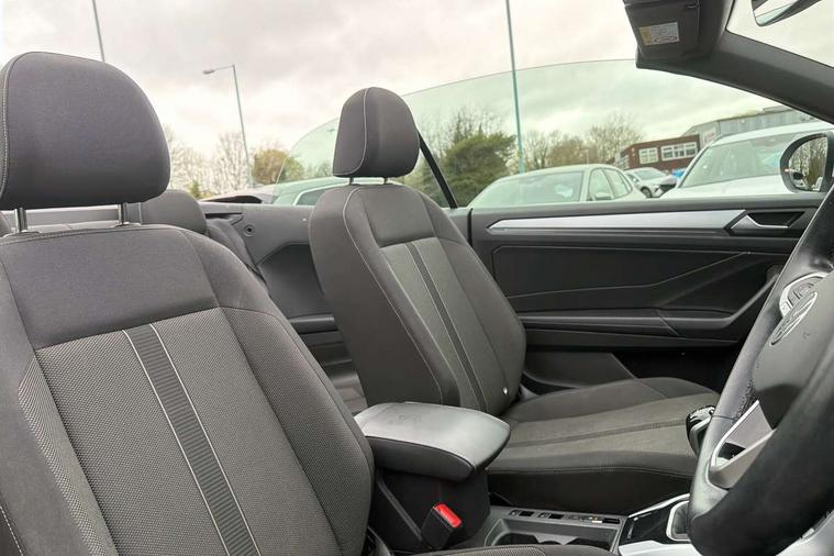 Adaptive cruise control and speed limiter, Bluetooth mobile phone interface, Brake pad wear indicator, Car information display, Driver alert system with fatigue detection, Driver tips and journey analysis, Emergency call service, Modified key software - reduce switch off time for key status change to Long no motion, Multifunction computer with visual gear change recommendation for fuel consumption, Multifunction front facing camera, Park assist including front and rear parking sensors, Speedo and rev counter, electronic odometer, trip, service interval display and exterior temperature gauge, Start/stop system with brake energy recovery, Tailgate/trunk lid release from outside, Warning sound and light for front seatbelts unfastened, Diversity antenna for FM reception, Music playback - MP3, WMA and AAC files, SMS functionality - read, compose and send SMS messages using touch-screen display, Title and cover art display, USB-C Interface and USB charging socket, We Connect and We Connect Plus functionality, Ambient lighting with logo projection, Auto dimming interior rear view mirror, Automatic hazard lights activation under emergency braking, Automatic headlight control with LED separate daytime running lights with coming/leaving home function, Black roof, Body colour door handles, Body colour rear spoiler, Body coloured bumpers and radiator grille with chrome trim and front fog lamps with chrome bezel, Chrome effect left and right trapezoid exhaust tailpipe fascia surround, Dark red rear combination lamps in LED technology, Dusk sensor, Exterior mirrors aspherical on driver side, convex on front passenger side, Headlight range control, Heat insulating glass windscreen, High level 3rd brake light, LED Headlights, LED rear number plate lights, Power operated canvas convertible top, Power windows with comfort operation and circuit breaker, Rain sensor, Rear boot, Rear exhaust tailpipe, Rear fog light on one side and reversing lights on both sides, Remote electrically foldable door mirrors, puddle lights and reverse activated passenger door mirror, Volkswagen roundel, Windscreen wiper with intermittent wipe light, Without exterior ambient lighting, 12V socket in centre console storage area, 2 LED front reading lights, 2 seat bench in 2nd row, 50:50 Split folding rear seat backrests with fixed rear seat bench, Air care climatronic air conditoning system with active combination filter and 2-zone temperature control, Black door lower parts with chrome trim, Chrome plated surround to light, mirror and window switch, Door and side trim panel with leatherette insert, Easy entry backrest release, Front and rear carpet mats with black stitching, Front centre armrest, Front cupholders x 2, Front door pockets, Front seat back storage pockets, Heated multi function steering wheel, Height/reach adjust steering wheel, Instrument lighting, white adjustable panel illumination, Interior light delay, Interior light in footwell, Interior lighting with switch off delay and contact switches on all doors, Interior white ambient lighting and surround lighting, Isofix child seat preparation, Lockable glove compartment with light, Luggage compartment lighting, Rear head restraints, Single front passenger seat, Sun visors with illuminated vanity mirrors, Driver assistance pack without proactive passenger protection - T-Roc cabriolet, 2 x 3-point seatbelts/outer rear seats with ECE label, Driver and front passenger airbag with front passenger airbag deactivation, Driver and front passenger safety-optimised head restraints, Drivers seatbelt reminder, Electronic parking brake, Electronic Stability Control (ESC) including ABS, ASR and EDL, Front and rear disc brakes, Front assist with autonomous emergency braking, Pedestrian monitoring, Predictive pedestrian protection, Rigid safety cell with front and rear crumple zones, Side airbag/thorax airbag system, for front passengers, Single tone horn, Three point height adjust front seatbelts + pretensioners, Tyre pressure loss indicator, Volkswagen roadside assistance, Anti-theft alarm system with interior protection and central locking system with SAFELOCK, radio remote control and 2 remote control folding keys, Electronic engine immobiliser, Trims for alloy wheels,