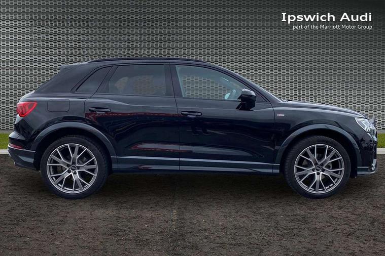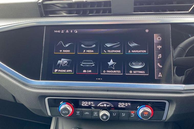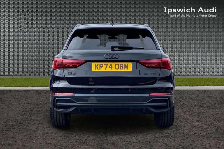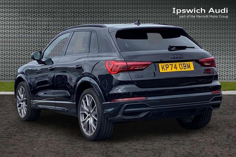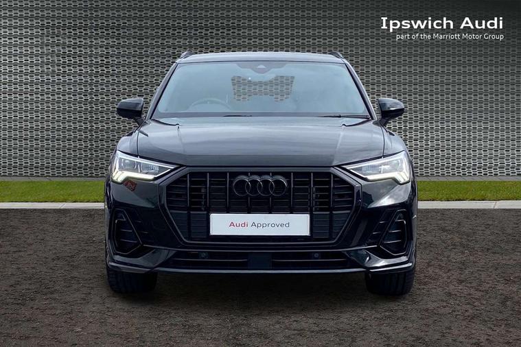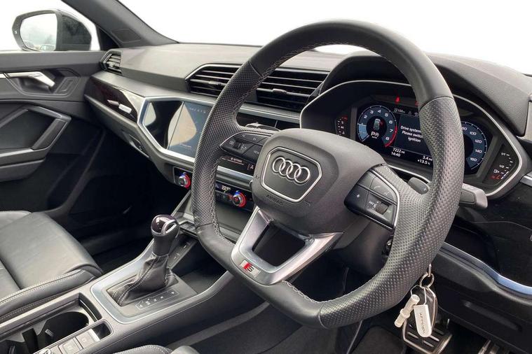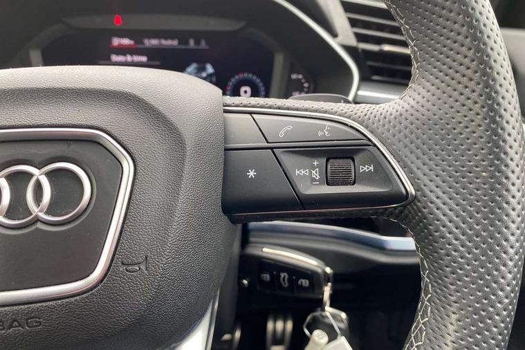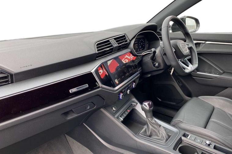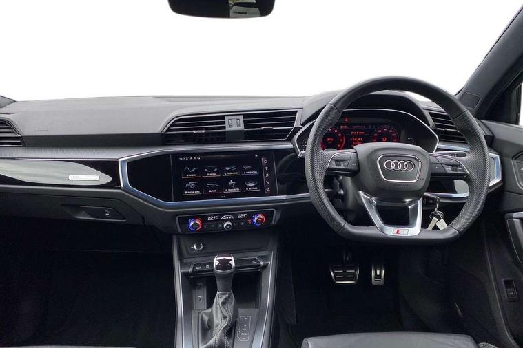 Amazon alexa Integration, Audi connect safety and service, Audi drive select, Audi lane departure warning, Audi smartphone interface includes wireless Apple carplay/Android Auto, Audi Virtual Cockpit - 10.25" display, Bluetooth interface, Camera based traffic sign recognition, Distraction and Fatigue warning, Legal emergency call, MMI Navigation Plus with high resolution 10.1 inch touchscreen colour display, Power operated tailgate, Progressive steering, Service interval indicator, Start stop system with recuperation, Voice control system with natural language interaction, Sports suspension, 2 USB-C ports with charge and data functions, 6 passive loudspeakers, DAB digital radio module, Acoustic windscreen, Audi Beam uses LEDs to project the Audi logo onto the ground as you exit your Q3, Auto dimming door mirrors, Auto dimming frameless rear view mirror, Black roof rails, Electrically folding, adjustable and heated door mirrors with integrated LED side indicators and kerb view function for passenger side, Front and rear electric windows, Front fog lights, Grille vertical bars in aluminium silver/Matt, High gloss black finish B and C pillars, LED Dynamic rear indicators, LED headlights with LED daytime running lights, LED rear lights, LED third brake light, Privacy glass dark tinted rear and rear-side windows (from B-pillar backwards), Rain and light sensors, Rear diffuser grille in grained matt black, Rear diffuser strip in matt anthracite black, Rear side wing doors, Rear wiper, S line bumpers in contrasting Manhattan grey, Variable front intermittent wipers, 12V socket in rear centre console, 3 seat bench in 2nd row, 40:20:40 folding with manual adjustment for 60:40 forwards/backwards position and backrest angle, Adjustable rear seat bench/backrest with centre armrest and cupholder, Black cloth headlining, Dual zone electronic climate control, Electric lumbar support, Front and rear black floor mats with contrast stitching in rock grey, Front and rear headrests, Front centre armrest, Height and reach adjustable steering wheel, Illuminated door sill trims with S logo, ISOFIX child seat mounting for front passenger with airbag deactivation and outer rear seat including top tether attachment point for outer rear seats, Manual front seats with height adjustment, Perforated leather gearknob, Single front passenger seat, Stainless steel luggage compartment sill finisher, Stainless steel pedals, Twin leather upholstery with front sport seats + S embossing, Black styling pack - Q3, Non smoking pack - Q3, 3x3 point rear seatbelts, 6 airbags - Driver, front passenger, curtain and side windows, Audi pre-sense front with pedestrain and cyclist recognition, Electrically operated child locks on rear doors, Electromechanical parking brake, Electronic stabilisation control including ABS, ASR and EDL, Front seatbelt reminder, Hill descent control, Hill hold assist, Pre sense basic, Seatbelt monitoring, Tyre pressure warning, Warning triangle and first aid kit, Anti theft alarm, Anti theft wheel bolts, Immobiliser, Remote central locking, Aluminium look interior elements, Detail dashboard around MMI touch colour display in glass look, black with surround in aluminium look, Leatherette door armrest, Piano black inlay,