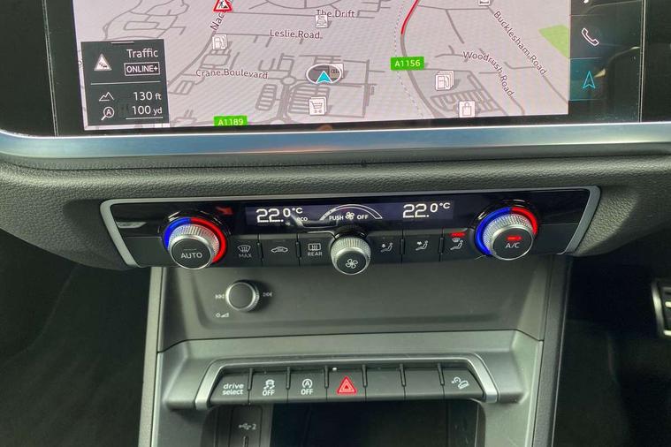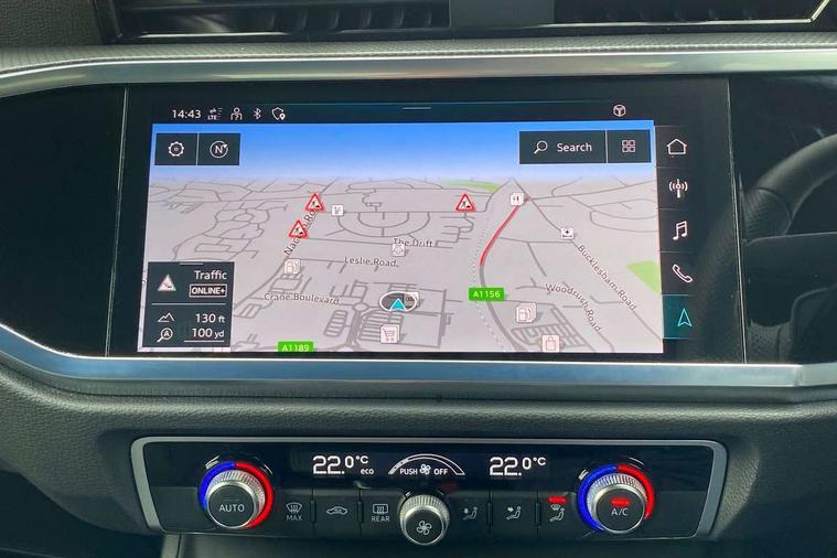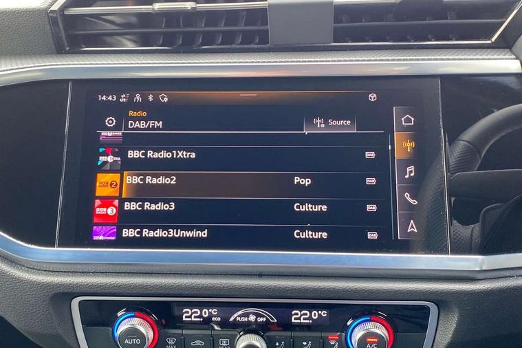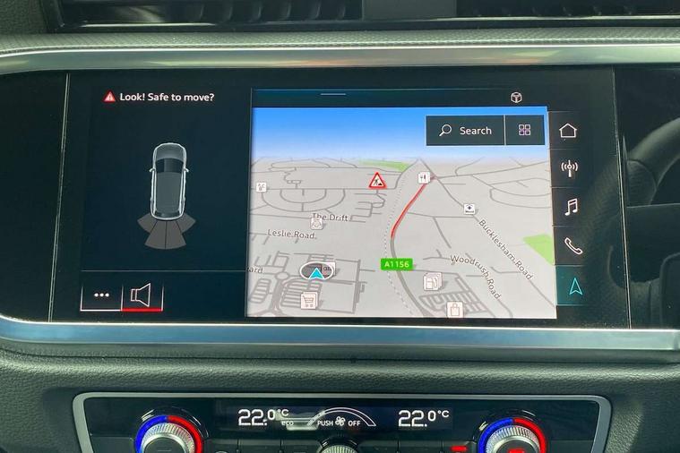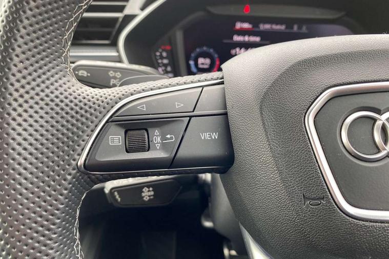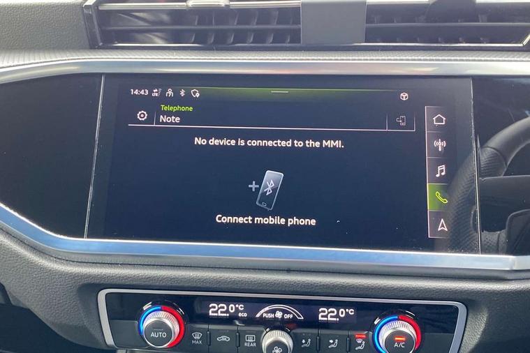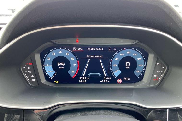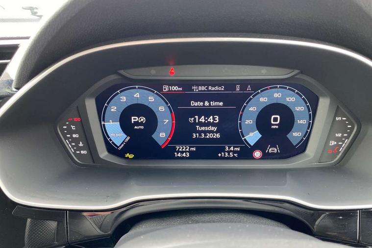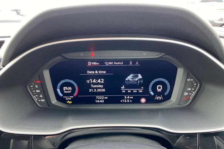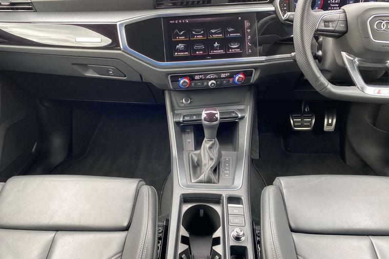 Amazon alexa Integration, Audi connect safety and service, Audi drive select, Audi lane departure warning, Audi smartphone interface includes wireless Apple carplay/Android Auto, Audi Virtual Cockpit - 10.25" display, Bluetooth interface, Camera based traffic sign recognition, Distraction and Fatigue warning, Legal emergency call, MMI Navigation Plus with high resolution 10.1 inch touchscreen colour display, Power operated tailgate, Progressive steering, Service interval indicator, Start stop system with recuperation, Voice control system with natural language interaction, Sports suspension, 2 USB-C ports with charge and data functions, 6 passive loudspeakers, DAB digital radio module, Acoustic windscreen, Audi Beam uses LEDs to project the Audi logo onto the ground as you exit your Q3, Auto dimming door mirrors, Auto dimming frameless rear view mirror, Black roof rails, Electrically folding, adjustable and heated door mirrors with integrated LED side indicators and kerb view function for passenger side, Front and rear electric windows, Front fog lights, Grille vertical bars in aluminium silver/Matt, High gloss black finish B and C pillars, LED Dynamic rear indicators, LED headlights with LED daytime running lights, LED rear lights, LED third brake light, Privacy glass dark tinted rear and rear-side windows (from B-pillar backwards), Rain and light sensors, Rear diffuser grille in grained matt black, Rear diffuser strip in matt anthracite black, Rear side wing doors, Rear wiper, S line bumpers in contrasting Manhattan grey, Variable front intermittent wipers, 12V socket in rear centre console, 3 seat bench in 2nd row, 40:20:40 folding with manual adjustment for 60:40 forwards/backwards position and backrest angle, Adjustable rear seat bench/backrest with centre armrest and cupholder, Black cloth headlining, Dual zone electronic climate control, Electric lumbar support, Front and rear black floor mats with contrast stitching in rock grey, Front and rear headrests, Front centre armrest, Height and reach adjustable steering wheel, Illuminated door sill trims with S logo, ISOFIX child seat mounting for front passenger with airbag deactivation and outer rear seat including top tether attachment point for outer rear seats, Manual front seats with height adjustment, Perforated leather gearknob, Single front passenger seat, Stainless steel luggage compartment sill finisher, Stainless steel pedals, Twin leather upholstery with front sport seats + S embossing, Black styling pack - Q3, Non smoking pack - Q3, 3x3 point rear seatbelts, 6 airbags - Driver, front passenger, curtain and side windows, Audi pre-sense front with pedestrain and cyclist recognition, Electrically operated child locks on rear doors, Electromechanical parking brake, Electronic stabilisation control including ABS, ASR and EDL, Front seatbelt reminder, Hill descent control, Hill hold assist, Pre sense basic, Seatbelt monitoring, Tyre pressure warning, Warning triangle and first aid kit, Anti theft alarm, Anti theft wheel bolts, Immobiliser, Remote central locking, Aluminium look interior elements, Detail dashboard around MMI touch colour display in glass look, black with surround in aluminium look, Leatherette door armrest, Piano black inlay,