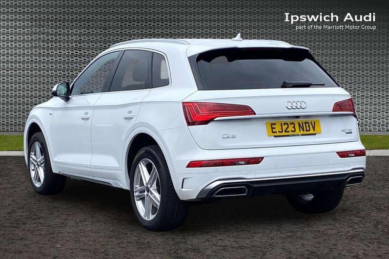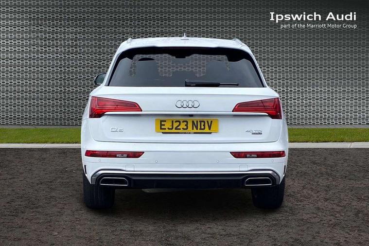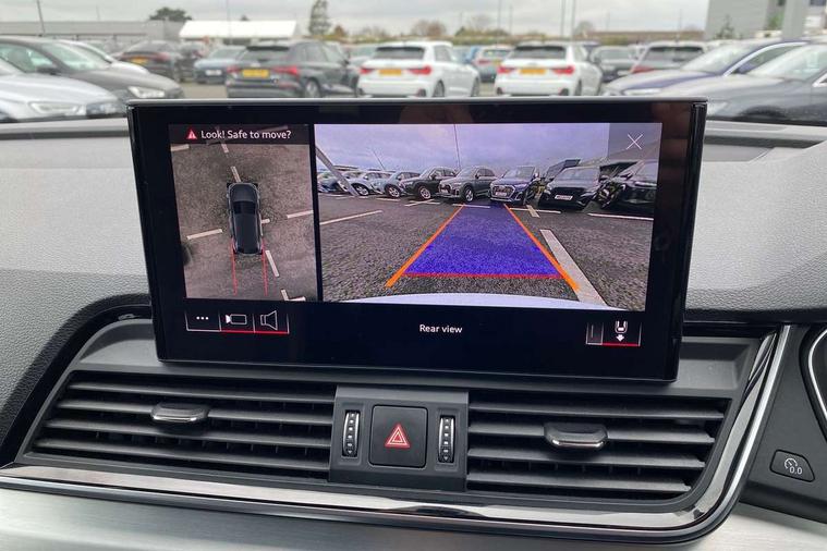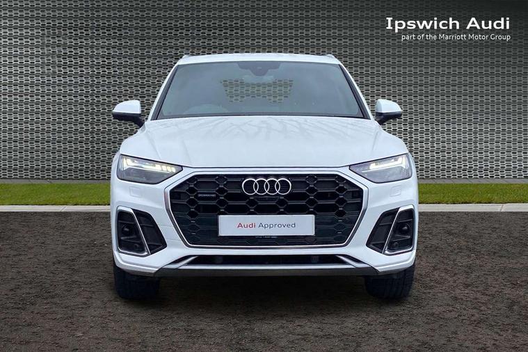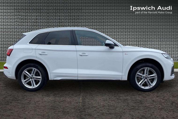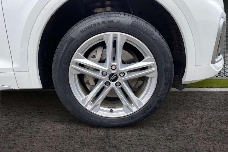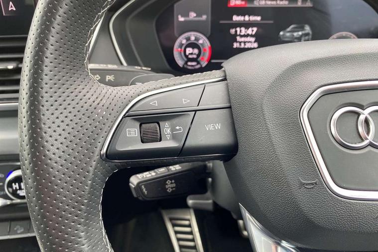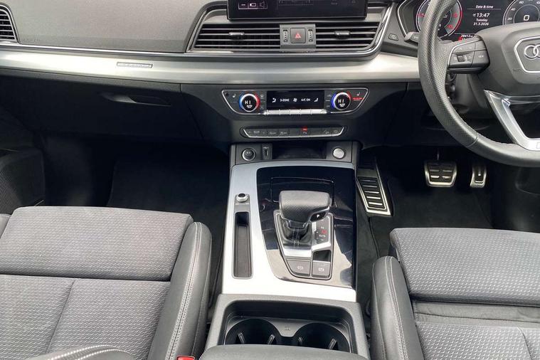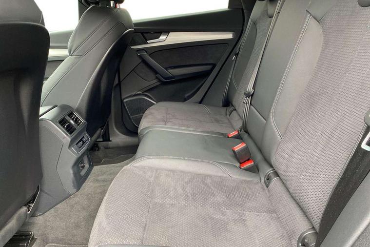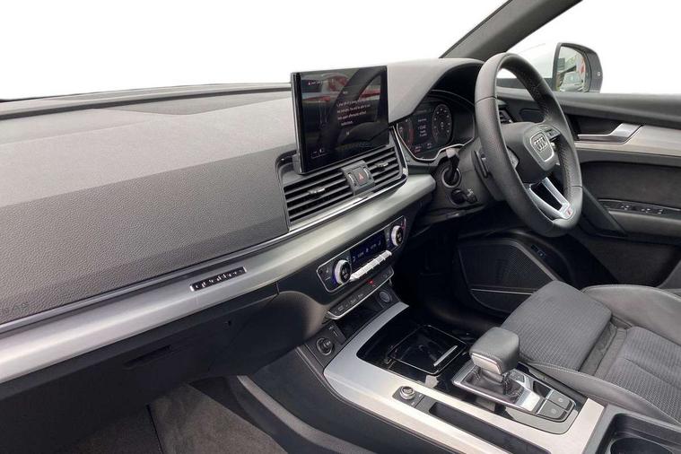 Acoustic front and rear parking sensor, Audi connect safety and service (e-call), Audi drive select, Audi virtual cockpit plus with 12.3" screen and three different layout designs, Audi wireless smartphone interface, Automatic start-stop system with coasting functionality and efficiency programme, Bluetooth interface, Camera based traffic sign recognition, Electro - mechanical power assisted steering, Lane departure warning, MMI navigation plus with 10.1" touch screen, Power tailgate, Reversing camera, Service interval indicator, Voice control system with Audi hotword activation "Hey Audi", Diesel particulate filter, Quattro on demand, S line sports suspension, 2 x USB charging port with aux input socket, 8 loudspeakers, DAB Digital radio, 3rd brake light, Acoustic windscreen, Aluminium roof rails, Auto dimming door mirrors, Auto dimming frameless rear view mirror, Automatic headlight adjustment, Automatic headlights and windscreen wipers, Body colour bumpers, Body colour door mirrors, Body colour rear diffuser with matt aluminium silver surrounds, Body colour underbody protection, Chrome plated exhaust trims, Daytime running lights, Door sills in Selenite silver, Electric adjustable/heated/folding door mirrors, Front air inlet surrounds in aluminium, Front and rear electric windows, Front radiator grille in honeycomb design, LED headlights and LED tail lights, Loading edge protection in stainless steel, Lower bumpers painted in contrast Manhattan grey, Rear chrome trim strip below lights, Rear privacy glass and rear side windows, Rear side wing doors, Rear wiper, Roof bars, S Line badges on the front wing panels, S Line front and rear bumpers, S Line rear spoiler, S Line side skirts, 3 rear headrests, 3 spoke leather multifunction steering wheel with S badging perforated leather grips, Black cloth headlining, Comfort front centre armrest, Contrast stitching on seats, steering wheel and gear lever gaiter, Deluxe 3 zone electronic climate control, Front head restraints, Front sport seats with S embossed logo, Front/rear floor mats, Gear lever in black leather, Heated front seats, Height/reach adjustable steering column, Illuminated door sill trims with S logo, Luggage compartment cover, Manual seat adjustment with 4-way electric lumbar support, Single front passenger seat, Stainless steel pedals, Sunvisors with vanity mirrors, High gloss pack - Q5, LED interior light pack - Q5, 3 point seatbelts on all seats, 6 airbags - Driver, front passenger, curtain and side airbags, Attention and drowsiness assist, Electrically operated child locks on rear doors, Electromechanical parking brake, Electronic stabilisation control including ABS, ASR and EDL, First aid kit with warning triangle and vests, Front passenger airbag deactivation, Hill descent control, Hill hold assist, ISOFIX child seat mounting for front passenger seat and ISOFIX child seat mounting with Top Tether for outer rear seats, Multi collision brake assist, Pop-up bonnet for pedestrian protection, Pre sense city, Seatbelt monitoring, Tyre pressure warning, Anti theft alarm, Anti-theft wheel bolts, Remote central locking, Remote control key with SAFELOCK and keyless go, Air vents inserts and centre console in gloss black, Matt brushed aluminium inlays, Tool kit, Tyre repair kit,