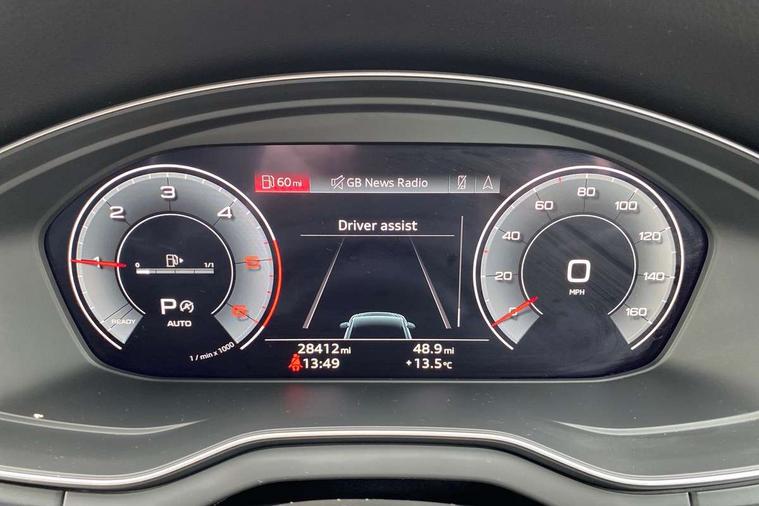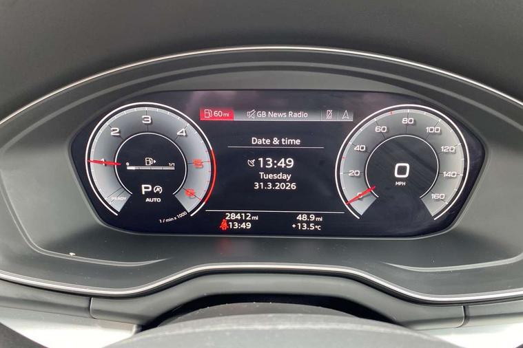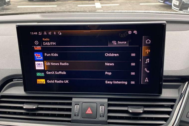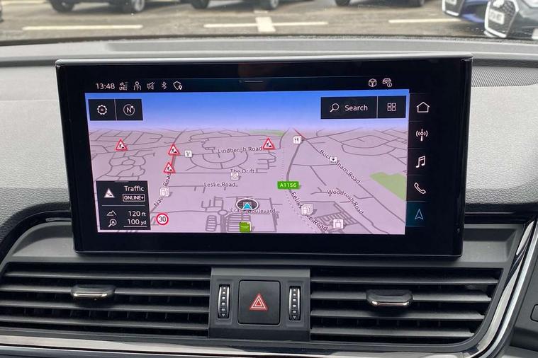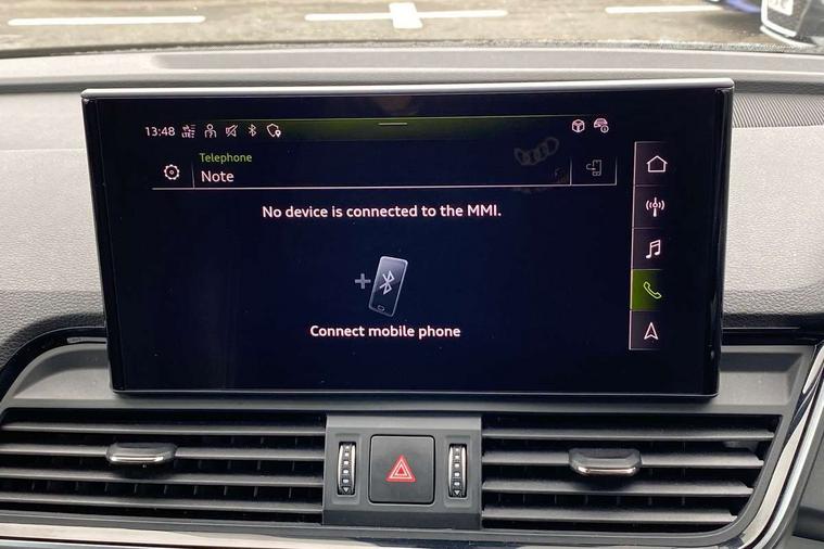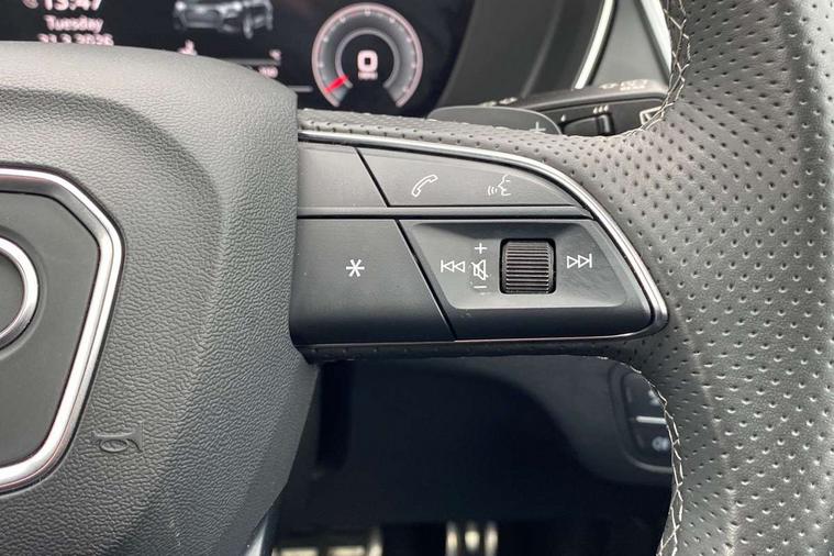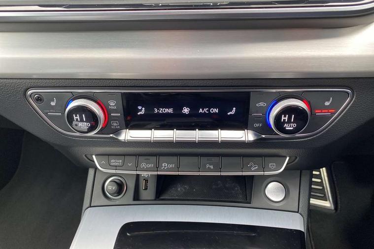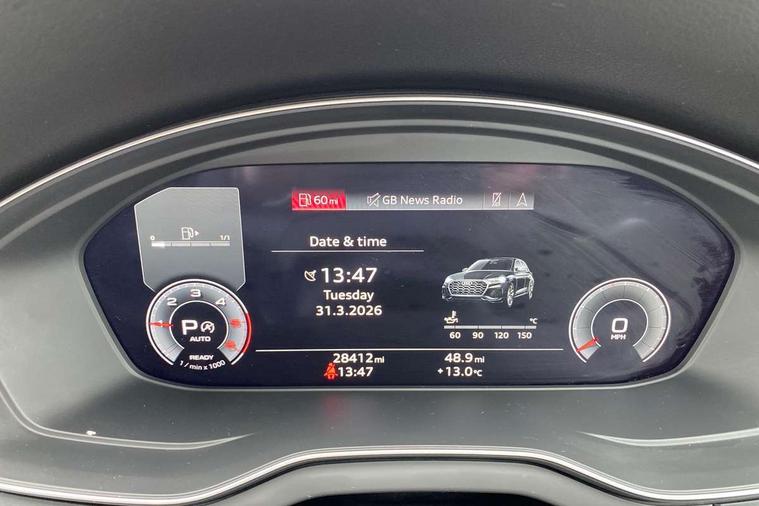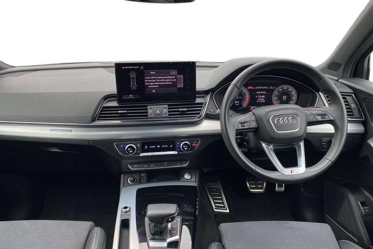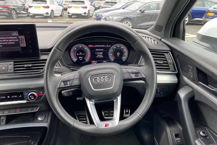 Acoustic front and rear parking sensor, Audi connect safety and service (e-call), Audi drive select, Audi virtual cockpit plus with 12.3" screen and three different layout designs, Audi wireless smartphone interface, Automatic start-stop system with coasting functionality and efficiency programme, Bluetooth interface, Camera based traffic sign recognition, Electro - mechanical power assisted steering, Lane departure warning, MMI navigation plus with 10.1" touch screen, Power tailgate, Reversing camera, Service interval indicator, Voice control system with Audi hotword activation "Hey Audi", Diesel particulate filter, Quattro on demand, S line sports suspension, 2 x USB charging port with aux input socket, 8 loudspeakers, DAB Digital radio, 3rd brake light, Acoustic windscreen, Aluminium roof rails, Auto dimming door mirrors, Auto dimming frameless rear view mirror, Automatic headlight adjustment, Automatic headlights and windscreen wipers, Body colour bumpers, Body colour door mirrors, Body colour rear diffuser with matt aluminium silver surrounds, Body colour underbody protection, Chrome plated exhaust trims, Daytime running lights, Door sills in Selenite silver, Electric adjustable/heated/folding door mirrors, Front air inlet surrounds in aluminium, Front and rear electric windows, Front radiator grille in honeycomb design, LED headlights and LED tail lights, Loading edge protection in stainless steel, Lower bumpers painted in contrast Manhattan grey, Rear chrome trim strip below lights, Rear privacy glass and rear side windows, Rear side wing doors, Rear wiper, Roof bars, S Line badges on the front wing panels, S Line front and rear bumpers, S Line rear spoiler, S Line side skirts, 3 rear headrests, 3 spoke leather multifunction steering wheel with S badging perforated leather grips, Black cloth headlining, Comfort front centre armrest, Contrast stitching on seats, steering wheel and gear lever gaiter, Deluxe 3 zone electronic climate control, Front head restraints, Front sport seats with S embossed logo, Front/rear floor mats, Gear lever in black leather, Heated front seats, Height/reach adjustable steering column, Illuminated door sill trims with S logo, Luggage compartment cover, Manual seat adjustment with 4-way electric lumbar support, Single front passenger seat, Stainless steel pedals, Sunvisors with vanity mirrors, High gloss pack - Q5, LED interior light pack - Q5, 3 point seatbelts on all seats, 6 airbags - Driver, front passenger, curtain and side airbags, Attention and drowsiness assist, Electrically operated child locks on rear doors, Electromechanical parking brake, Electronic stabilisation control including ABS, ASR and EDL, First aid kit with warning triangle and vests, Front passenger airbag deactivation, Hill descent control, Hill hold assist, ISOFIX child seat mounting for front passenger seat and ISOFIX child seat mounting with Top Tether for outer rear seats, Multi collision brake assist, Pop-up bonnet for pedestrian protection, Pre sense city, Seatbelt monitoring, Tyre pressure warning, Anti theft alarm, Anti-theft wheel bolts, Remote central locking, Remote control key with SAFELOCK and keyless go, Air vents inserts and centre console in gloss black, Matt brushed aluminium inlays, Tool kit, Tyre repair kit,