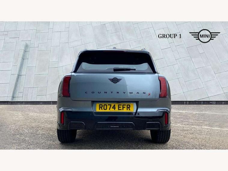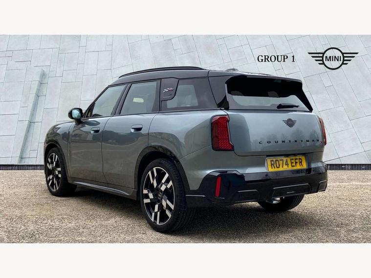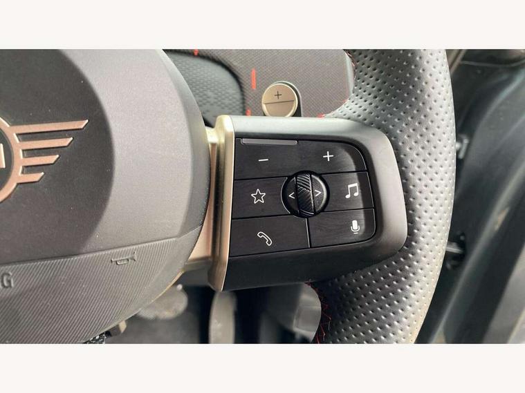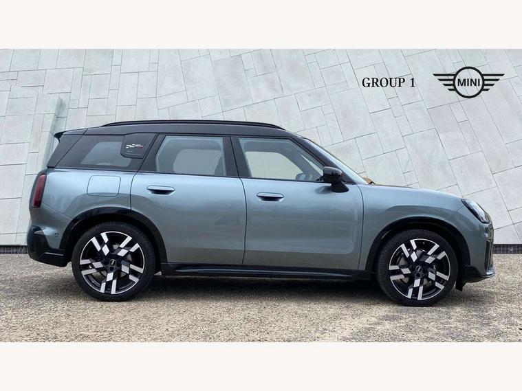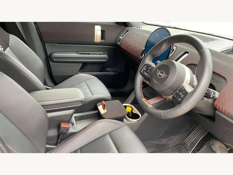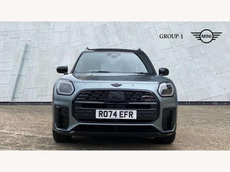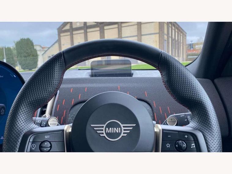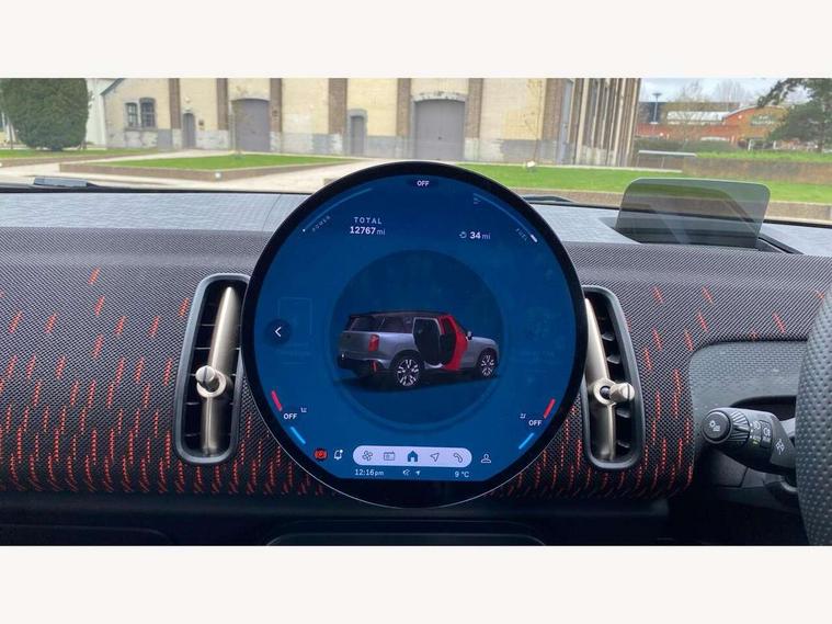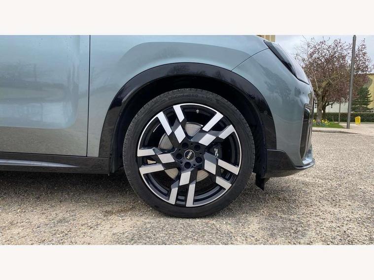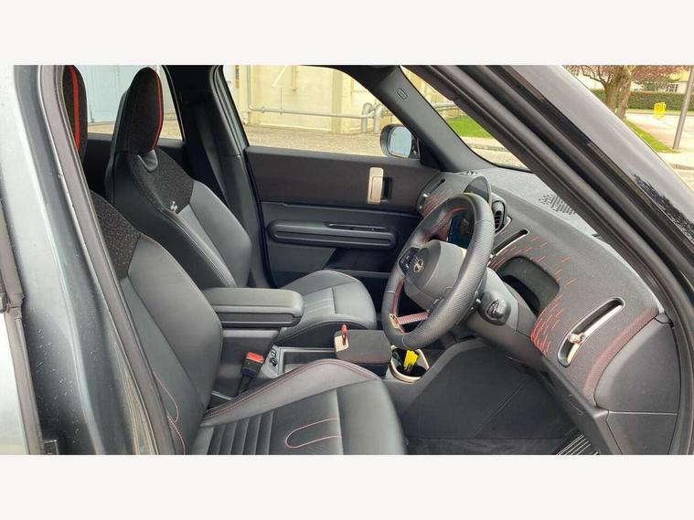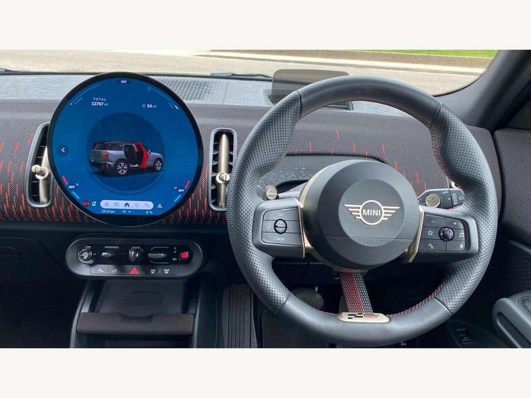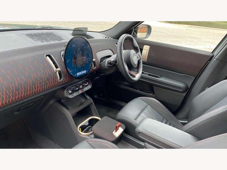 Bluetooth connection, Circular OLED Screen, Compatible mobile phone bluetooth with audio streaming, Cruise Control (DCC), Digital dashboard display, Driving assistant, Driving Assistant Plus Preparation, E-call, Electro-mechanical speed dependant steering assistance, MINI Experience Modes, MINI Head up display, Mini navigation system, MINI TeleServices, Parking assistant in camera and ultrasound based assistance system, rear view camera, parking aid and distance control, Adaptive suspension, Double clutch sports transmission, Larger capacity fuel tank, 6 speakers, DAB Digital radio, Personal eSim, Auto tailgate, Electric adjustable heated door mirrors, Front and rear apron, Front and rear electric windows, Heated rear window, High beam assistant, High gloss hexagonal patterned grille surround, Interior rear-view mirror with automatic anti-dazzle function, LED daytime running lights, LED headlights with extended contents including Adaptable light signatures, LED rear lights, LED third brake light, Rain sensor with auto headlights, Rear roof spoiler with airblades, Rear side wing doors, Rear window wiper, Roof rails, 3 Seat sliding rear bench in 2nd row, 60/40 split rear bench seat, Anthracite headliner, Auto air conditioning, Driver and front passenger seat heating, Floor mats, Front armrest, Front headrests, Heated steering wheel, Height and length steering column adjustment, JCW Front sports seats, Lidded storage box in Black/Red knit, Luggage compartment separating net, Perforated Vescin steering wheel, Rear headrests, Seat adjustment for rear seats, Single front passenger seat, Sunvisors with vanity mirrors, Vescin/Cloth upholstery, Wireless charging tray, Interior and exterior mirror package - Mini Countryman, 3x3 point rear seat belts, 6 Airbags - front, side, head and seat belt tensioners, ABS, Brake calipers in Black with JCW badge, DSC - Dynamic Stability Control, Electronic handbrake, Electronic Stability Programme (ESP), Front ISOFIX (iSize), Hill descent control, Hill hold assist, Hill start assist, JCW Sport Brakes, Manual rear child locks, Traction control, Tyre pressure monitoring system, Warning triangle, Alarm system with tilt sensor, monitoring doors, bonnet interior and tailgate, Auto drive away locking, Comfort access system, Deadlocking function, Electronic vehicle immobiliser, Locking wheel bolts, Remote control locking, Start/stop toggle with keyless go, JCW Black/Red dashboard knit, MINI Mobility Kit,