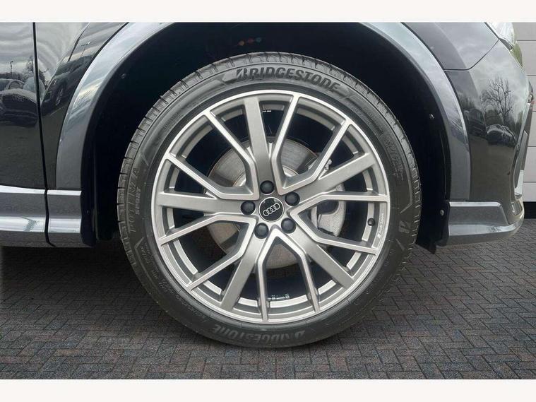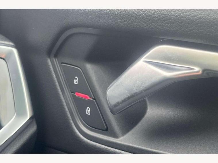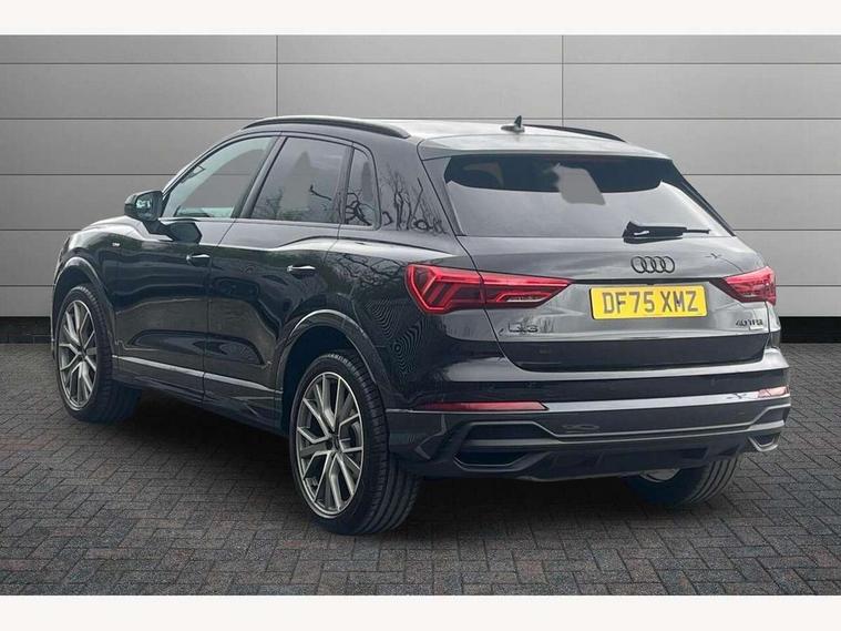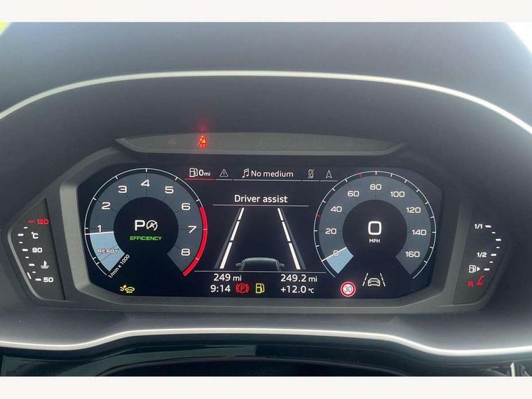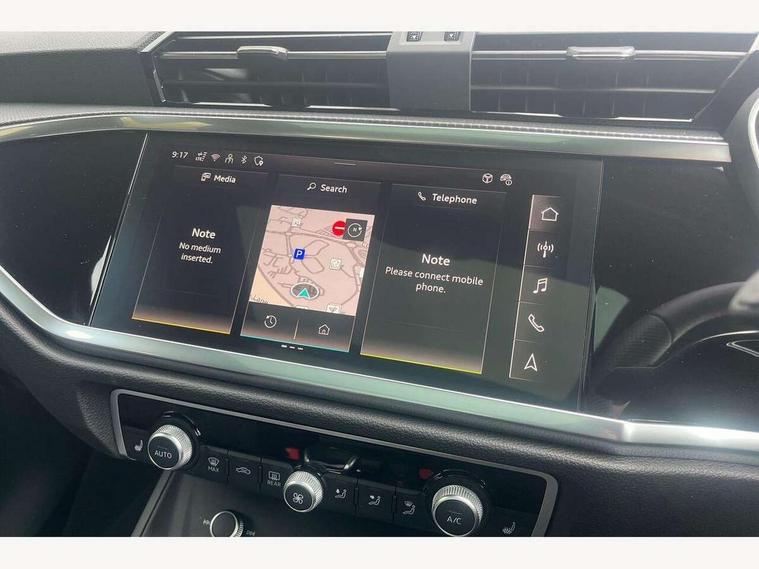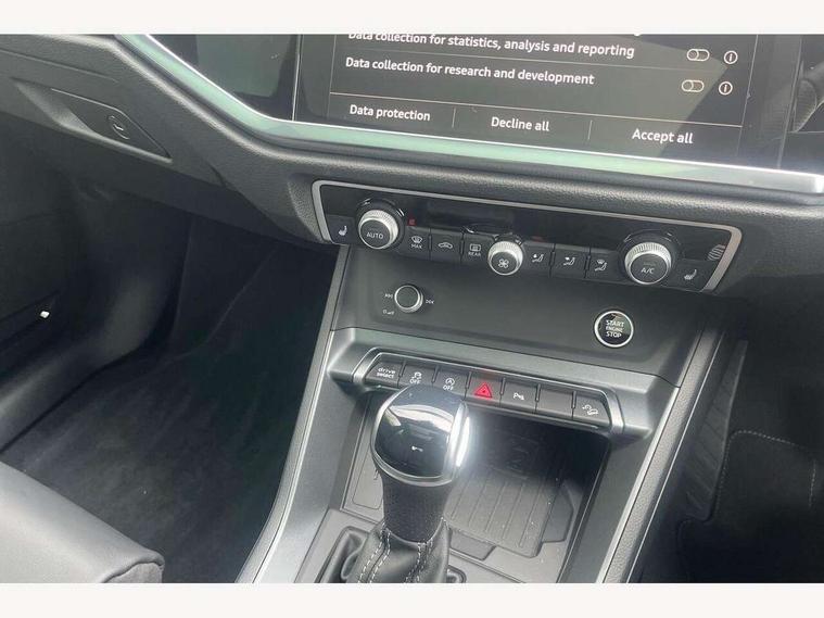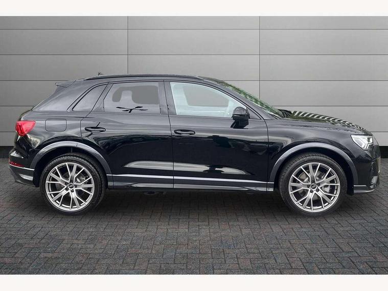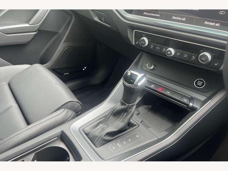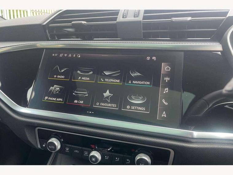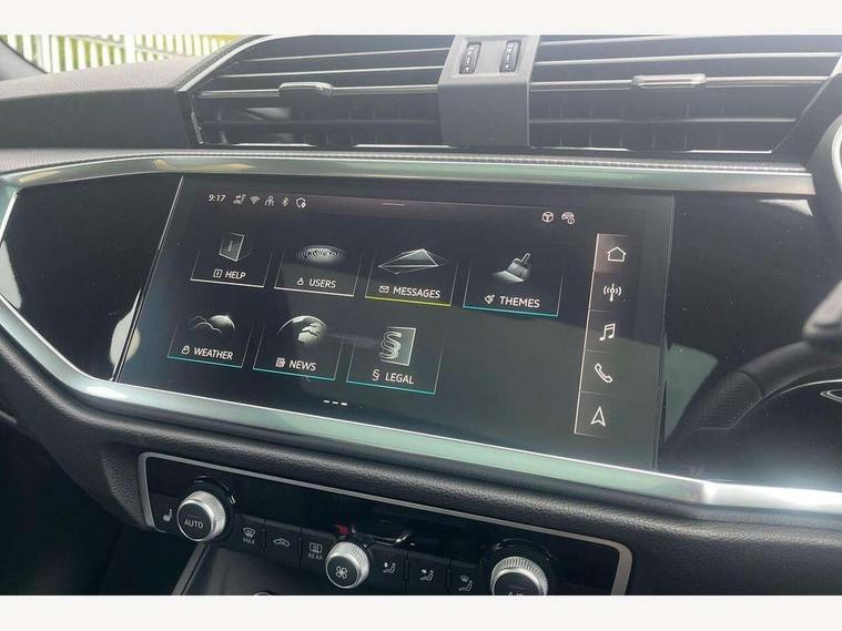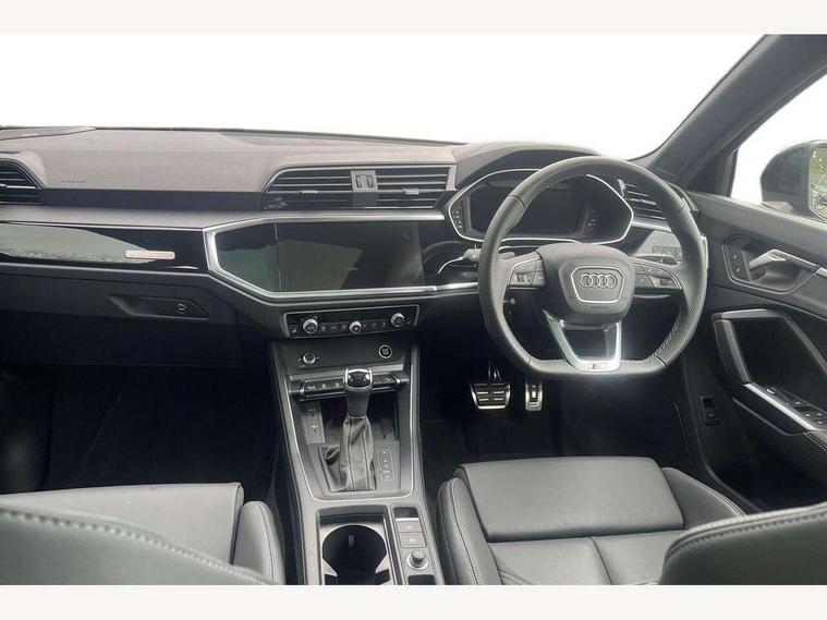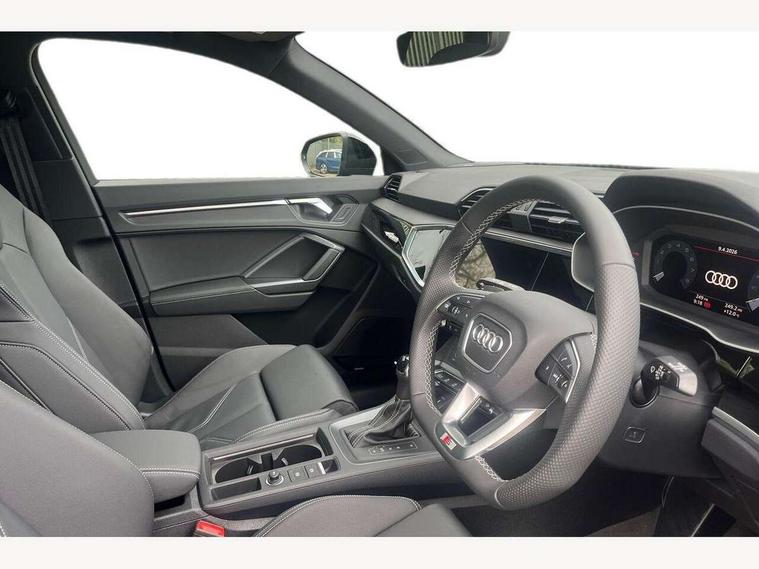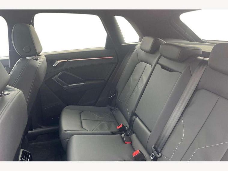 Amazon alexa Integration, Audi connect safety and service, Audi drive select, Audi lane departure warning, Audi Virtual Cockpit - 10.25" display, Bluetooth interface, Camera based traffic sign recognition, Distraction and Fatigue warning, Legal emergency call, MMI Navigation Plus with high resolution 10.1 inch touchscreen colour display, Power operated tailgate, Progressive steering, Service interval indicator, Smartphone interface includes wireless Apple carplay/Android Auto, Start stop system with recuperation, Voice control system with natural language interaction, Sports suspension, 2 USB-C ports with charge and data functions, 6 passive loudspeakers, DAB digital radio module, Acoustic windscreen, Anthracite black radiator grille, Audi Beam uses LEDs to project the Audi logo onto the ground as you exit your Q3, Auto dimming door mirrors, Auto dimming frameless rear view mirror, Black roof rails, Electrically folding, adjustable and heated door mirrors with integrated LED side indicators and kerb view function for passenger side, Front and rear electric windows, Front fog lights, Grille vertical bars in aluminium silver/Matt, High gloss black finish B and C pillars, LED Dynamic rear indicators, LED headlights with LED daytime running lights, LED rear lights, LED third brake light, Privacy glass dark tinted rear and rear-side windows (from B-pillar backwards), Rain and light sensors, Rear diffuser grille in grained matt black, Rear diffuser strip in matt anthracite black, Rear side wing doors, Rear wiper, S line bumpers in contrasting Manhattan grey, Variable front intermittent wipers, 12V socket in rear centre console, 3 seat bench in 2nd row, 40:20:40 folding with manual adjustment for 60:40 forwards/backwards position and backrest angle, Adjustable rear seat bench/backrest with centre armrest and cupholder, Black carpet mats, Black cloth headlining, Dual zone electronic climate control, Electric lumbar support, Front and rear black floor mats with contrast stitching in rock grey, Front and rear headrests, Front centre armrest, Height and reach adjustable steering wheel, Illuminated door sill trims with S logo, ISOFIX child seat mounting for front passenger with airbag deactivation and outer rear seat including top tether attachment point for outer rear seats, Luggage compartment sill protection in stainless steel, Manual front seats with height adjustment, Perforated leather gearknob, Single front passenger seat, Stainless steel pedals, Twin leather upholstery with front sport seats + S embossing, Black styling pack - Q3, Non smoking pack - Q3, 3x3 point rear seatbelts, 6 airbags - Driver, front passenger, curtain and side windows, Audi pre-sense front with pedestrain and cyclist recognition, Electrically operated child locks on rear doors, Electromechanical parking brake, Electronic stabilisation control including ABS, ASR and EDL, Front seatbelt reminder, Hill descent control, Hill hold assist, Pre sense basic, Seatbelt monitoring, Tyre pressure warning, Warning triangle and first aid kit, Anti theft wheel bolts, Immobiliser, Remote central locking, Thatcham approved category 1 anti theft alarm, Aluminium look interior elements, Detail dashboard around MMI touch colour display in glass look, black with surround in aluminium look, Leatherette door armrest, Piano black inlay,