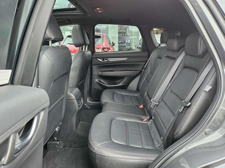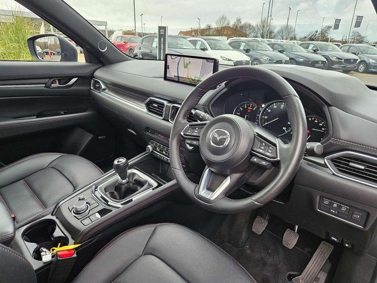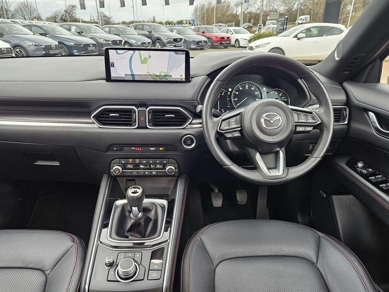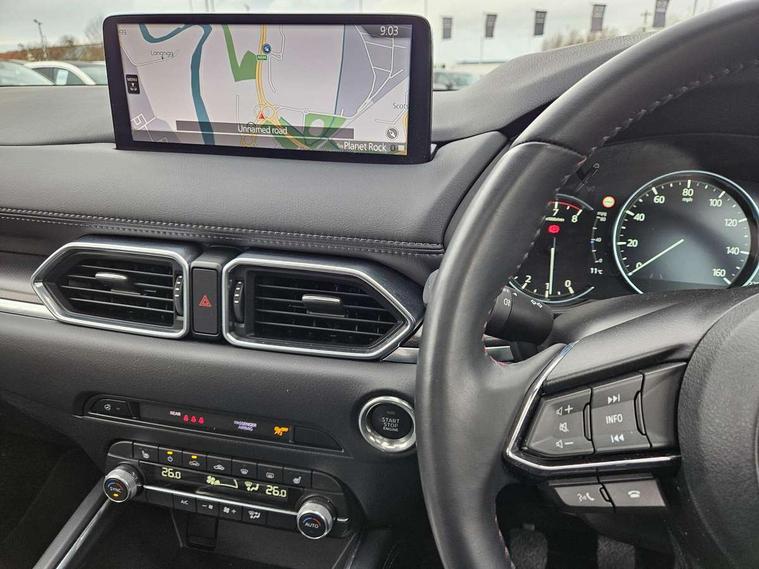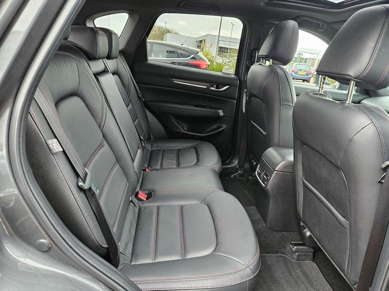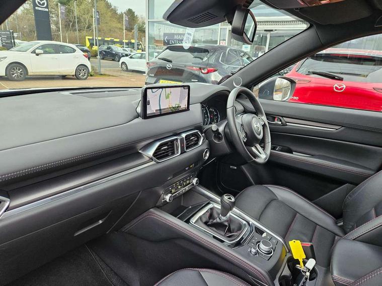 10.25" display with Mazda Connect infotainment, 7" colour TFT display, Advanced blind spot monitoring, Bluetooth connectivity with voice control, Collision prevention assist, Connected services, Cruising Traffic Support, Electric power steering, Emergency stop signalling system, Engine start/stop button, Forward collision warning, Front and rear parking sensors, Integrated navigation system, Intelligent speed assist, Lane departure warning system, Lane keep assist, Power liftgate, Qi wireless phone charging, Radar cruise control, Rear cross traffic alert, Reversing camera, Service indicator, Traffic sign recognition (TSR), Trip computer, Windscreen projected colour active driving display (HUD) with memory, Wireless apple car play/android Auto, Cylinder Deactivation, i-stop, AM/FM radio, Bluetooth audio streaming, Bose premium sound system with 10 speakers, DAB Digital radio, Multimedia Commander including separate volume dial, Steering wheel mounted audio controls, Adaptive front lighting system, Auto dimming rear view mirror, Automatic headlights, Black honeycomb door trim decoration panel, Black honeycomb interior decoration panel, Body colour roof spoiler, Coming/leaving home lighting function, Door mirror integrated indicators, Dual large chrome tailpipes, Dusk sensitive headlamps, Electric front/rear windows with one touch auto up/down, Front grille in gloss black finish, Front grille in gloss black with red accent + gloss black signature wing, Gloss black B and C pillars garnish, Gloss black door mirrors, Gloss black front and rear lower bumper mouldings, Gloss black tire arch and side mouldings, High beam assist, Intermittent rear wash/wipe, LED auto levelling, LED daytime running lights, LED front fog lights, LED Headlights, LED third brake light, Power folding and heated door mirrors, Power tilt/slide sunroof, Privacy glass (rear side windows only), Rain sensing front wipers, Rear side wing doors, Red front grille accent, Red stitching and accents on door trim, knee pad, console lid, steering wheel, shift boots, Scuff plates, Shark fin antenna, Signature LED rear combination lights, Variable intermittent front wash/wipe, Windscreen wiper de-icer, 12v electrical power outlet, 3 seat bench in 2nd row, 3 stage heated front seats, 40:20:40 Karakuri fold-flat seat system, 6 way electric adjustable passenger seat, 8 way electric driver seat with lumbar support + memory, Black roof lining, Cargo room flat floor board with waterproof undertray, Driver seat power slide, recline and height adjustment, Driver, Front passenger and two rear grab handles with coat hooks, Driver/passenger front seatback pockets, Driver/passenger sunvisors + illuminated vanity mirrors (drivers with ticket holder), Dual zone climate control, Folding centre armrest with 2 cup holders, Front and rear door pockets, Front centre storage with two cupholders, Front passenger seat power slide, recline and height adjustment, Gear shift indicator, Heated steering wheel, Humidity sensor, Illuminated glovebox, Interior dome light with integral spotlight, ISOFIX child seat anchorage points attached on outer rear seats, Karakuri tonneau cover, Leather upholstery, Leather wrapped steering wheel and gear knob, Luggage compartment LED lighting, Luggage compartment power outlet, Rear air vents, Rear headrests, Rear seat recline, Roof mounted sunglasses holder, Single front passenger seat, Three height adjustable head restraints, Tilt/height adjustable steering wheel, USB Connectivity (2x front Type-C, 2x rear Type-B), White interior LED illumination lighting, 3 point front seatbelts with pre-tensioners, 3 rear 3 point seatbelts, ABS, Advanced Smart City Brake Support - SCBS, Child locks on rear doors, Driver and front passenger side airbags, DSTC-Dynamic Stability and Traction Control, Dual front airbags, Electronic brake force distribution, Electronic parking brake with auto hold, ESP, Front and rear curtain airbags, Front passenger airbag deactivation, G-Vectoring control, Hill hold assist, Seatbelt reminder front and rear, Single stage passenger airbags, Smart brake support with forward obstruction warning, Tyre pressure monitoring system, Automatic door locking when moving off, Deadlock, Immobiliser, Power door locks, Remote central locking, Smart keyless entry, Thatcham Cat.1 alarm, 19" Black alloy wheels, Tyre repair kit,