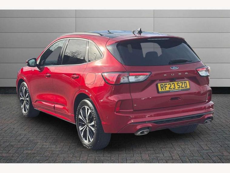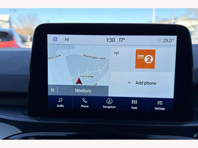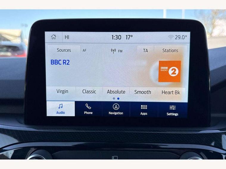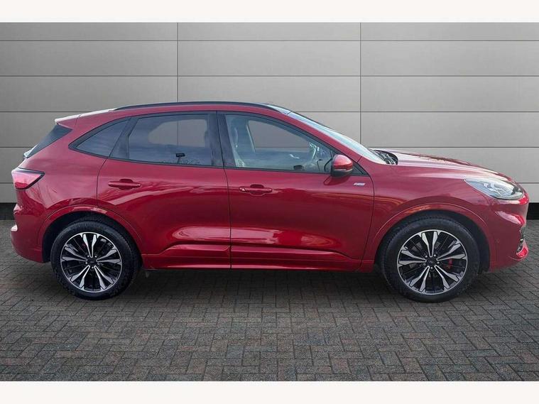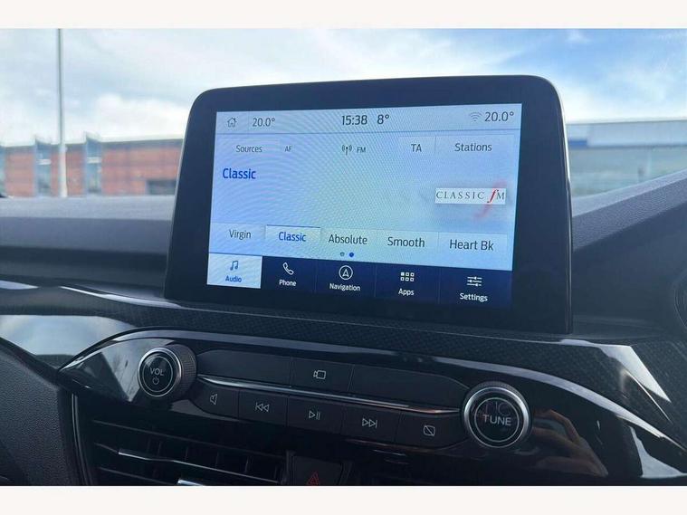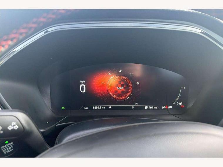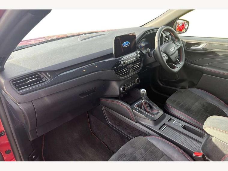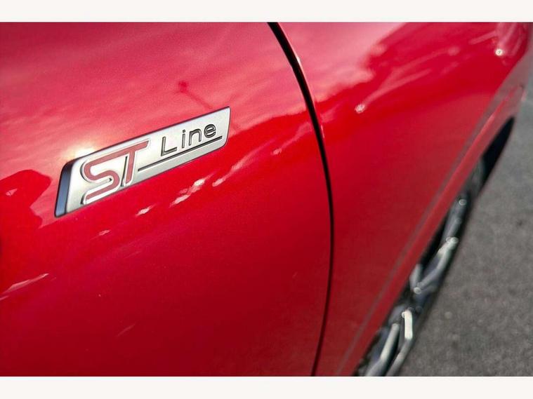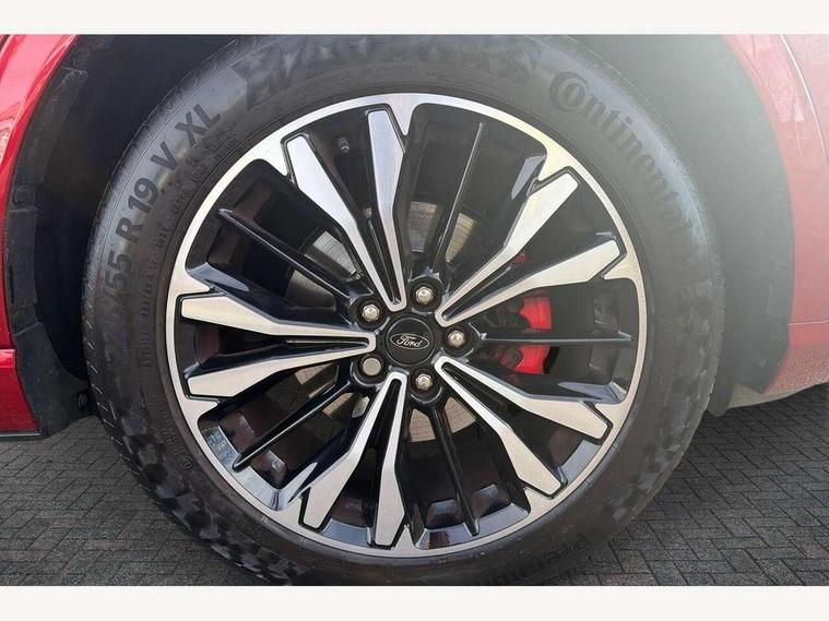 12.3" digital colour instrument cluster, Ford easy fuel, Ford SYNC 3 with 8" TFT LCD touchscreen, App Link, andriod auto/apple carPlay, emergency assistance and navigation with Ford pass connect, Front and rear parking sensors, Hands free power tailgate, Lane keeping aid with lane departure warning, Power assist steering, Rear view camera, Selectable drive modes, Service interval indicator, Sports suspension, Twist beam rear suspension, B&O premium audio system with 10 speakers and subwoofer, 2 USB ports, DAB radio/CD, Auto headlamps with high and low beam, Black roof rails, Body colour bumpers, Day/night rear view mirror, Front LED fog lamps, Large rear roof spoiler, LED daytime running lights, LED rear lights, Power folding, electrically adjustable and heated door mirrors with puddle lights, Power front/rear windows with global close, Power opening panoramic roof, Quickclear heated windscreen, Rain sensing wipers, Rear privacy glass, Rear side wing doors, Rear wiper, ST Line body styling kit with unique front and rear fascia and bumper, rear painted diffuser, front painted skid plates, dark mesh upper grille, ST Line front scuff plates, Third brake light, Twin exhausts, 2nd row sliding seats with 60:40 split, Alloy pedals, Centre console with electronic parking brake, Dark headlining and pillars, Electronic automatic temperature control (EATC), Flat bottomed leather steering wheel in sensico with red stitching, Front and rear head restraints, Heated passenger and driver seats, Heated rear seats, Heated steering wheel, Partial premium touch Sensico with black cloth inserts and red stitching, Rear centre head restraint, Single front passenger seat, Sports seats, ST Line front and rear floor mats, ST Line gear knob, 3x3 point rear seatbelts, Airbags - front driver/passenger, front and rear curtain, Drivers knee airbag, Electronic stability control (ESC) and ABS, Ford MyKey Gen 2 safety system, Manual child proof rear door locks, Post collision braking, Pre collision assist with autonomous emergency braking, Rear seat Occupancy alert, Red brake calipers, Tyre pressure monitoring system, Engine immobiliser, Keyless entry and Ford power start button (Keyless start), Locking wheel nuts, Remote powered central double locking doors, Thatcham category 1 alarm,