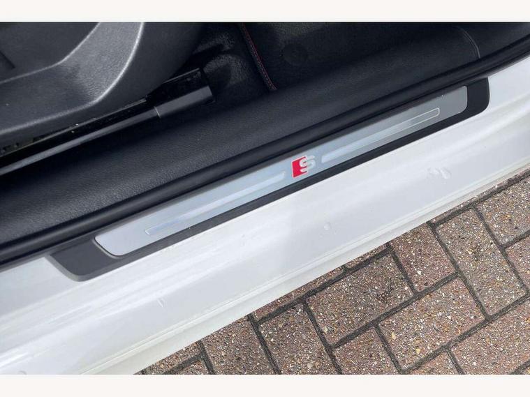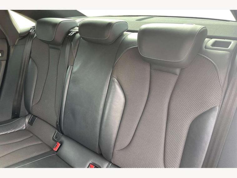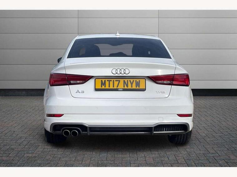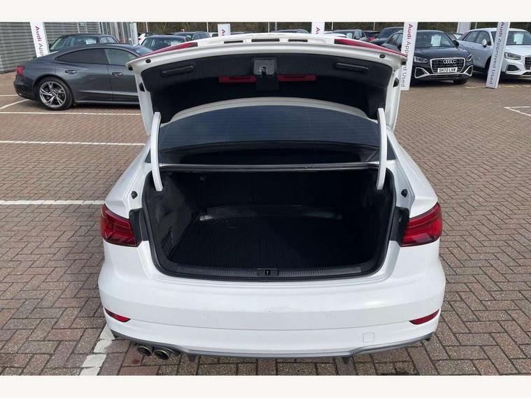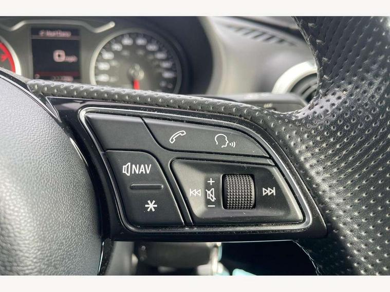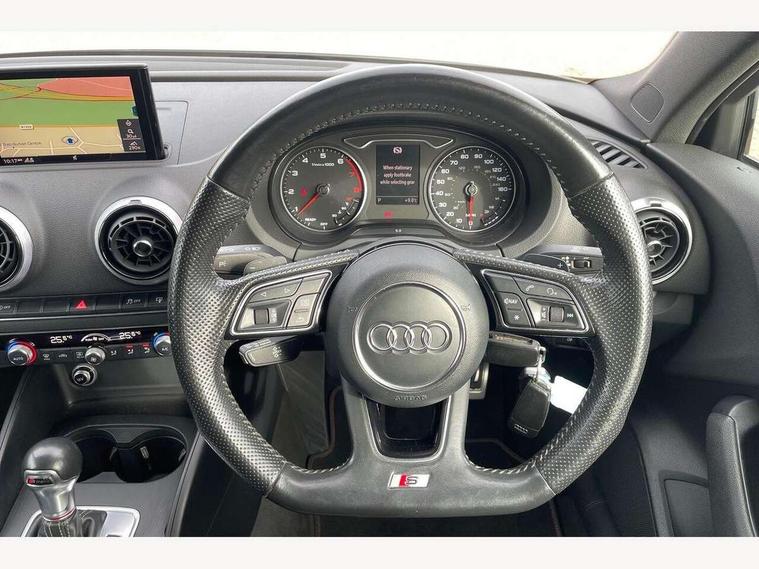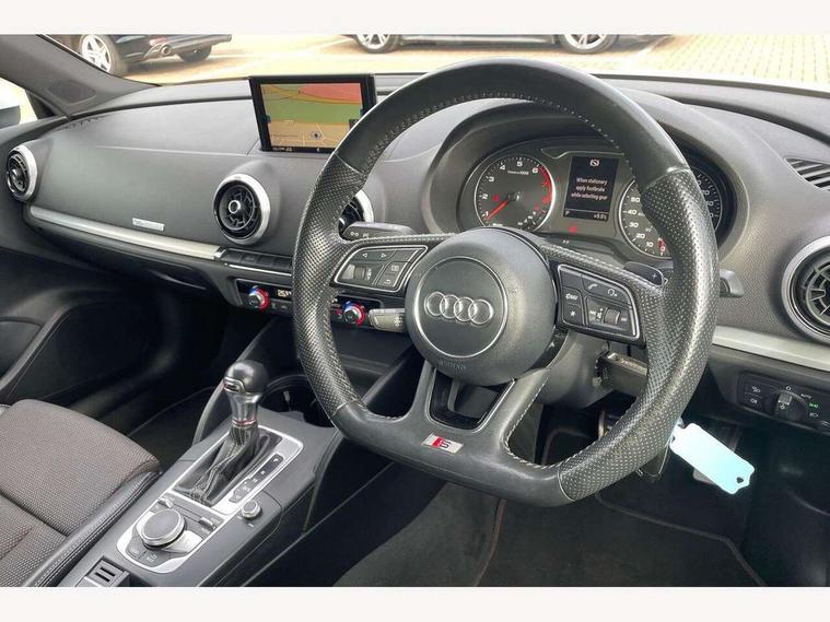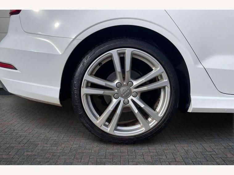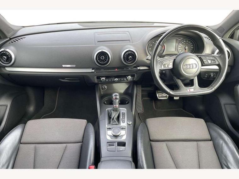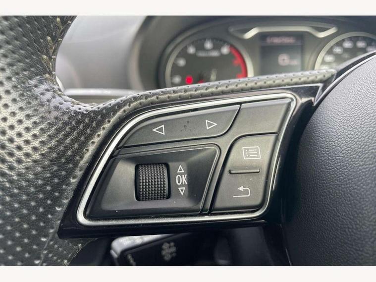 Audi connect, Audi drive select, Audi smartphone interface, Bluetooth interface, Colour driver's information system display, Service interval indicator, Voice control system, 2 USB ports, Audi music interface, Aux-in socket, DAB Digital radio, Aluminium side window trim, Automatic lights and wipers, Body colour bumpers, Body colour door mirrors with integral indicators, Body colour roof spoiler, Chrome exhaust tailpipes, Electric operated/heated door mirrors, Front and rear electric windows, Heated rear window, Heated windscreen washer jets, High gloss dark chrome radiator grille, LED daytime running lights, S Line body styling, 3 adjustable rear headrests, 3 spoke flat bottom multi-function leather steering wheel including paddle shift, 4 lashing points to secure luggage, Adjustable front armrest, Black cloth headlining, Driver/passenger sunvisors, Dual zone electronic climate control, Front and rear interior lights with delay, Front/rear floor mats, Height/depth adjustable steering column, Illuminated door sills, Illuminated glovebox, ISOFIX child seat preparation+airbag deactivation, Jack and tool kit, Stainless steel pedals, Storage compartment in centre console, Storage compartments in doors, Storage under driver's seat, LED interior light pack - A3/RS3, Light and rain sensor pack - A3 Saloon, Storage and luggage pack - A3/RS3, 3 point seatbelts on all seats, ABS/EBD, ASR, Curtain airbags, Driver and passenger side airbags, Driver/Front Passenger airbags, Drivers knee airbag, EDL, Electromechanical parking brake, ESC - Electronic Stability Control + traction control, Front passenger airbag deactivation, Seatbelt warning, Tyre pressure monitor, Warning triangle and first aid kit, Anti theft alarm, Anti-theft wheel bolts, Remote control central locking, Aluminium air vent surrounds, Aluminium trim elements, Space saver spare wheel,