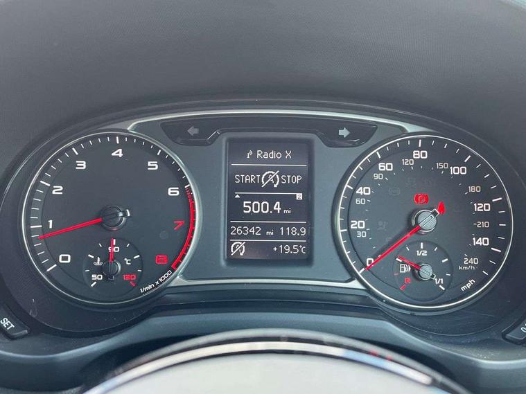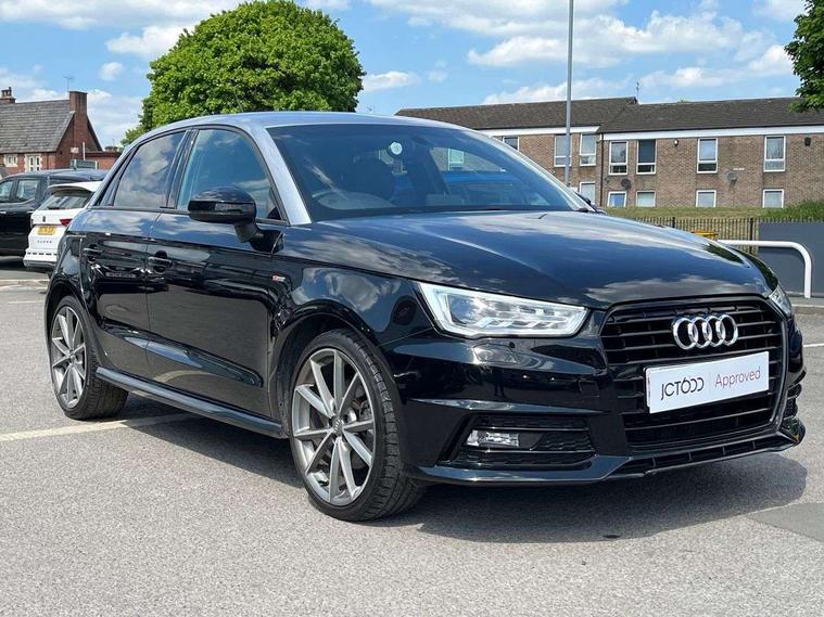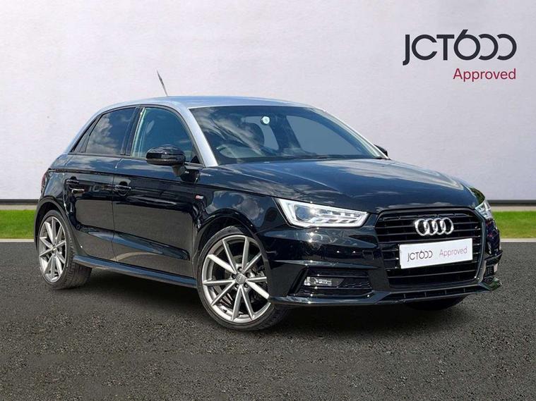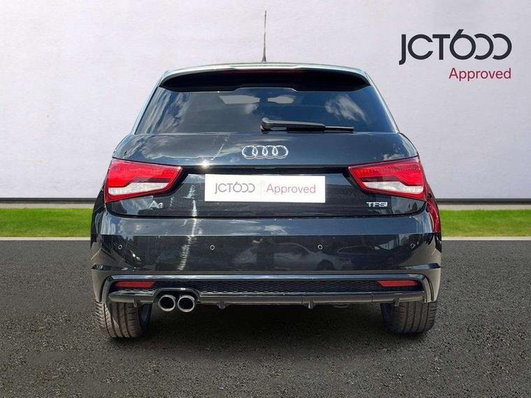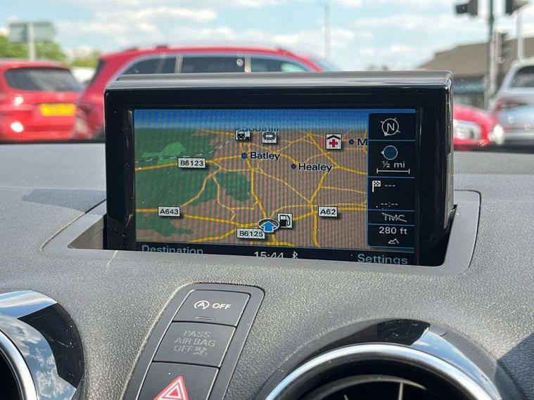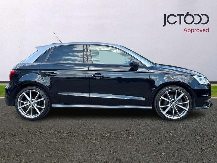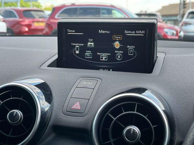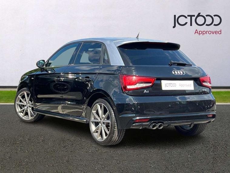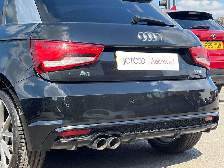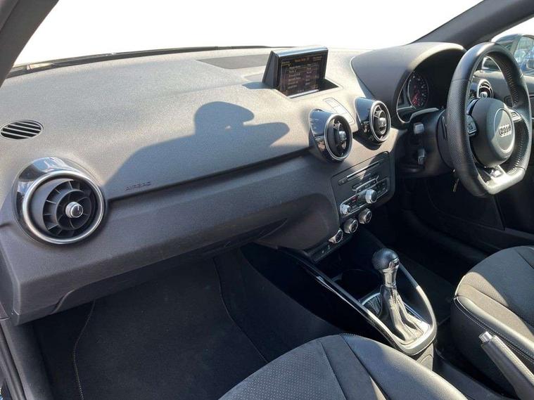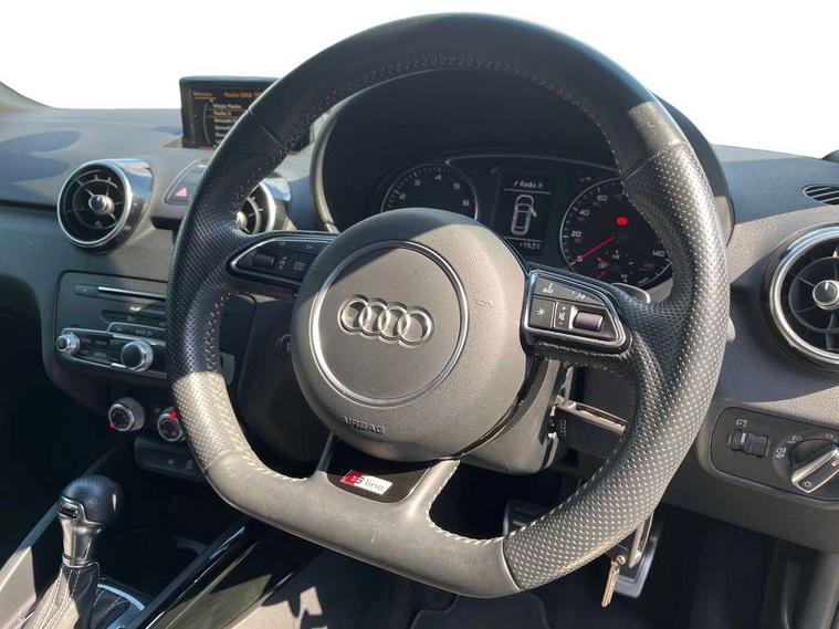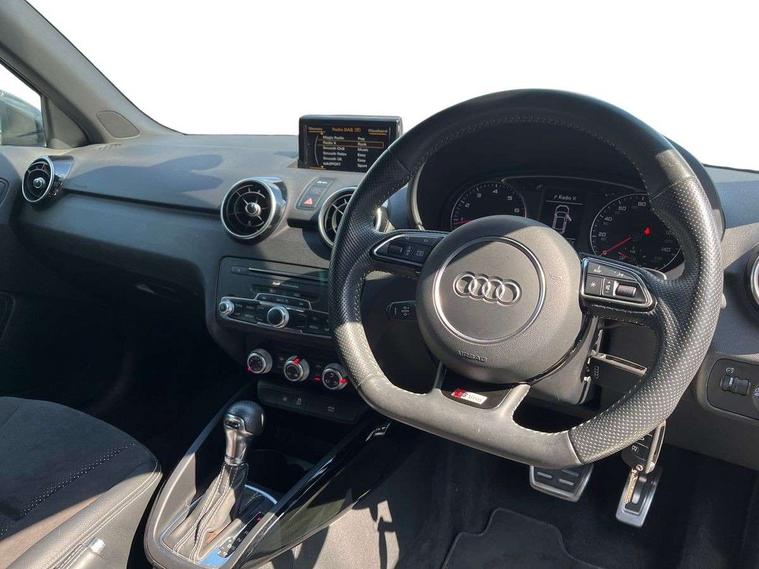 Audi drive select, Cruise control, Driver's information system, Electro-mechanical PAS, Low washer fluid indicator, Service interval indicator, Voice control system, Additional SD card reader, Audi music interface, Bluetooth audio streaming, DAB Digital radio, Adaptive brake lights, Body coloured bumpers, Body coloured door mirrors, Electric adjustable door mirrors, Electric front windows, Electric rear windows, Front fog lights, Heat insulating glass, Heated door mirrors, Heated rear windscreen, Privacy glass, Rain and light sensors, Rear diffuser, Rear wiper, Roof spoiler, S Line body styling, Twin oval high gloss black exhaust tail pipes, Xenon plus headlights including automatic headlights, LED daytime running lights, LED rear lights, dynamic range control and headlight washers, 12V Accessory socket in centre console, 3 rear seats, 3 spoke flat bottom multi-function leather steering wheel including paddle shift, Adjustable rear head restraints, Alcantara/leather upholstery, Black cloth headlining, Cupholders in centre console, Door sills trims with aluminium inlays, Electronic climate control (ECC), Front floor mats, Front head restraints, Front sports seats, Height adjustable front seats, Isofix attachments on rear seats, Jack and tool kit, Leather gear knob, Leather handbrake, Lumbar adjustment for front seats, Rake/reach adjustable steering wheel, Split folding rear seats, Stainless steel pedals, High-gloss black styling pack - A1, 3x3 point rear seatbelts, ABS/EBD, Brake assist function, Driver and passenger side airbags, Driver/Front Passenger airbags, EDL, ESP with ASR, First aid kit, Front and rear seatbelt reminder, Front passenger airbag deactivation, Head airbags, Height adjustable front seatbelts, Tyre pressure monitor, Warning triangle, Locking wheel bolts, Remote central locking with 2 remote folding keys, Thatcham category 1 alarm + immobiliser, Aluminium trim, High gloss black air vent sleeves, High gloss black centre console, Tyre repair kit,
