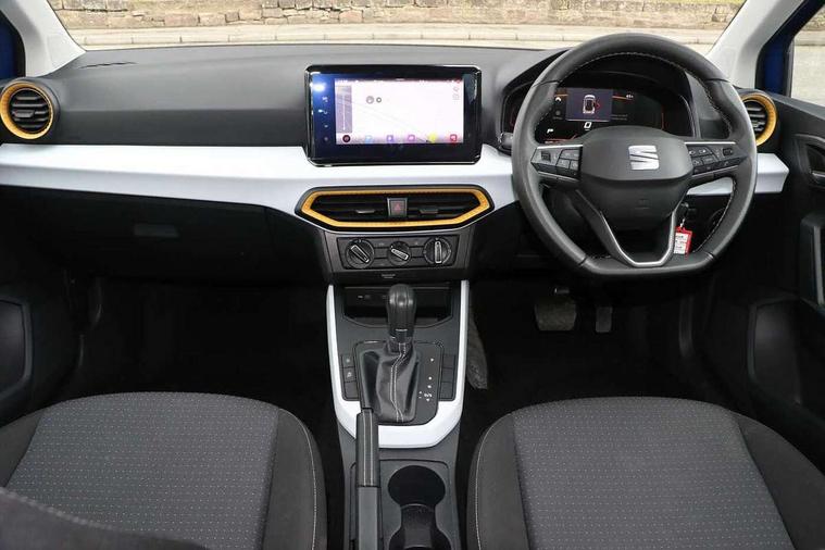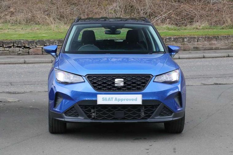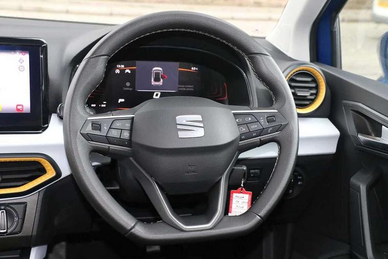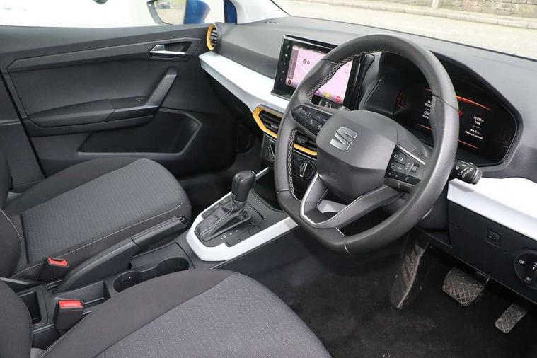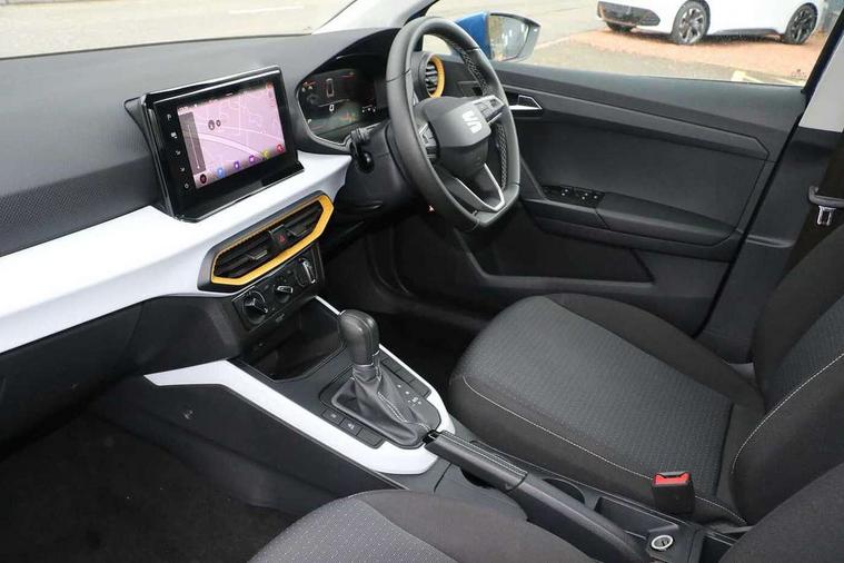 'Lights On' Reminder warning buzzer, 8" Digital cockpit, Cruise control and speed limiter, Digital clock, E-call, Electric speed sensitive power steering, Full Link Smartphone Integration with Mirror Link, Apple Car Play, Google Android Auto with USB Type C cable for Apple and Android compatibility, Lane keeping system, Low fuel warning light, Outside temperature display, Rear parking sensor, RPM counter, Seat connect with safety, service, remote and online, Trip computer, Wireless phone charger, 9.2" colour touchscreen with navigation system, voice control and USB port (type c), Bluetooth interface for hands free and audio streaming, DAB digital radio and AM/FM radio, Steering wheel mounted audio controls, Anti theft roof antenna, Automatic activation of hazard warning lights, Black roof rails and window surrounds, Body coloured bumpers, Body coloured door handle inserts, Body coloured door mirrors, Dimming rear view mirror, ECO LED automatic headlights and LED daytime running lights, Electric adjustable door mirrors, Electric front/rear windows, Hidden exhaust pipe, Licence plate lights, Protective side mouldings, Rain sensing wipers, Rear fog lights, Rear side wing doors, Rear spoiler, Rear window wash/wipe, Third brake light, Visible VIN plate, Windshield wiper with intermittent control and potentiometer, 2 cupholders, 3 seat bench in 2nd row, 60/40 split folding rear seat, Air conditioning, Cloth upholstery, Double boot floor, Driver sunvisor with covered mirror + card holder, Dust/pollen filter, Front courtesy light with front reading lights, Gear shift indicator, Grey interior roof, Height adjustable front seats, Height/reach adjustable steering column, Illuminated boot, Instrument lighting with brightness control, ISOFIX points in outer rear seats with top tether anchorage points, Leather steering wheel/gear knob/handbrake, Passenger sunvisor with vanity mirror, Single front passenger seat, Two front and three rear height adjustable headrests, Interior chrome pack - Arona, 3 point seatbelts on all rear seats, ABS, Active front headrests, Child locks on rear doors, Driver and front passenger airbags with front passenger airbag de activation, front side and curtain airbags, Electronic stability control, Emergency Brake Assist (EBA) and front assist, Front and rear seatbelt reminder, Hill hold control, Multi-Collision braking, Tiredness recognition system, Traction control, Tyre pressure monitoring system, Electronic engine immobiliser, Locking wheel bolts, Remote central locking + deadlocks, Titan black dashboard, 17" Dynamic machined alloy wheels,