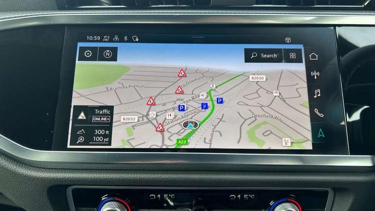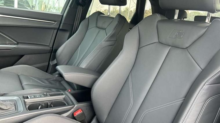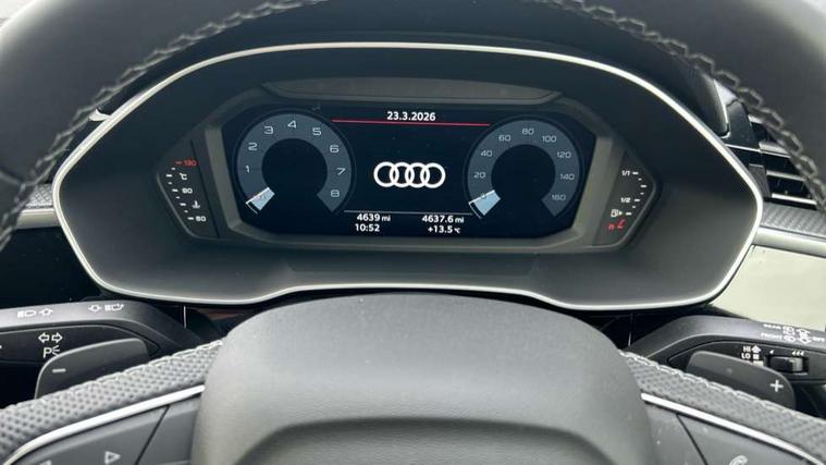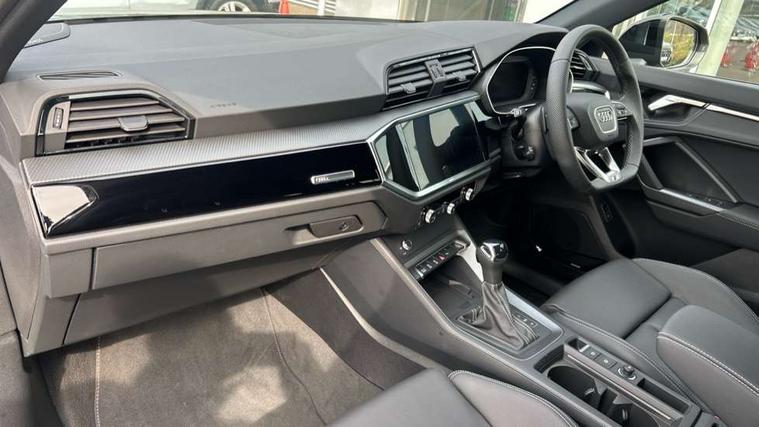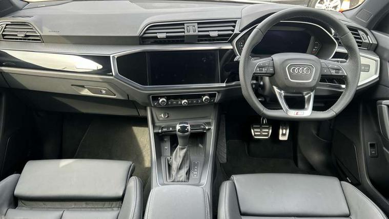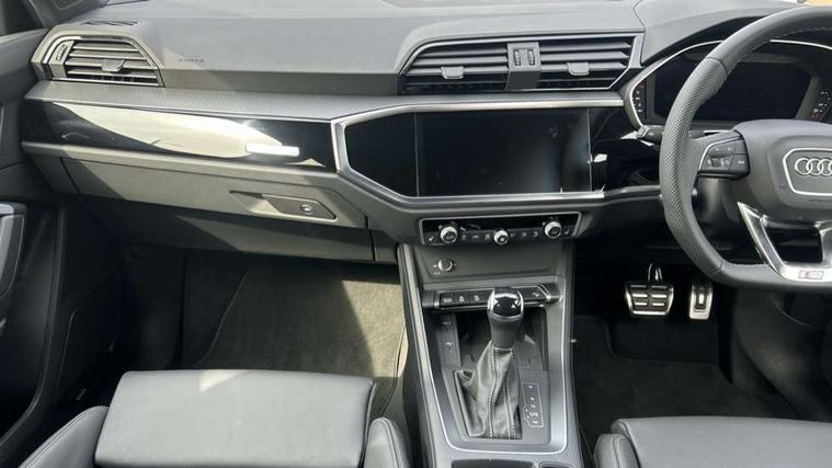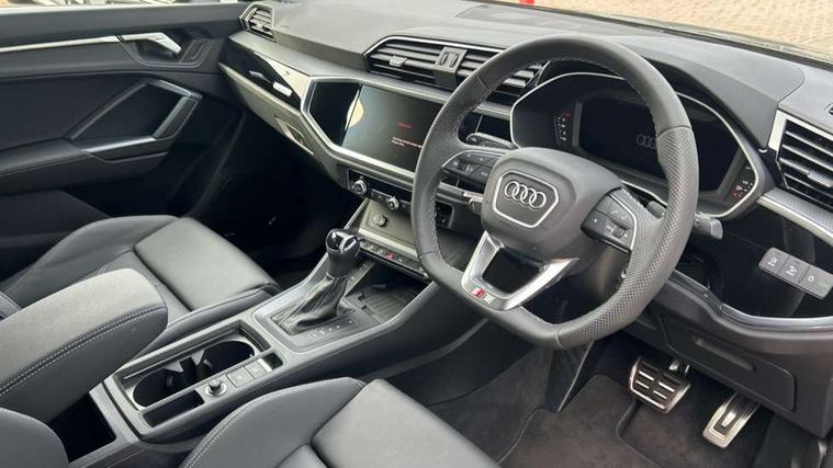 Amazon alexa Integration, Audi connect safety and service, Audi drive select, Audi lane departure warning, Audi Virtual Cockpit - 10.25" display, Bluetooth interface, Camera based traffic sign recognition, Distraction and Fatigue warning, Legal emergency call, MMI Navigation Plus with high resolution 10.1 inch touchscreen colour display, Power operated tailgate, Progressive steering, Service interval indicator, Smartphone interface includes wireless Apple carplay/Android Auto, Start stop system with recuperation, Voice control system with natural language interaction, Sports suspension, 2 USB-C ports with charge and data functions, 6 passive loudspeakers, DAB digital radio module, Acoustic windscreen, Anthracite black radiator grille, Audi Beam uses LEDs to project the Audi logo onto the ground as you exit your Q3, Auto dimming door mirrors, Auto dimming frameless rear view mirror, Black roof rails, Electrically folding, adjustable and heated door mirrors with integrated LED side indicators and kerb view function for passenger side, Front and rear electric windows, Front fog lights, Grille vertical bars in aluminium silver/Matt, High gloss black finish B and C pillars, LED Dynamic rear indicators, LED headlights with LED daytime running lights, LED rear lights, LED third brake light, Privacy glass dark tinted rear and rear-side windows (from B-pillar backwards), Rain and light sensors, Rear diffuser grille in grained matt black, Rear diffuser strip in matt anthracite black, Rear side wing doors, Rear wiper, S line bumpers in contrasting Manhattan grey, Variable front intermittent wipers, 12V socket in rear centre console, 3 seat bench in 2nd row, 40:20:40 folding with manual adjustment for 60:40 forwards/backwards position and backrest angle, Adjustable rear seat bench/backrest with centre armrest and cupholder, Black carpet mats, Black cloth headlining, Dual zone electronic climate control, Electric lumbar support, Front and rear black floor mats with contrast stitching in rock grey, Front and rear headrests, Front centre armrest, Height and reach adjustable steering wheel, Illuminated door sill trims with S logo, ISOFIX child seat mounting for front passenger with airbag deactivation and outer rear seat including top tether attachment point for outer rear seats, Luggage compartment sill protection in stainless steel, Manual front seats with height adjustment, Perforated leather gearknob, Single front passenger seat, Stainless steel pedals, Twin leather upholstery with front sport seats + S embossing, Black styling pack - Q3, Non smoking pack - Q3, 3x3 point rear seatbelts, 6 airbags - Driver, front passenger, curtain and side windows, Audi pre-sense front with pedestrain and cyclist recognition, Electrically operated child locks on rear doors, Electromechanical parking brake, Electronic stabilisation control including ABS, ASR and EDL, Front seatbelt reminder, Hill descent control, Hill hold assist, Pre sense basic, Seatbelt monitoring, Tyre pressure warning, Warning triangle and first aid kit, Anti theft wheel bolts, Immobiliser, Remote central locking, Thatcham approved category 1 anti theft alarm, Aluminium look interior elements, Detail dashboard around MMI touch colour display in glass look, black with surround in aluminium look, Leatherette door armrest, Piano black inlay,