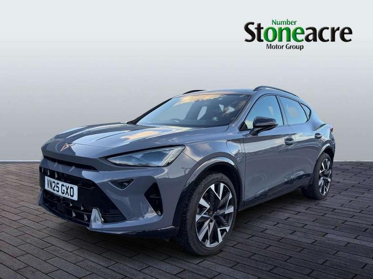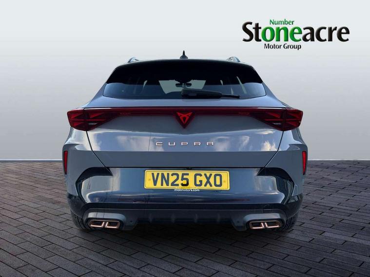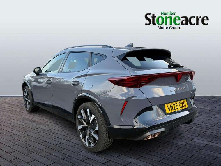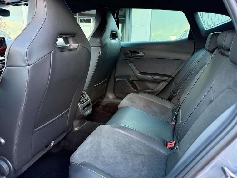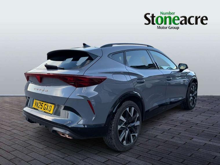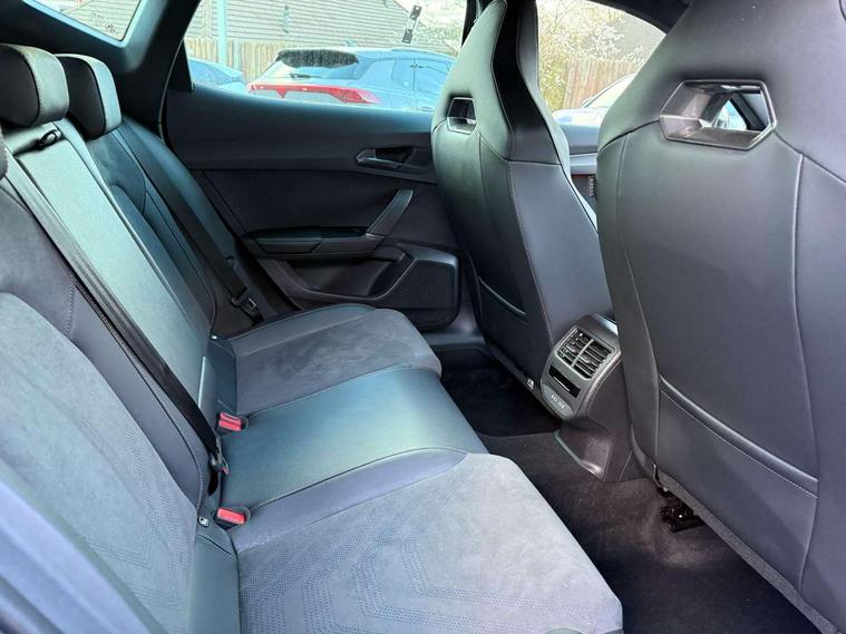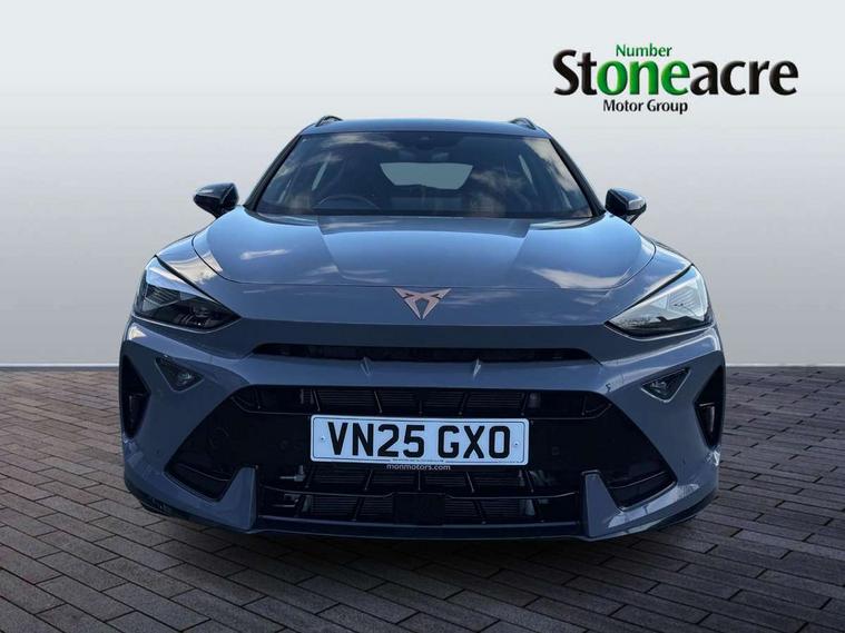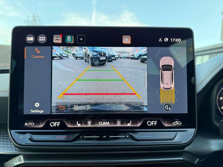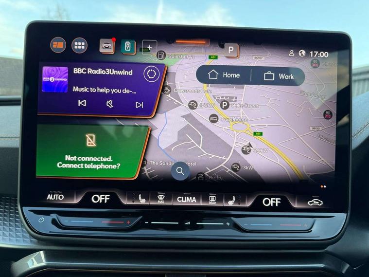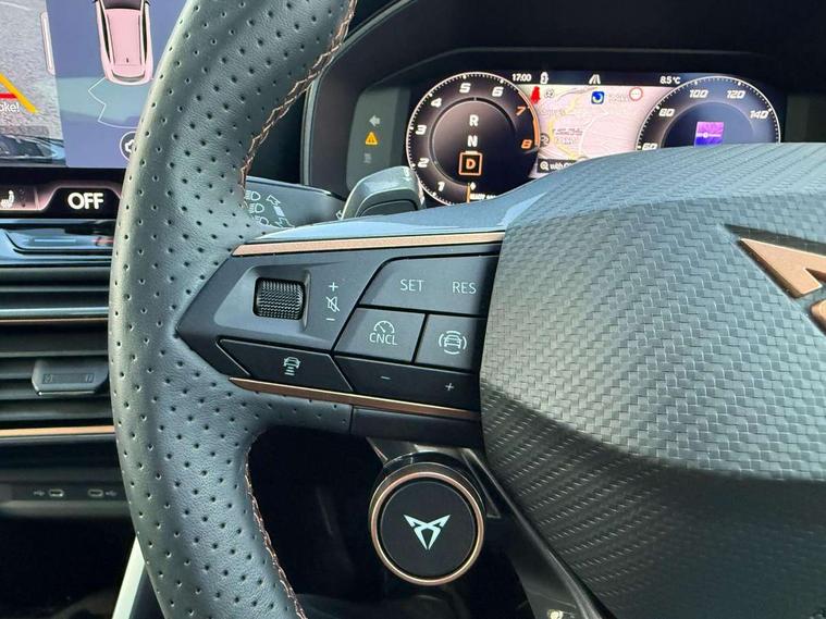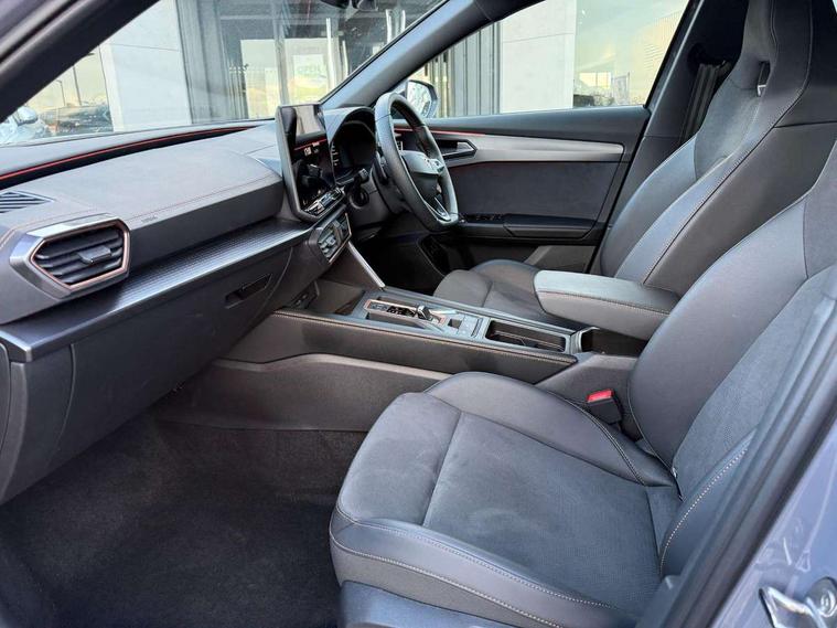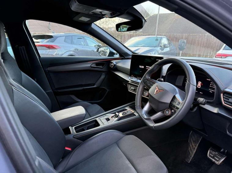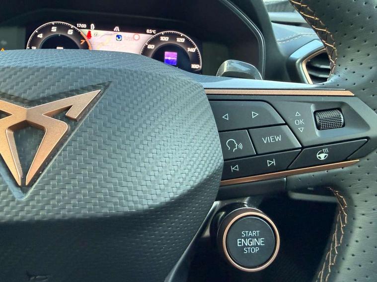 10.25" digital cockpit and configurable dashboard, Adaptive cruise control with follow-to-stop and speed limiter, Advanced driver alert system, Driving profile selection, Dynamic road sign display, Emergency steering support with turn assist, Forward collision warning with automatic braking, Front and rear parking sensors, Full link phone integration, Lane assist, Progressive steering, Rear view camera, RPM, trip computer, outside temp gauge, instrument light brightness, low fuel warning light, lights on reminder, gearshift indicator, Service interval indicator, Start/stop system with regenerative braking, Virtual pedal and electric tailgate, Voice control system, Wired Android Auto, Wireless apple carplay, Wireless phone charger, 10 amp mode 2 charging cable, 32 amp mode 3 charging cable, CUPRA sport suspension, Electronic locking differential and dynamic traction support, 2 front and 2 rear USB type C sockets, Media system with navigation, 12.9" touchscreen display, voice control, DAB, steering wheel mounted controls, Auto dimming rear view mirror, Body colour door handles, Body coloured bumpers, Dark grey wing mirror, Daytime running light with automatic headlight control and coming home feature, Door panel ambient lighting, Dynamic headlight range control, Electric front/rear windows, Electrically adjustable heated and folding door mirrors with memory function, Gloss black roof rails and window surrounds, High beam assist, LED 3rd brake light, LED front fog lamps with cornering function, LED Headlights, LED Taillights with dynamic indicator, Rain sensing wipers, Rear diffuser with copper simulated exhaust pipes, Rear fog lights, Rear side wing doors, Rear wash/wipe, Tinted rear windows, Welcome lights (within exterior mirror housing), 12V socket, 2 front and 2 rear reading lights, 3 seat bench in 2nd row, 60/40 split rear bench seat with armrest and mechanical seat release, Black headlining, Black interior roof lining, Cupra sports pedals, Dust/pollen filter, Electrically adjustable driver's seat with memory and lumbar support, Front and rear head restraints, Front centre armrest, Heated front seats, Heated supersports multifunction leather steering wheel with satellite buttons and gear shift paddles, Height/reach adjust steering wheel, Illuminated aluminium doorsteps, Illuminated interior front door sills, Illuminated sunvisor with mirror, Isofix, Leather dashboard, door insert and side trim panel, LED smart wraparound lighting, PVC/Dinamica microfiber upholstery + bucket seats, Satellite steering wheel, Single front passenger seat, Storage pockets on rear of front seats, Three zone climate control with control panel in rear, 3 point seatbelts on all rear seats, ABS, Brake control system - ESC and brake booster, Child proof door locks, Driver and front passenger airbags with front passenger airbag de-activation, Electronic parking brake, Front and rear disc brakes, Front side curtain airbags, Hill hold control, Public e-call, Seat belt reminder for front and rear seats, Tyre pressure monitoring system, Anti theft alarm system, KESSY Advanced - Keyless start, keyless entry with SAFELOCK, Locking wheel bolts, Copper and aluminium interior detailing, 19" Sandstorm machined sport black and silver alloy wheels, Breakdown and tool kit,