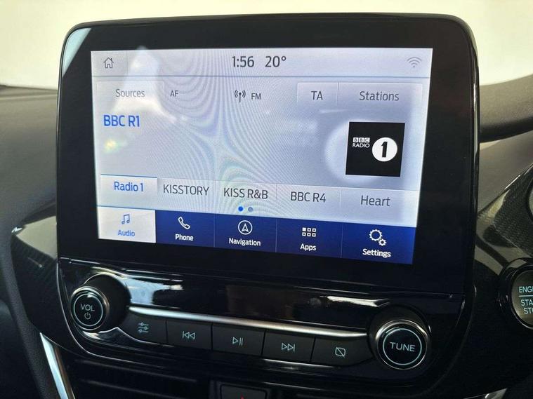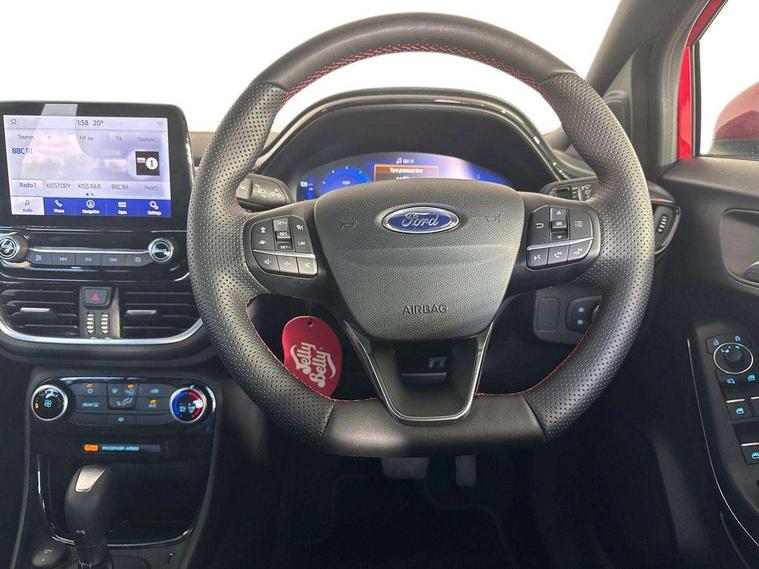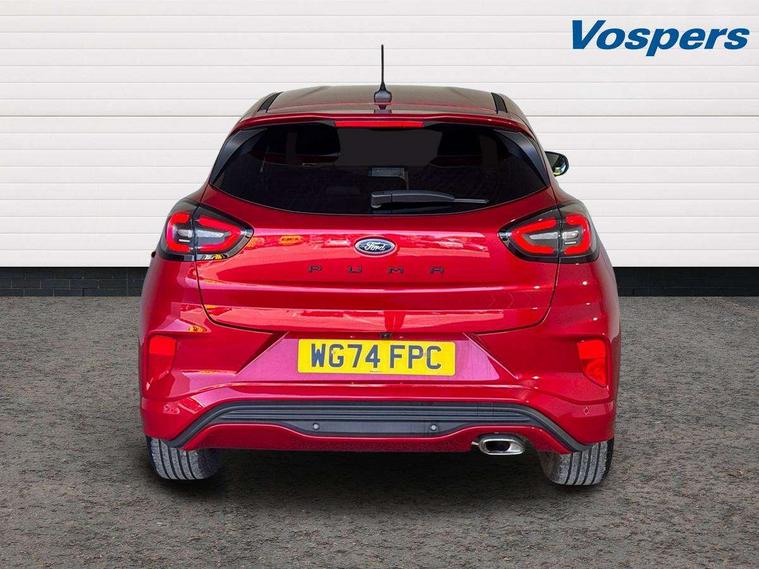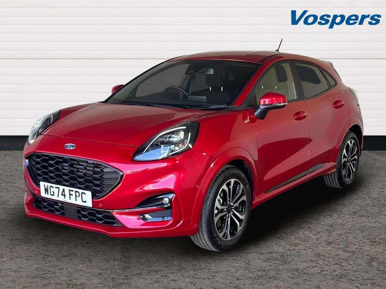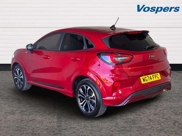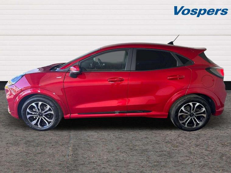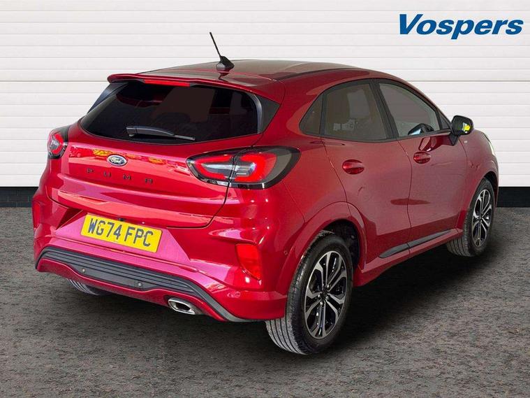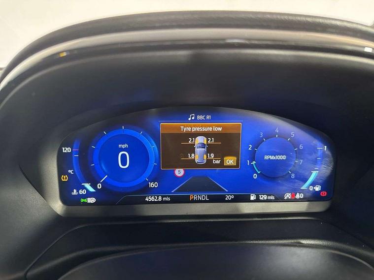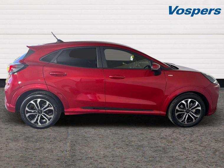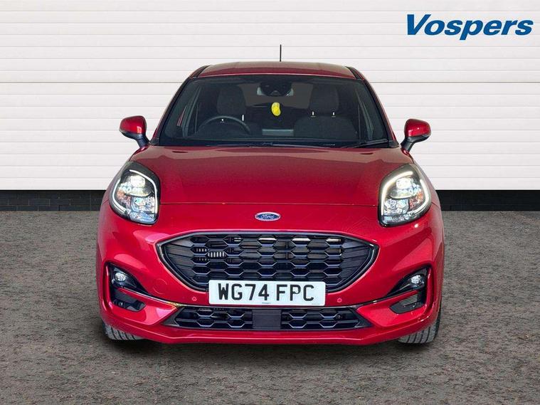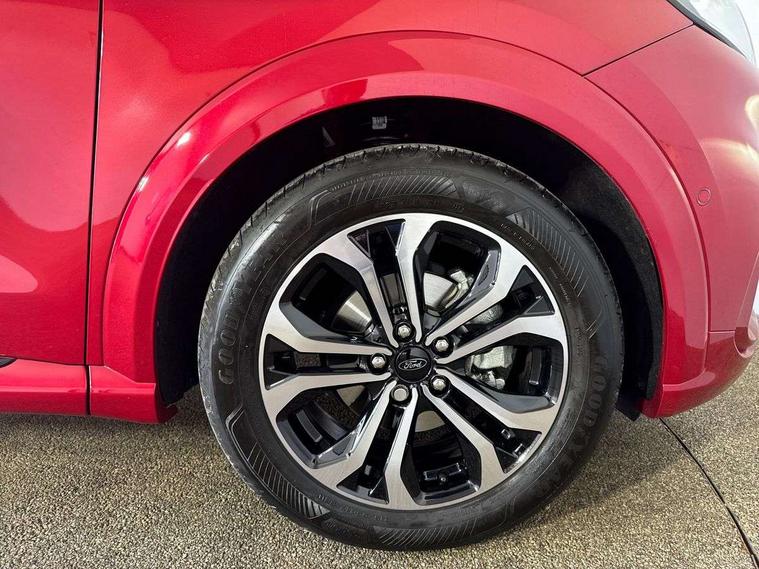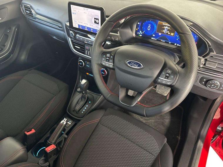 Driver impairment monitor, Emergency call service, Ford easy fuel, Full digital 12.3" instrument cluster, Lane keeping aid with lane departure warning, Power assist steering, Power start button, Rear parking sensor, Selectable drive modes(Normal, sport, Eco, trail, slippery), Speed sign recognition, Sport suspension, Automatic headlights with auto high beam, Automatic rain sensing wipers, LED rear lamps, Power foldable heated door mirrors with puddle lamps, Projector headlamps with LED day time running lights and front fog lamps, Quickclear heated windscreen, Rear side wing doors, Rear wiper, ST-Line body styling kit with unique grille, Third brake light, 3 seat bench in 2nd row, Centre console with armrest and stowage, Ford megabox extended bootspace, Front and rear head restraints, Front floor mats, Manual 2 way passenger seat adjustment, Manual 4 way driver seat adjust with lumbar adjustment, Single front passenger seat, ST- Line cloth trim with red stitching, ST-Line flat bottomed sensico leather steering wheel with leather handbrake and aluminium gear knob, Ford SYNC 3 navigation pack - Puma, 3 rear seatbelts, Child safety lock, Electronic stability control (ESC) and hill start assist, Pedestrian/cyclist detection & post-collision braking, Pre collision assist system, Tyre pressure monitoring system (TPMS), Thatcham alarm,