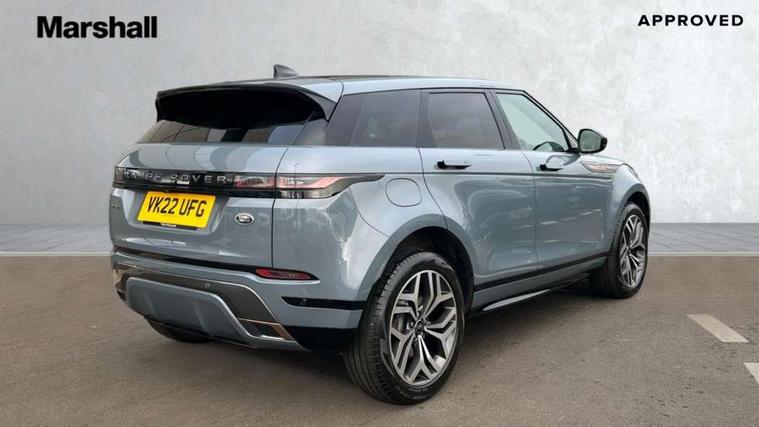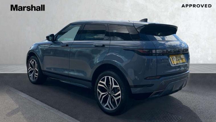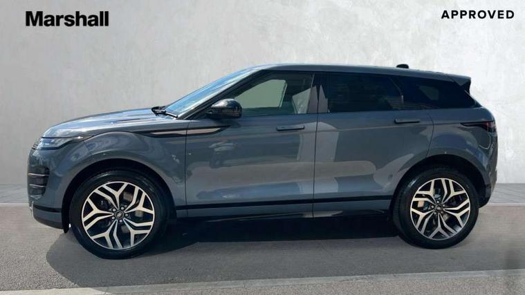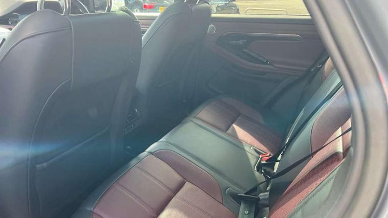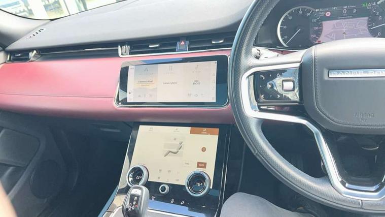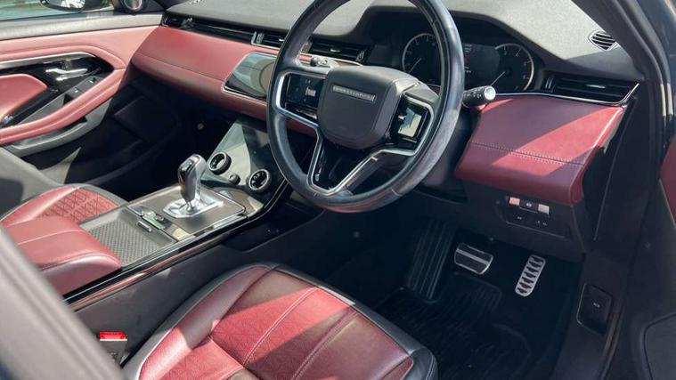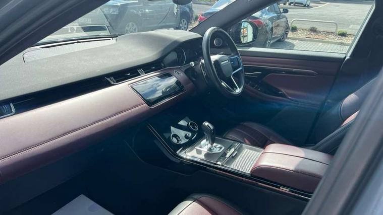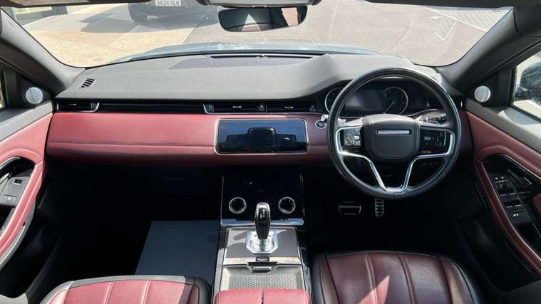 10" deployable touchscreen with lower touchscreen, Adaptive cruise control, Android Auto, Apple car play, Blind spot assist, Bluetooth connectivity, Brake pad wear indicator warning light, Clear exit monitor, Driver condition monitor, eCall emergency system, Electronic power assisted steering (EPAS), Front and rear parking aid, InControl remote, Land Rover InControl apps, Lane keep assist, Pivi pro connected includes upgraded infotainment, connected navigation pro, Nuance speech licence, Push button starter, Rear collision monitor, Rear traffic monitor, Traffic sign recognition with adaptive speed limiter, Voice control system, All terrain progress control, Configurable dynamics, Efficient Driveline, Large fuel tank, Passive suspension, Terrain Response 2 Auto, Digital Audio Broadcast radio-DAB, Meridian surround sound system with 650W subwoofer and 14 speakers, Steering wheel mounted controls, Auto headlights, Automatic headlight levelling, Electric windows with one touch open/close and anti trap, Evoque and R-Dynamic badge, Flush deployable exterior door handles, Heated rear window with timer, Heated washer jets, Heated windscreen, Power fold, auto-dimming, heated door mirrors with approach lights and auto dimming driver side, Rain sensing windscreen wipers, Rear fog lights, Rear side wing doors, Rear wiper, Tailgate spoiler, Third brake light, 40:20:40 split folding rear seats with centre headrest and armrest, Ambient interior lighting, Bright metal pedals, Heated steering wheel, Isofix system on outer rear seats, Overhead lighting console, Overhead stowage for sunglasses, Passive front head restraints, Perforated full leather steering wheel, Rear air vents, Rear centre headrest, Rear head restraints, Satin chrome gearshift paddles, Single passenger seat, Sunvisors with illuminated vanity mirrors, Twin sliding front centre armrest, 3 rear 3 point seatbelts, Anti-lock braking system (ABS), Customer configurable autolock, DSC - Dynamic Stability Control, Electronic brake force distribution, Electronic parking brake, Electronic traction control, Emergency braking, Front and rear seatbelt reminder, Hill descent control, Hill launch assist, Low traction launch, Power operated child locks, Roll stability control, Six airbags - Driver and passenger airbags/driver knee airbag/front side airbag and curtain airbags, Torque vectoring brake, Tyre pressure monitoring system, Alarm, Immobiliser, Intrusion sensor, Keyless entry, Locking wheel nuts,