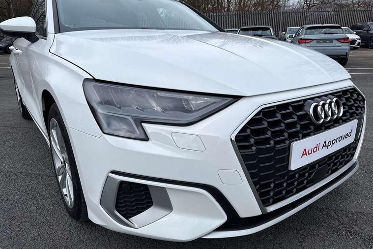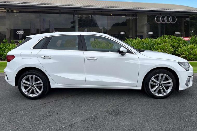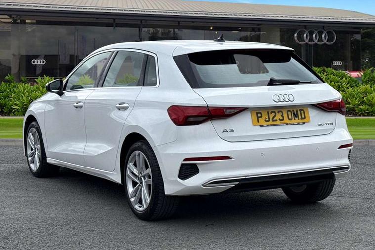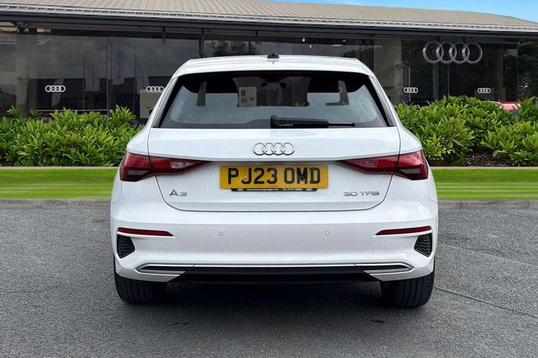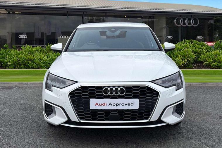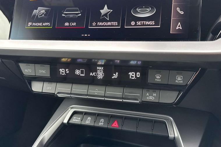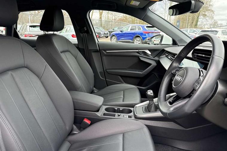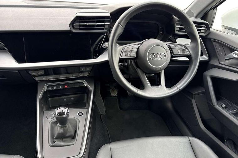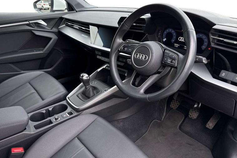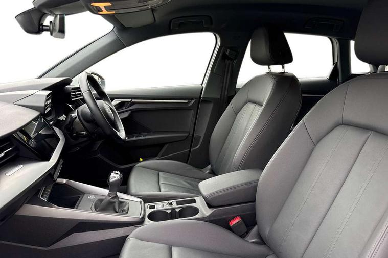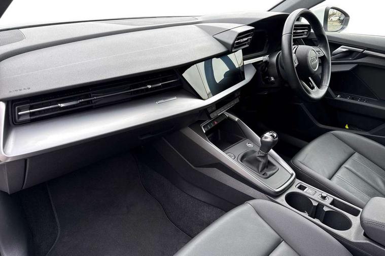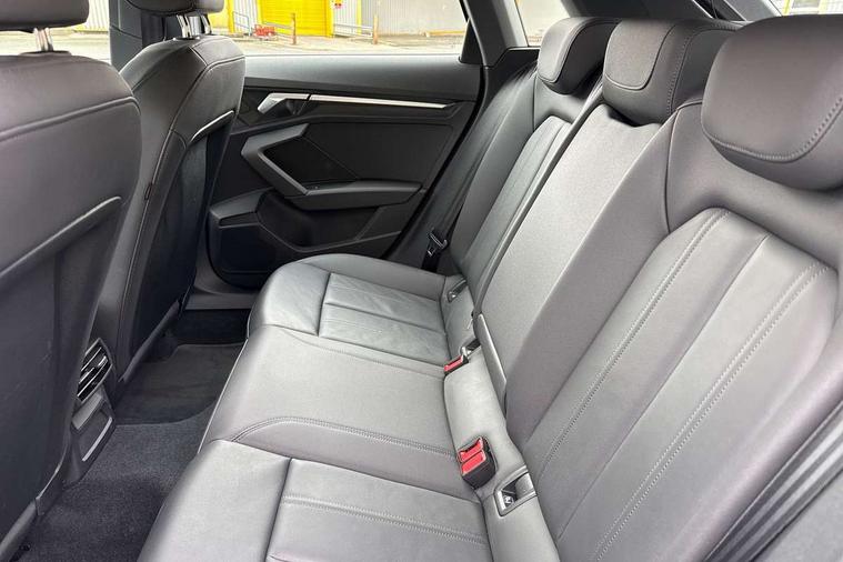 Audi drive select (Auto, Comfort, Dynamic and Individual), Audi smartphone interface, Audi Virtual Cockpit - 10.25" digital and colour instrument cluster, Automatic start/stop system with recuperation, Bluetooth interface, Camera based traffic sign recognition, Collision avoidance assistant, Cruise control, e-Call (emergency call), Electromechanical power speed sensitive steering, Lane departure warning system, MMI Navigation Plus with high resolution 10.1" colour touch screen display, Rear parking sensors, Service indicator, Trip computer, Voice control system with natural language interaction, Standard suspension, 2xUSB-C connection with data and charging functions, 6 passive loudspeakers, DAB Digital radio, 3rd brake light, Acoustic glass windscreen, Aluminium window trim, Auto dimming frameless rear view mirror, Body colour exterior mirrors, Body colour roof spoiler, Electrically adjustable/heated/folding/auto dimming door mirrors with integrated LED indications + kerb view function for passenger side, Front electric windows, LED daytime running lights, LED headlights and halogen rear lights, Light and rain sensors, Rear electric windows, Rear side wing doors, Rear window, rear door windows and rear side windows in clear glass, Rear wiper, 12V socket and storage compartment in front centre console, 3 seat bench in 2nd row, 3 spoke leather multifunction steering wheel, 4 way electrically adjustable lumbar support for driver and front passenger, 60/40 split folding rear seat bench, Dual zone electronic climate control, Front and rear headrests, Front centre armrest, Front door sill trims with aluminium inlay, Front/rear floor mats, Height and reach adjustable steering wheel, Interior lighting - Front and rear roof module including reading lights, glove compartment light and right hand side, Interior lighting - glove compartment light and right hand side, Luggage compartment floor covering, Manual boot compartment lid, Manually adjustable front seats, Routine cloth upholstery with front sports seats, Seat side bolsters, Single front passenger seat, Steel grey cloth headlining, Aluminium interior elements pack - A3 Sportback, LED interior lighting pack - A3 Sportback, Sport styling pack - A3 Sportback, 3x3 point rear seat belts, Driver and front passenger airbag with passenger airbag deactivation, Electronic Stabilisation Control (ESC) including ABS, ASR and EDL, First aid kit with warning triangle and 2 safety vests, Front side airbags with head airbags and interaction airbag, Pre-sense front with pedestrian and cyclist detection, Seatbelt monitoring, Tyre pressure loss indicator, Anti theft alarm, Anti-theft wheel bolts, Electronically operated child lock, Immobiliser, Remote control central locking, Inlays with silk effect paint in platinum grey,