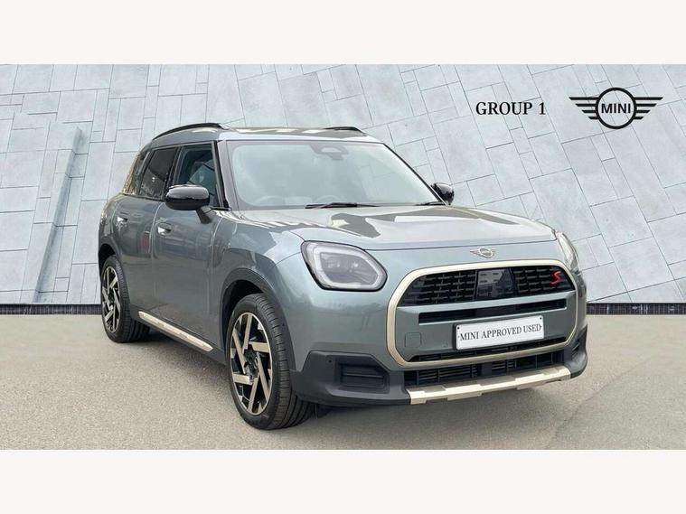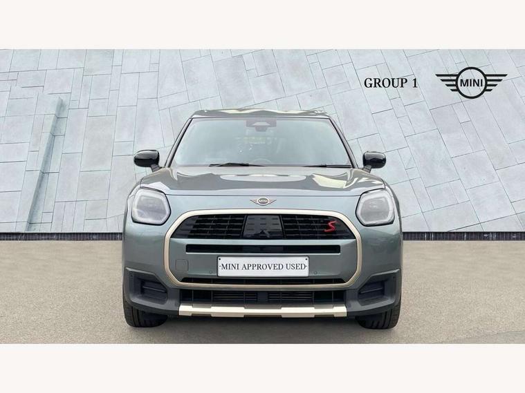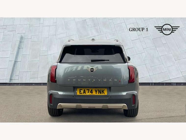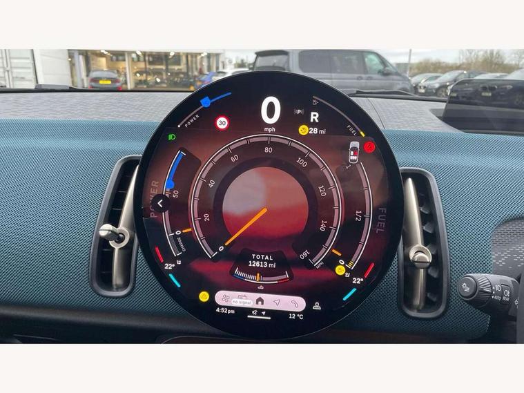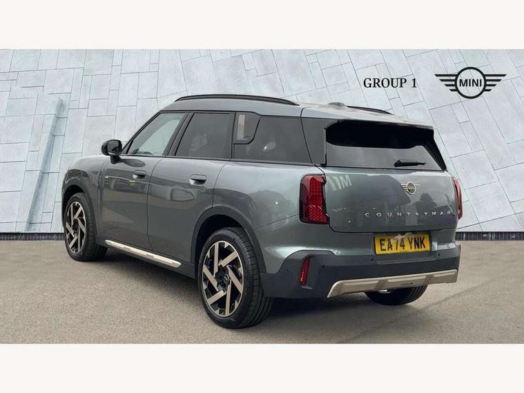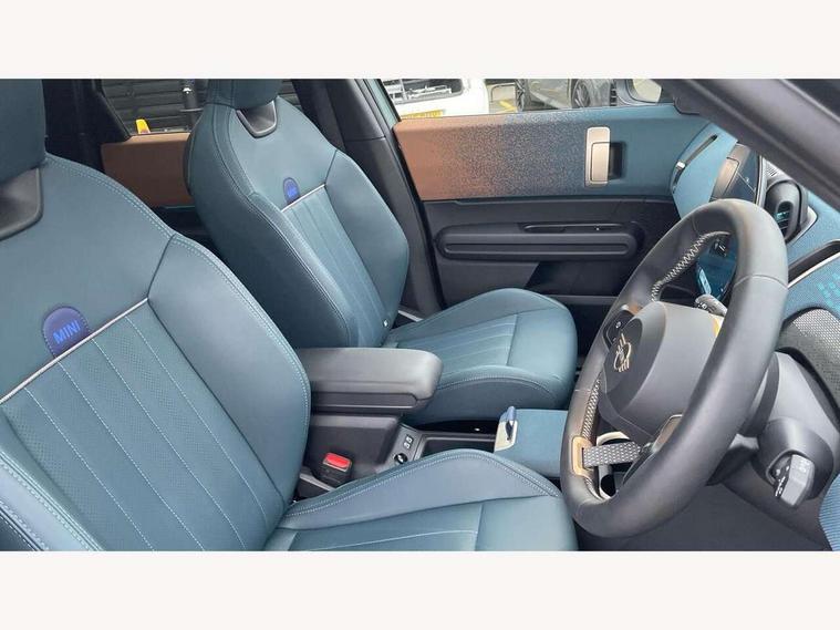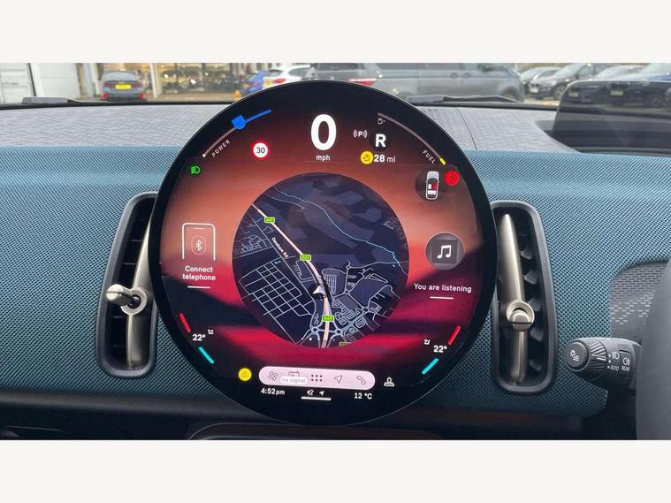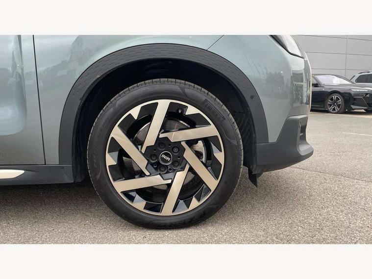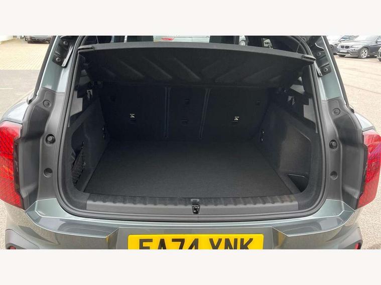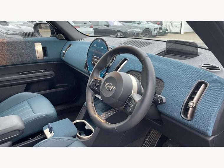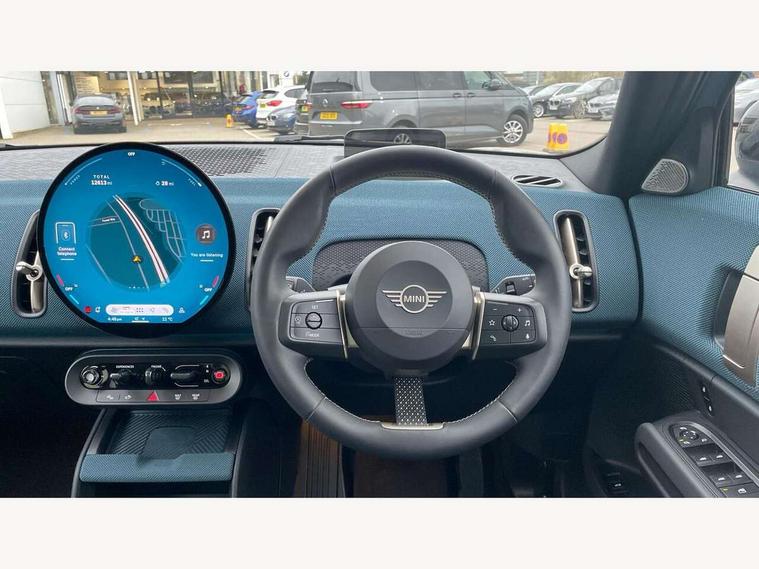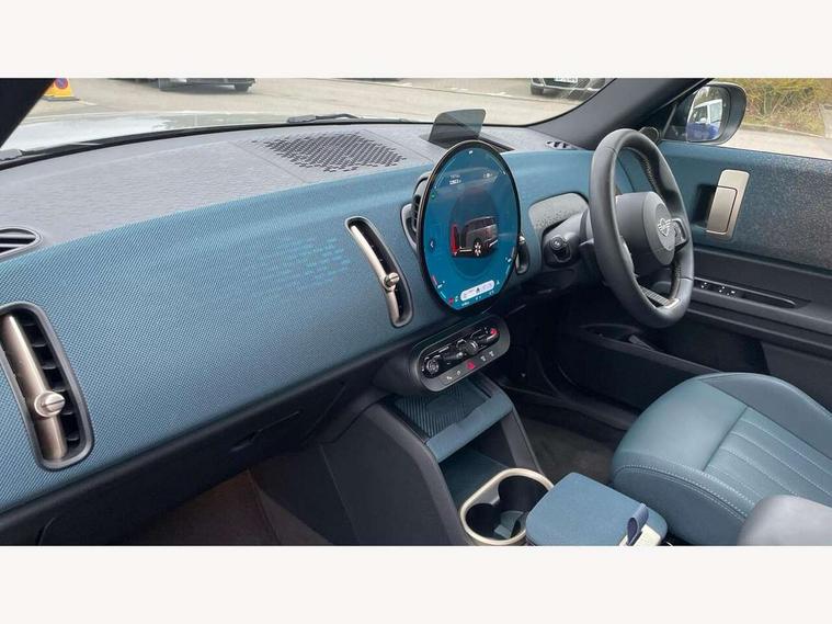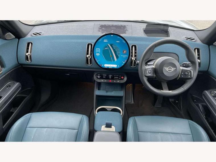 Bluetooth connection, Circular OLED Screen, Compatible mobile phone bluetooth with audio streaming, Cruise Control (DCC), Digital dashboard display, Driving assistant, Driving Assistant Plus Preparation, E-call, Electro-mechanical speed dependant steering assistance, MINI Experience Modes, MINI Head up display, Mini navigation system, MINI TeleServices, Parking assistant in camera and ultrasound based assistance system, rear view camera, parking aid and distance control, Auto transmission with Paddles, Larger capacity fuel tank, 6 speakers, DAB Digital radio, Personal eSim, Auto tailgate, Electric adjustable heated door mirrors, Front and rear electric windows, Heated rear window, High beam assistant, Interior rear-view mirror with automatic anti-dazzle function, LED daytime running lights, LED headlights with extended contents including Adaptable light signatures, LED rear lights, LED third brake light, Logos in Vibrant Silver, Rain sensor with auto headlights, Rear side wing doors, Rear window wiper, Roof rails, Vibrant silver grille surround, 3 Seat sliding rear bench in 2nd row, 60/40 split rear bench seat, Anthracite headliner, Auto air conditioning, Driver and front passenger seat heating, Floor mats, Front armrest, Front headrests, Front sport seats, Heated steering wheel, Height and length steering column adjustment, Lidded storage box in Petrol knit, Luggage compartment separating net, Rear headrests, Seat adjustment for rear seats, Single front passenger seat, Sport Vescin Steering Wheel, Sunvisors with vanity mirrors, Vescin synthetic leather upholstery, Vibrant Silver sill inlay, Wireless charging tray, Interior and exterior mirror package - Mini Countryman, 3x3 point rear seat belts, 6 Airbags - front, side, head and seat belt tensioners, ABS, DSC - Dynamic Stability Control, Electronic handbrake, Electronic Stability Programme (ESP), Front ISOFIX (iSize), Hill descent control, Hill hold assist, Hill start assist, Manual rear child locks, Traction control, Tyre pressure monitoring system, Warning triangle, Alarm system with tilt sensor, monitoring doors, bonnet interior and tailgate, Auto drive away locking, Comfort access system, Deadlocking function, Electronic vehicle immobiliser, Locking wheel bolts, Remote control locking, Start/stop toggle with keyless go, Petrol/Brown dashboard knit, MINI Mobility Kit,
