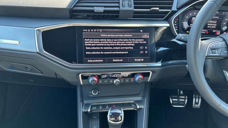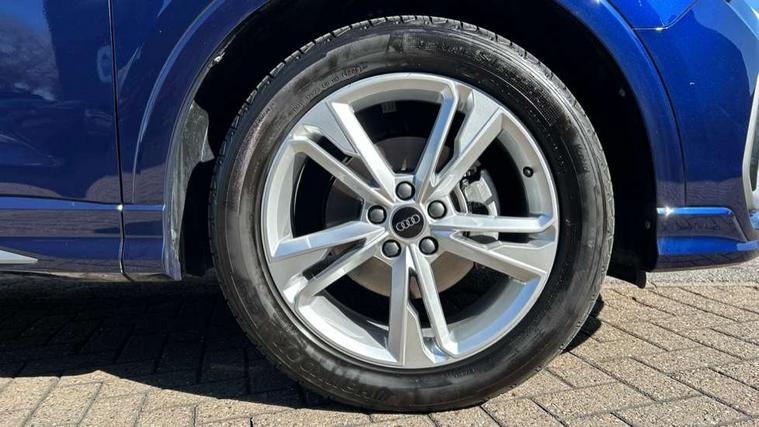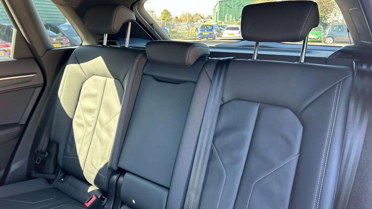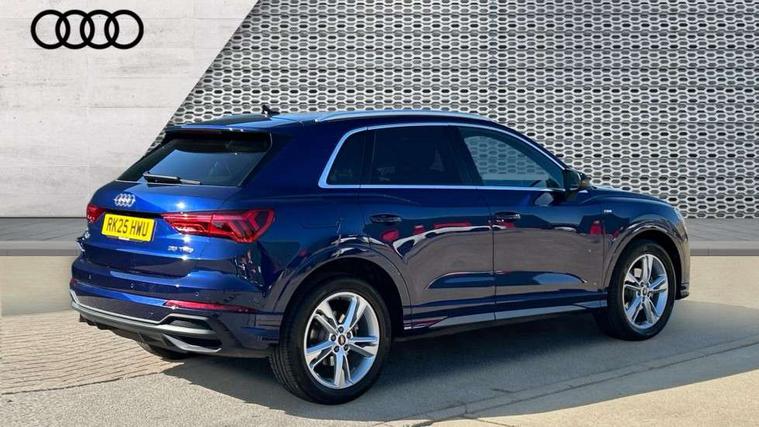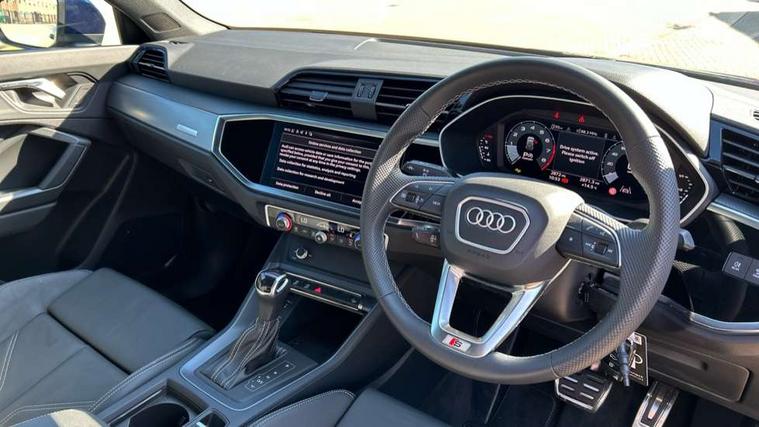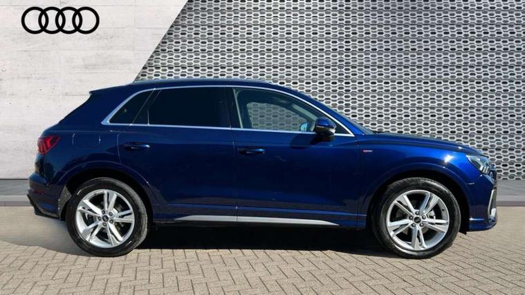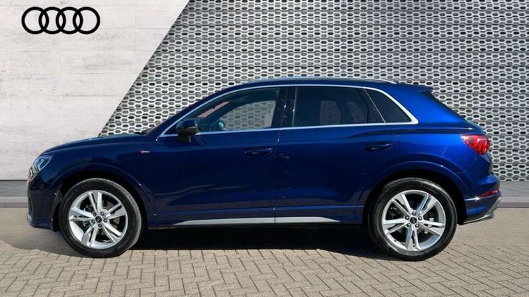 Amazon alexa Integration, Audi connect safety and service, Audi drive select, Audi lane departure warning, Audi Virtual Cockpit - 10.25" display, Bluetooth interface, Camera based traffic sign recognition, Distraction and Fatigue warning, Legal emergency call, MMI Navigation Plus with high resolution 10.1 inch touchscreen colour display, Power operated tailgate, Progressive steering, Service interval indicator, Smartphone interface includes wireless Apple carplay/Android Auto, Start stop system with recuperation, Voice control system with natural language interaction, Sports suspension, 2 USB-C ports with charge and data functions, 6 passive loudspeakers, DAB digital radio module, Acoustic windscreen, Aluminium roof rails, Aluminium window trim, Anthracite black radiator grille, Auto dimming door mirrors, Auto dimming frameless rear view mirror, Body colour front spoiler blade, Electrically folding, adjustable and heated door mirrors with integrated LED side indicators and kerb view function for passenger side, Front and rear electric windows, Front fog lights, Front side air inlets in matt platinum grey, Grille vertical bars in aluminium silver/Matt, High gloss black finish B and C pillars, LED Dynamic rear indicators, LED headlights with LED daytime running lights, LED rear lights, LED third brake light, Privacy glass dark tinted rear and rear-side windows (from B-pillar backwards), Rain and light sensors, Rear diffuser grille in grained matt black, Rear diffuser strip in matt anthracite black, Rear side wing doors, Rear wiper, S line badges on front wings, S line front and rear bumpers and side skirts in contrasting Manhattan grey paint finish, Side skirt insert in matt Platinium grey, Variable front intermittent wipers, 12V socket in rear centre console, 3 seat bench in 2nd row, 3 spoke leather multifunction steering wheel features S badging and grips in perforated leather with contrast stitching, 40:20:40 folding with manual adjustment for 60:40 forwards/backwards position and backrest angle, Adjustable rear seat bench/backrest with centre armrest and cupholder, Black cloth headlining, Dual zone electronic climate control, Electric lumbar support, Front and rear black floor mats with contrast stitching in rock grey, Front and rear headrests, Front centre armrest, Height and reach adjustable steering wheel, Illuminated door sill trims with S logo, ISOFIX child seat mounting for front passenger with airbag deactivation and outer rear seat including top tether attachment point for outer rear seats, Manual front seats with height adjustment, Perforated leather gearknob, Single front passenger seat, Stainless steel luggage compartment sill finisher, Stainless steel pedals, Twin leather upholstery with front sport seats + S embossing, Non smoking pack - Q3, 3x3 point rear seatbelts, 6 airbags - Driver, front passenger, curtain and side windows, Audi pre-sense front with pedestrain and cyclist recognition, Electrically operated child locks on rear doors, Electromechanical parking brake, Electronic stabilisation control including ABS, ASR and EDL, Front seatbelt reminder, Hill descent control, Hill hold assist, Pre sense basic, Seatbelt monitoring, Tyre pressure warning, Warning triangle and first aid kit, Anti theft wheel bolts, Immobiliser, Remote central locking, Thatcham approved category 1 anti theft alarm, Aluminium look interior elements, Dark matt brushed aluminium inlay, Detail dashboard around MMI touch colour display in glass look, black with surround in aluminium look, Leatherette door armrest,