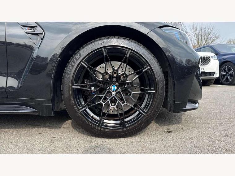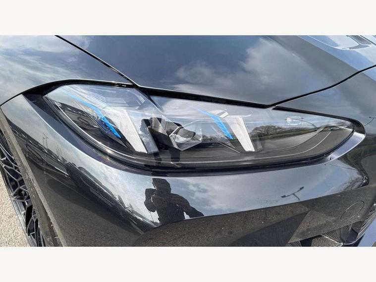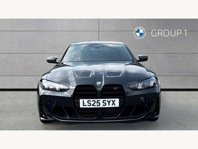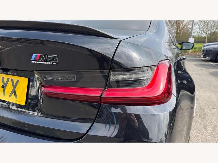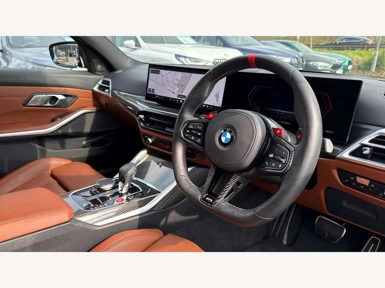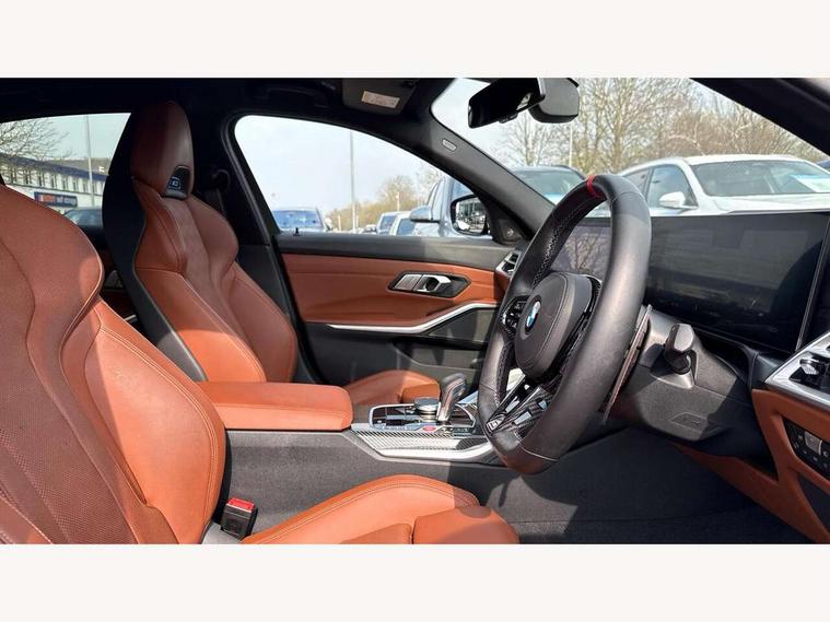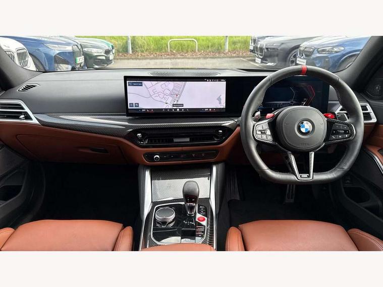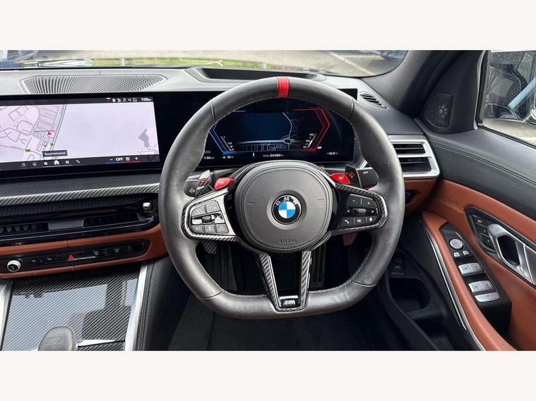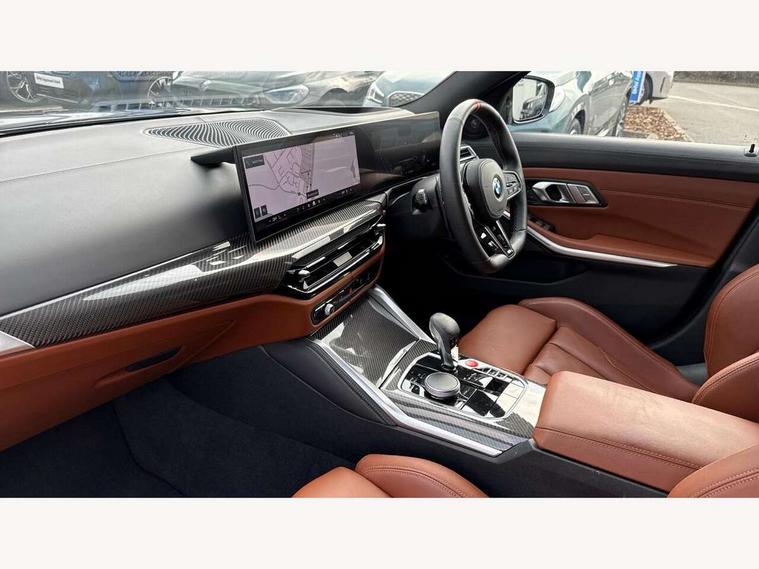 Active Guard, Automatic start/stop system, BMW ConnectedDrive online services, BMW legal emergency call, BMW Live Cockpit Pro with Head up display including 12.3" instrument display and 14.9" high resolution control display with navigation function, BMW Teleservices, Brake pad wear indicator warning light, Condition based service, Cruise control with braking function, Door/boot open warning light, Electric Power Steering (EPS) with Servotronic, Language version English, Lights on warning, M drive buttons, Oil sensor for level and grade, warning by check control system, Oil temperature gauge, On board computer, On board diagnostics, Optimum shift indicator, Outside temperature display, Park distance control, Pull away assistant, Run flat indicator, Service interval indicator, Shifting point display, Smartphone integration, Speed limiter, Start/stop button in red, Variable sport steering, Double joint spring strut front axle, Electronic differential lock control (EDLC), M Adaptive suspension, M Drive Professional including track mode, laptimer, traction control & Drift analyser, M Sport differential, Safety battery terminal clamp, Sport automatic transmission with gearshift paddles, Auxiliary point for auxiliary devices, DAB radio with bluetooth music capability, Harman kardon surround sound audio system, Personal eSim, Auto dimming driver's door mirror, Automatic headlights + automatic windscreen wipers, Automatic parking function on front passenger's exterior mirror, Black chrome exhaust tailpipes, Black model designation badges, BMW high gloss shadow line with extended contents, BMW radiator grille, frameless, with horizontal double blind slats, black high-gloss, with model badge, Body colour bumpers, Bonnet and tailgate badge, Carbon fibre reinforced plastic (CFRP) roof, Day time running light, Door mirror integrated indicators, Door sill finishers with aluminium inserts, Dynamic brake lights, Electric adjustable heated door mirrors, Electric folding door mirrors, Electrochromic exterior driver side mirror, Electrochromic interior rear view mirror with automatic anti-dazzle function, Entry sills with aluminium inserts and model badge, Follow me home headlights, Front and rear bumper system, Front and rear plastic apron in vehicle colour, Front door sill strips in aluminium inlays with M3 inscription, Front electric windows with open and close fingertip control, anti trap facility and comfort closing, Headlight beam throw control, Heat protection, sun protection glazing, Heated washer jets, High gloss black lower bumper edges, side sills and diffuser edge binding, LED 3rd brake light, LED tail lights with 3D L-shaped LED light design, M designation, Mirror glass aspheric on driver's side, convex on passenger side, Rain sensor, Rear boot, Rear fog lights, Rear reflectors, Rear side wing doors, Reversing light, Roof fin and roof trim strips in Black high-gloss, Shark fin roof aerial, Strakes in front side panel, black matt/high-gloss black, with model badge, Visible VIN plate, Welcome lighting, 2 cupholders in front centre console, 2 cupholders in rear armrest, 2 rear head restraints, 2 x 12 V Power sockets (luggage compartment and front centre console), 2 x USB Type C ports for charging and data transmission in front centre console, 3 seat bench in 2nd row, 40:20:40 split folding rear seat with loading system, Ambient inside door handle light, Ambient lighting for storage compartment, Ambient lighting front and rear, Anthracite headlining, Battery in luggage compartment, Centre console armrest with storage compartment, Contour lighting for door trim, Driver/passenger sunvisors with ticket holders + illuminated vanity mirrors, Driving experience mode switch, Dual zone automatic air conditioning, Dynamic ambient interior lighting, Electric front seats + driver memory, English handbook, Floor mats in velour, Front and rear door exit lights, Front door storage bins with bottle holder, Front footwell ambient lighting, Front interior light, Front isofix attachment + airbag deactivation, Front reading light, Front seat backrest width adjustment, Front/rear door armrests, Heated front seats, Height adjustable front headrests, Illuminated bow-type door handles in vehicle colour, driver's side with door lock, Interior mirror lighting, Isofix on 2nd row outer seats, Lockable/illuminated glovebox, Luggage compartment lighting, Multifunction steering wheel, Rake/reach adjustable steering wheel, Single front passenger seat, Storage compartment in rear doors, Storage tray and compartment with cover in centre console, Through loading system, Toolkit located in luggage compartment, Waterfall lighting for central air vent, Wireless charging tray, Connected package professional - M3, Extended storage pack - M3/M4, High gloss shadowline exterior trim pack - M3, 3 point seatbelts on all seats, ABS/EBD, Automatic Stability Control (ASC), Brake energy regeneration, Brake fade compensation, Compound structure brake discs, Cornering brake control (CBC), Crash sensor, Curtain airbags, Driver/Front Passenger airbags, Dry braking, Dynamic brake control, Dynamic stability control + (DSC+), Dynamic Traction Control - DTC, Electromechanical parking brake, Front and rear head airbags, Front seat side impact airbags, Front seatbelt pretensioners + load limiters, Hill start assist, M Sport seat belts, Rear child proof door locks, Seat occupancy detection for driver and passenger side, Seatbelt warning, Side impact protection, Two tone horn, Tyre pressure sensor, Warning triangle and first aid kit, Centre lock switch, Closing system with central locking, Electronic immobiliser, Locking wheel bolts, Remote central locking, Thatcham cat 1 remote alarm, Vehicle Key with 4 buttons including the integrated key, Galvanic embellisher for controls, Tyre repair kit,