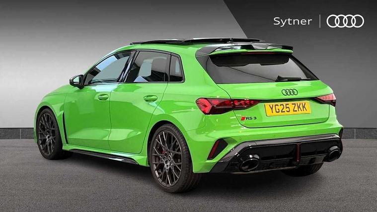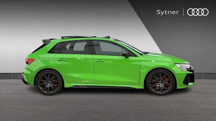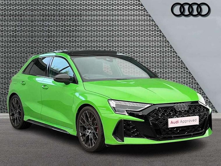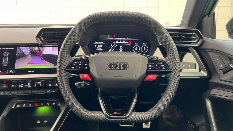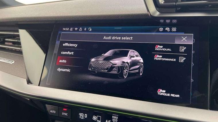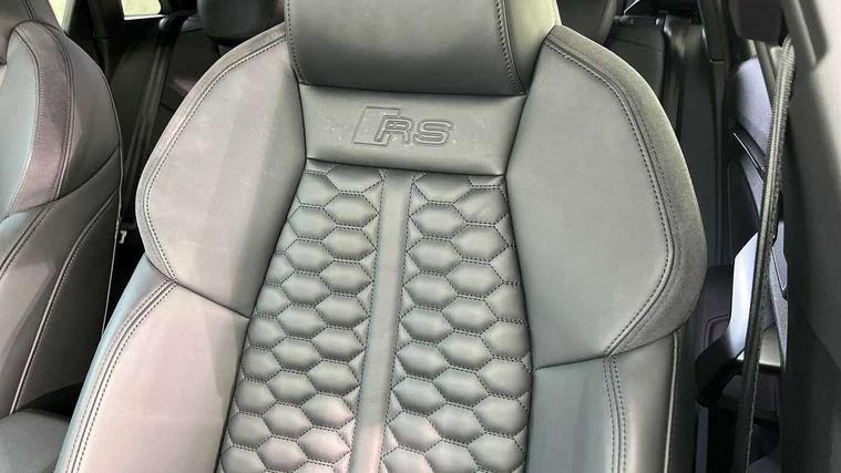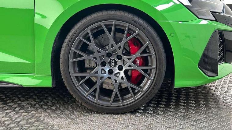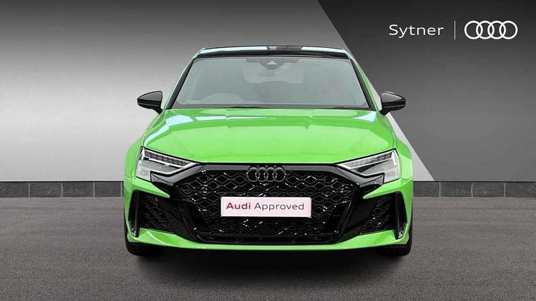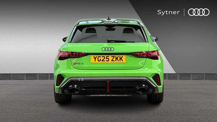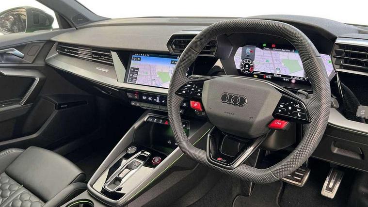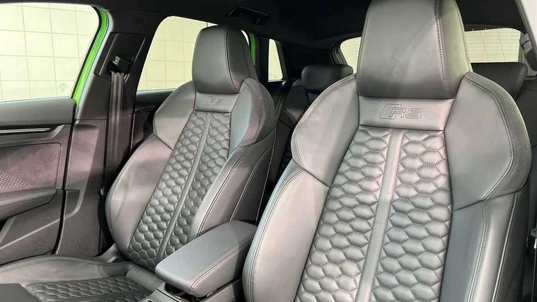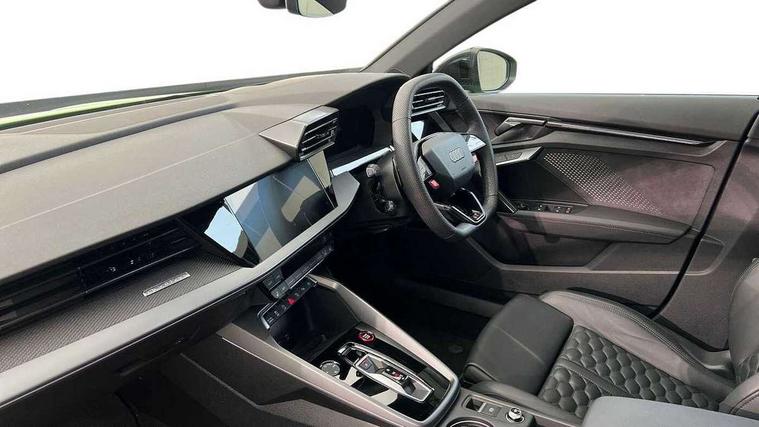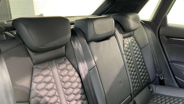 Adjustable speed limiter, Audi drive select comfort, auto, dynamic and efficiency, Audi smartphone interface with app store includes wireless Apple carplay, Android auto and Amazon alexa integration, Audi virtual cockpit plus with RS specific design and 12.3" display with additional graphic display options, Automatic start/stop system with recuperation, Bluetooth interface, Camera based traffic sign recognition, Collision avoidance assistant, Distraction and Fatigue warning, e-Call (emergency call), Lane departure warning system, MMI Navigation Plus with high resolution 10.1" colour touch screen display, Park Assist with parking system Plus, Progressive steering, RS specific driving modes - RS Individual, RS Performance and RS Torque rear, Voice control system with natural language interaction, Quattro permanent four wheel drive, Audi Phonebox light with wireless charging, DAB Digital radio, USB ports with charging function in the rear, All weather light, Audi beam LED projection of RS logo on ground as you exit, Audi darkened matrix LED headlights with dynamic light sequencing and dynamic indicator, Auto dimming frameless rear view mirror, Automatic dynamic range control, Carbon door mirror housings, Carbon fibre engine cover, Dipped beam, main beam, position light and turning light, Dynamic RS specific light sequencing of the coming home and leaving home function, Electrically adjustable/heated/folding/auto dimming door mirrors with integrated LED indications + kerb view function for passenger side, Exterior model badging, Front electric windows, Headlight cleaning system, Heat insulating glass windscreen, Intersection light, LED 3rd brake light, LED brake lights, LED daytime running x3, LED rear lights with dynamic light sequencing and dynamic indicator, LED rear number plate lights, LED reverse light, LED tail lights, Light and rain sensors, Manoeuvring light, Motorway light, Privacy glass - dark tinted rear window, rear door and side windows, Rear electric windows, Rear side wing doors, Rear wiper, Roof edge spoiler in carbon, RS dual branch exhaust system with two chrome plated oval tailpipe trims, Static Cornering lights, Visually upgraded RS specific daytime running light choice of 4 digital signature in chequered flag design within the headlight, 12V socket and storage compartment in front centre console, 3 seat bench in 2nd row, 3 Spoke flat top and bottomed black leather multi function steering and gear shift paddles, 3-zone deluxe automatic air conditioning, 40/20/40 split folding rear seat bench, Black cloth headlining, Front and rear headrests, Front centre armrest, Front door sill trims with RS 3 logo, Front sports seats RS embossed logo, Front/rear floor mats, Heated front seats, Height and reach adjustable steering wheel, Manual boot compartment lid, Manually adjustable front seats, Rear centre armrest with cupholder, Seat side bolsters, Single front passenger seat, Stainless steel pedals and front footrest in black, Vanadium look - Interior door handles, Door trim, power latching, Air vents, window controls, mirror adjust, rear door lock, Selector lever in centre console, Black Styling plus package - RS3, Extended ambient lighting package Pro with Multi-coloured contour lighting of instrument panel - RS3, RS exterior features pack in carbon and gloss black - RS3, RS sport suspension pack - RS3, Storage package - RS3 Sportback, Technology package without speed limiter - RS3, 3x3 point rear seat belts, Driver and front passenger airbag with passenger airbag deactivation, Electronic Stabilisation Control (ESC) including ABS, ASR and EDL, First aid kit with warning triangle and 2 safety vests, Hill hold assist, Pre-sense front with pedestrian and cyclist detection, RS steel brakes, Seatbelt monitoring, Tyre pressure loss indicator, Anti theft alarm, Anti-theft wheel bolts, Electronically operated child locks, Remote central locking with safelock, Inlays in carbon atlas structure, 19" 10 cross spoke silk matt grey alloy wheels, Tyre repair kit,