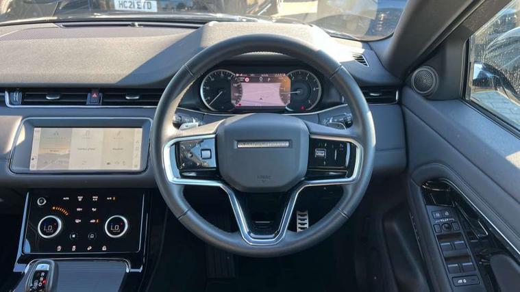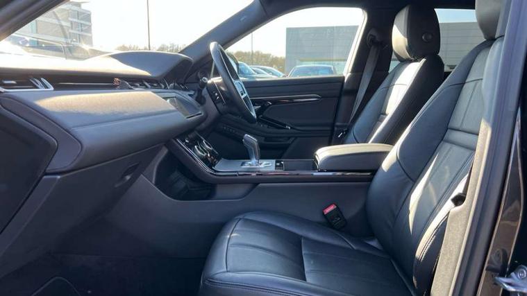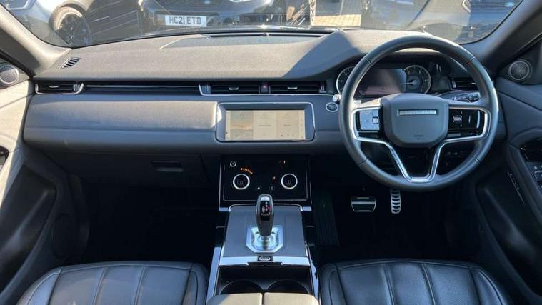 Adaptive cruise control, Android Auto, Apple car play, Blind spot assist, Bluetooth connectivity, Brake pad wear indicator warning light, Driver condition monitor, eCall emergency system, Electronic power assisted steering (EPAS), Front and rear parking aid, InControl remote, Land Rover InControl apps, Lane keep assist, Pivi pro connected includes upgraded infotainment, connected navigation pro, Nuance speech licence, Push button starter, Rear collision monitor, Rear traffic monitor, Traffic sign recognition with adaptive speed limiter, Voice control system, All terrain progress control, Efficient Driveline, Passive suspension, Terrain Response 2 Auto, Digital Audio Broadcast radio-DAB, Steering wheel mounted controls, Auto headlights, Automatic headlight levelling, Electric windows with one touch open/close and anti trap, Evoque and R-Dynamic badge, Flush deployable exterior door handles, Heated rear window with timer, Heated washer jets, Heated windscreen, Power fold, auto-dimming, heated door mirrors with approach lights and auto dimming driver side, Rain sensing windscreen wipers, Rear fog lights, Rear side wing doors, Rear wiper, Tailgate spoiler, Third brake light, 40:20:40 split folding rear seats with centre headrest and armrest, Ambient interior lighting, Bright metal pedals, Isofix system on outer rear seats, Overhead lighting console, Overhead stowage for sunglasses, Passive front head restraints, Rear air vents, Rear centre headrest, Rear head restraints, Satin chrome gearshift paddles, Single passenger seat, Sunvisors with illuminated vanity mirrors, Twin sliding front centre armrest, 3 rear 3 point seatbelts, Anti-lock braking system (ABS), Customer configurable autolock, DSC - Dynamic Stability Control, Electronic brake force distribution, Electronic parking brake, Electronic traction control, Emergency braking, Front and rear seatbelt reminder, Hill descent control, Hill launch assist, Low traction launch, Power operated child locks, Roll stability control, Six airbags - Driver and passenger airbags/driver knee airbag/front side airbag and curtain airbags, Torque vectoring brake, Tyre pressure monitoring system, Alarm, Immobiliser, Intrusion sensor, Keyless entry, Locking wheel nuts,