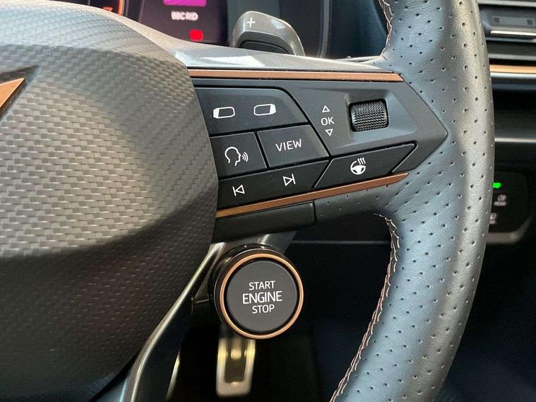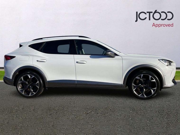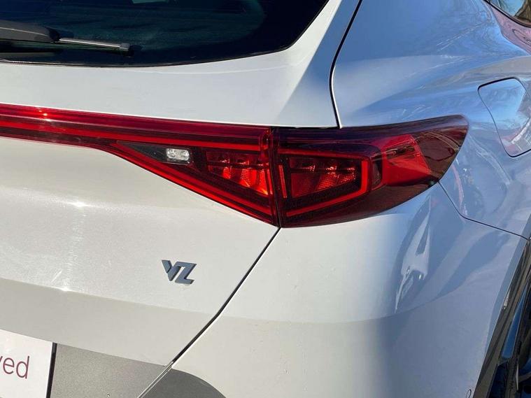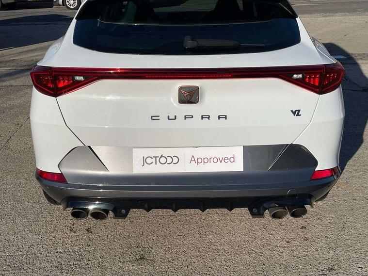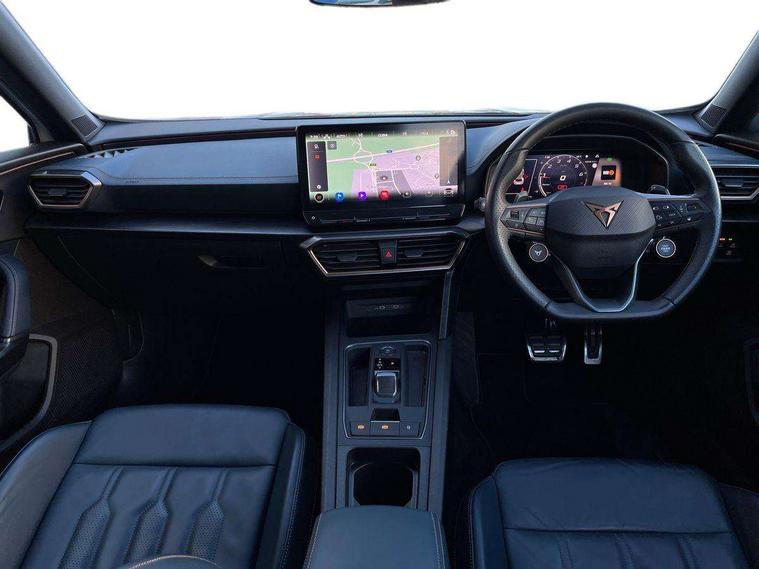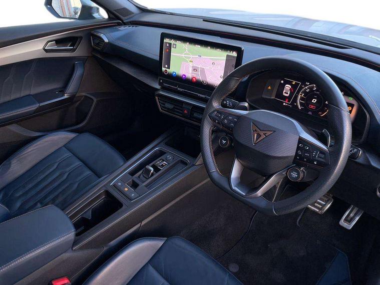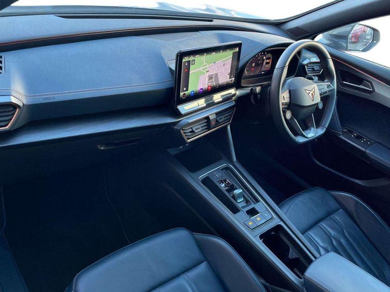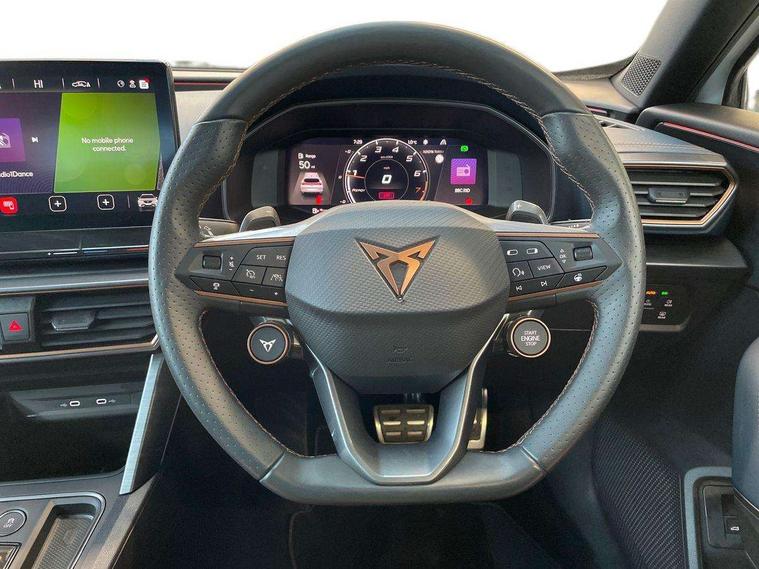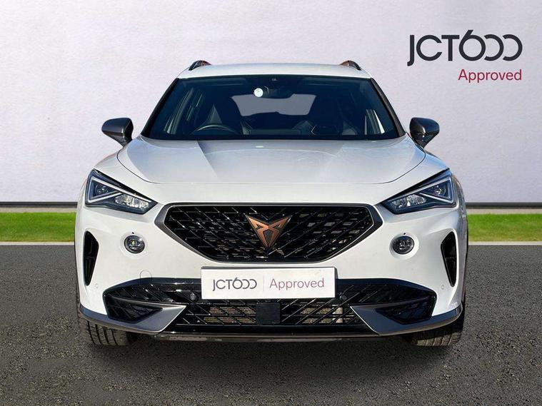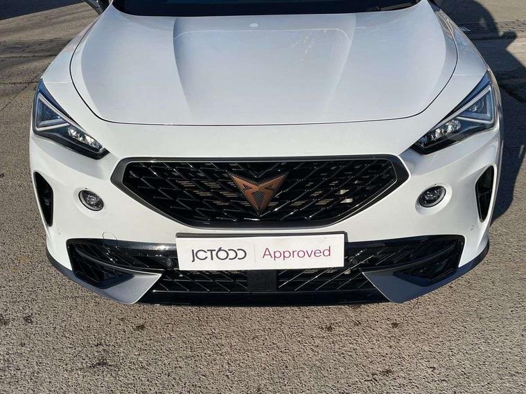 Digital cockpit and configurable dashboard, Driver alert system, Dynamic chassis control with driving profile selection (Comfort, Sport, CUPRA, Individual), Forward collision warning with automatic braking, Lane assist, Navigation system with 12'' Touchscreen Display, Park assist (inc front/rear parking sensors), Predictive adaptive cruise control with speed limiter, Rear view camera, RPM, trip computer, outside temp gauge, instrument light brightness, low fuel warning light, lights on reminder, gearshift indicator, Service interval indicator, Speed sensitive power steering, Start/stop system with regenerative braking, Virtual pedal and electric tailgate, Voice control system, Wireless apple carplay, Wireless phone charger, Electronic locking differential and dynamic traction support, Sports suspension with front shock absoption, 2 front and 2 rear USB type C sockets, Auxiliary input socket, DAB radio, Auto dimming rear view mirror, Body colour door handles, Body coloured bumpers, Dark grey wing mirror, Daytime running light with automatic headlight control and coming home feature, Dynamic headlight range control, Electric front/rear windows, Electrically adjustable heated and folding door mirrors with memory function, Front fog lamps with cornering function, Gloss black roof rails and window surrounds, LED Headlights, LED Taillights with dynamic indicator, Rain sensing wipers, Rear diffuser with twin exhaust pipe on each side, Rear side wing doors, Rear wash/wipe, Sports bumpers, Third brake light, Tinted rear windows, VZ logo rear badging, Welcome lights, 12v power supply in centre console, 12V socket, 12v socket in loadspace, 2 front and 2 rear reading lights, 230V socket, 3 seat bench in 2nd row, 60/40 split rear bench seat with armrest and mechanical seat release, Black headlining, Cupra sports pedals, Dust/pollen filter, Front and rear head restraints, Front centre armrest, Height/reach adjust steering wheel, Illuminated interior front door sills, Illuminated sunvisor with mirror, Isofix, Leather heated multi-function sports steering wheel with start stop, CUPRA mode button and gear shift paddles, Luggage tie-down hooks, Single front passenger seat, Three zone climate control with control panel in rear, Variable luggage/load compartment floor, Wraparound lighting, Genuine Nappa leather Pack - Cupra, Safety and driving pack (XL) - Formentor, 3 point seatbelts on all rear seats, ABS, Brake control system - ESC and brake booster, Child proof door locks, Driver and front passenger airbags with front passenger airbag de-activation, Electronic parking brake, Front and rear disc brakes, Front side curtain airbags, Hill hold control, Public e-call, Seat belt reminder for front and rear seats, Tyre pressure monitoring system, Anti theft alarm system, Keyless entry and start system (KESSY), Locking wheel bolts, Copper and aluminium interior detailing, 19" 'Exclusive' machined sport matte black and silver alloy wheels, Space saver spare wheel,