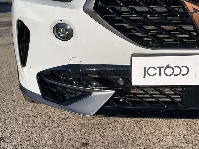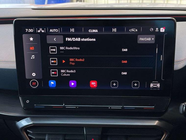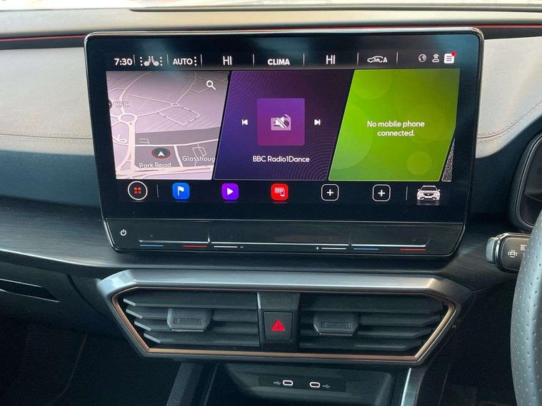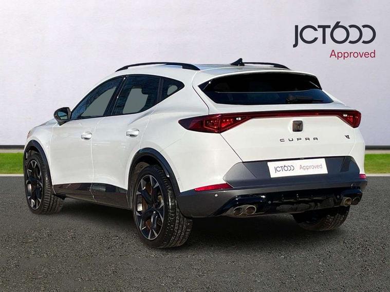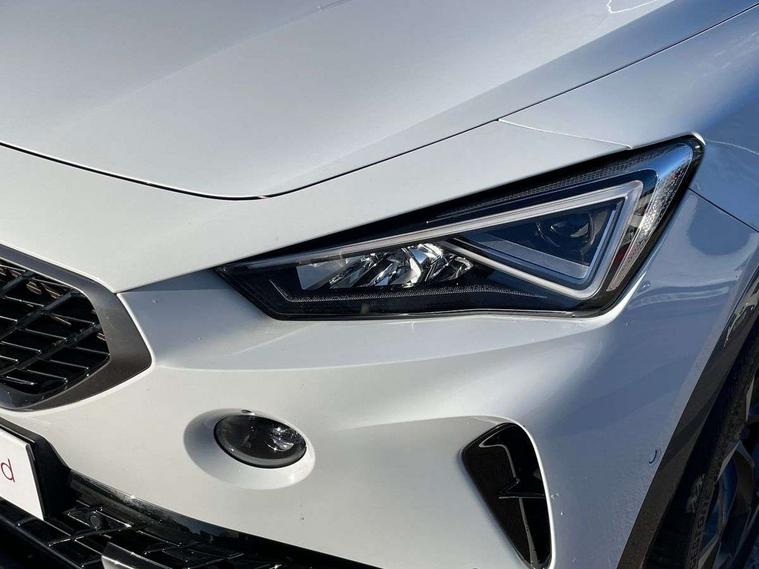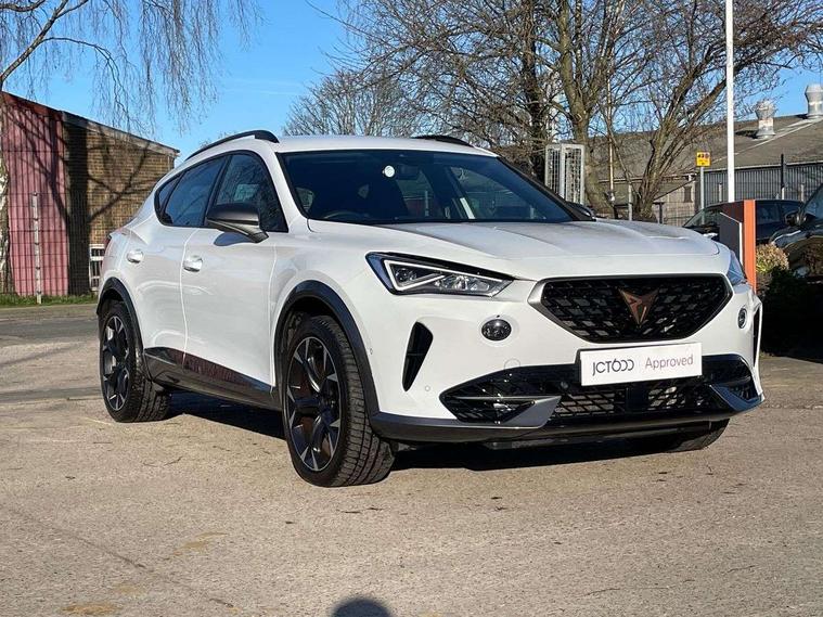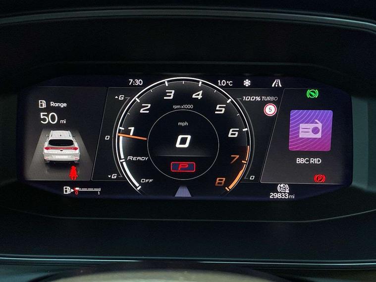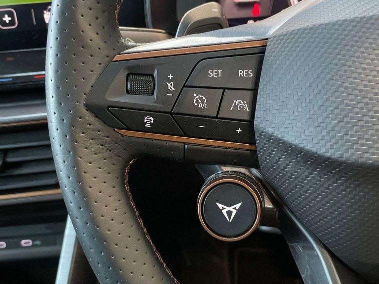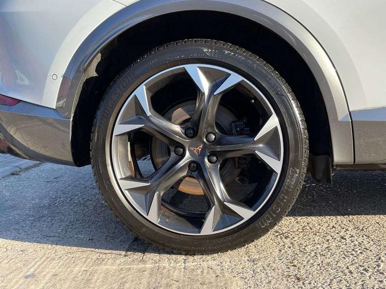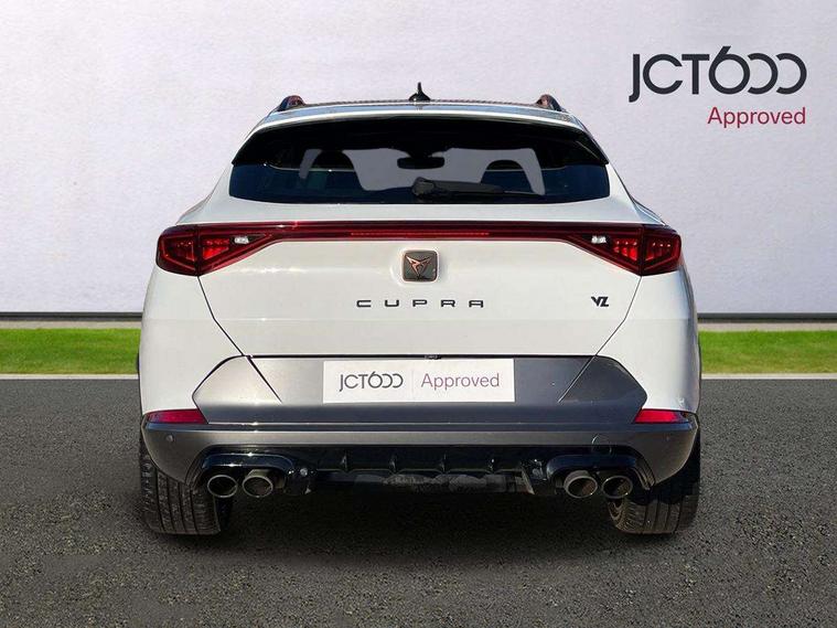 Digital cockpit and configurable dashboard, Driver alert system, Dynamic chassis control with driving profile selection (Comfort, Sport, CUPRA, Individual), Forward collision warning with automatic braking, Lane assist, Navigation system with 12'' Touchscreen Display, Park assist (inc front/rear parking sensors), Predictive adaptive cruise control with speed limiter, Rear view camera, RPM, trip computer, outside temp gauge, instrument light brightness, low fuel warning light, lights on reminder, gearshift indicator, Service interval indicator, Speed sensitive power steering, Start/stop system with regenerative braking, Virtual pedal and electric tailgate, Voice control system, Wireless apple carplay, Wireless phone charger, Electronic locking differential and dynamic traction support, Sports suspension with front shock absoption, 2 front and 2 rear USB type C sockets, Auxiliary input socket, DAB radio, Auto dimming rear view mirror, Body colour door handles, Body coloured bumpers, Dark grey wing mirror, Daytime running light with automatic headlight control and coming home feature, Dynamic headlight range control, Electric front/rear windows, Electrically adjustable heated and folding door mirrors with memory function, Front fog lamps with cornering function, Gloss black roof rails and window surrounds, LED Headlights, LED Taillights with dynamic indicator, Rain sensing wipers, Rear diffuser with twin exhaust pipe on each side, Rear side wing doors, Rear wash/wipe, Sports bumpers, Third brake light, Tinted rear windows, VZ logo rear badging, Welcome lights, 12v power supply in centre console, 12V socket, 12v socket in loadspace, 2 front and 2 rear reading lights, 230V socket, 3 seat bench in 2nd row, 60/40 split rear bench seat with armrest and mechanical seat release, Black headlining, Cupra sports pedals, Dust/pollen filter, Front and rear head restraints, Front centre armrest, Height/reach adjust steering wheel, Illuminated interior front door sills, Illuminated sunvisor with mirror, Isofix, Leather heated multi-function sports steering wheel with start stop, CUPRA mode button and gear shift paddles, Luggage tie-down hooks, Single front passenger seat, Three zone climate control with control panel in rear, Variable luggage/load compartment floor, Wraparound lighting, Genuine Nappa leather Pack - Cupra, Safety and driving pack (XL) - Formentor, 3 point seatbelts on all rear seats, ABS, Brake control system - ESC and brake booster, Child proof door locks, Driver and front passenger airbags with front passenger airbag de-activation, Electronic parking brake, Front and rear disc brakes, Front side curtain airbags, Hill hold control, Public e-call, Seat belt reminder for front and rear seats, Tyre pressure monitoring system, Anti theft alarm system, Keyless entry and start system (KESSY), Locking wheel bolts, Copper and aluminium interior detailing, 19" 'Exclusive' machined sport matte black and silver alloy wheels, Space saver spare wheel,
