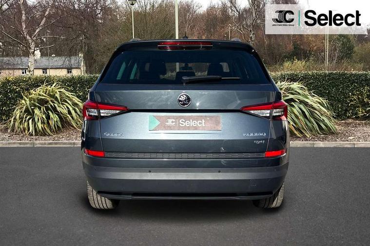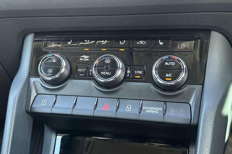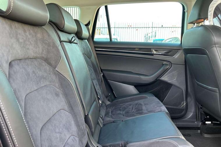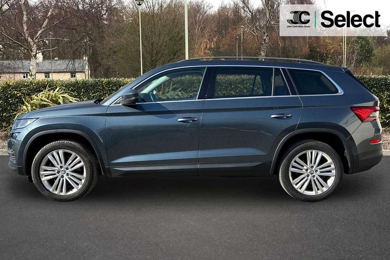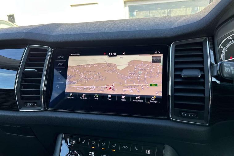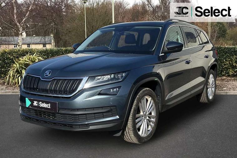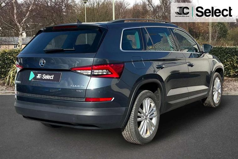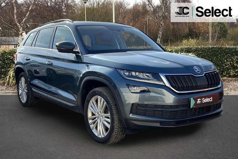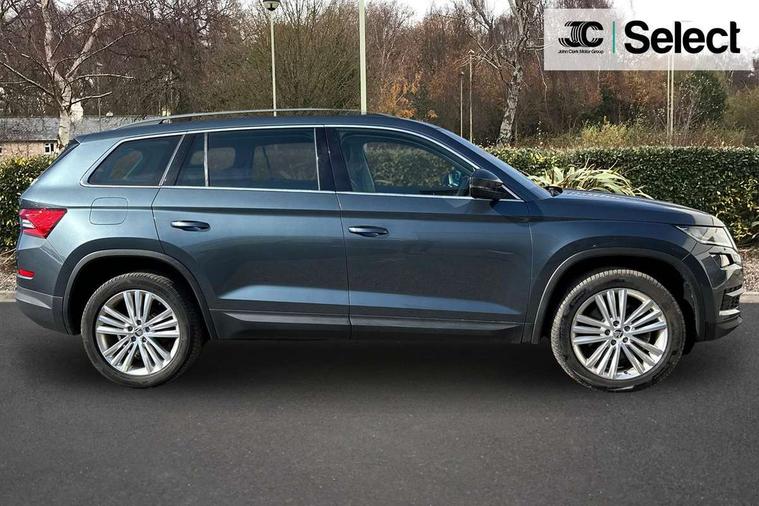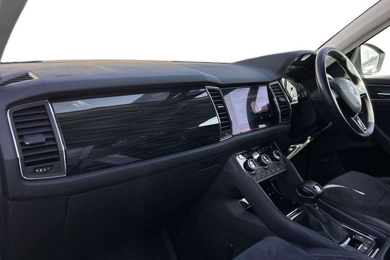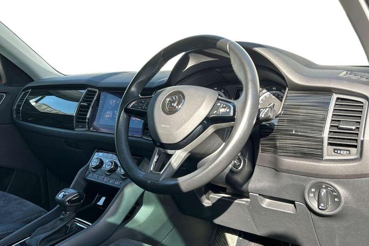 Bluetooth system, Columbus satellite navigation with 9.2" touch screen and integrated Wi-Fi, Digital voice enhancement, Drive mode selector, Exterior temperature gauge, Power tailgate, SmartLink plus, Speed limiter, 8 speakers, Bolero Radio, DAB Digital radio, DVD System, SD card slot, USB connection, Adaptive front lighting system, Aero wiper + intermittent function, Auto dimming door mirrors, Auto dimming rear view mirror, Automatic activation of hazard warning lights, Body colour bumpers, Body colour door mirrors and handles, Electric adjustable/heated/folding door mirrors, Electric front windows, Electric rear windows, Front and Rear door steps, Headlight washers, Heated rear window, High gloss black grille with chrome inserts, LED daytime running lights, LED front fog lights with static cornering light function, LED Headlights, Light assistant (coming home/tunnel light), Rain and light sensors, Rear spoiler, Rear wiper, Sunset privacy glass, Tinted windows, 12V Accessory socket in centre console, 12V power point in luggage area, 3 rear height adjustable headrests, 4 lashing points on luggage floor, 60/40 split fold rear seat back, Centre console with storage/cupholders, Chrome gear shift lever, Chrome inner door handles, Driver's glovebox with lid, Driver's storage box, Folding grab handles with rear coat hooks, Front and rear bottle holders, Front centre armrest with storage compartment, Front/rear courtesy lights, Front/rear reading lights, Height adjustable front seats, Height/tilt adjustable front headrests, Illuminated air conditioned glovebox, Illuminated luggage compartment, Isofix system on outer rear seats, Luggage compartment cover, Luggage nets in boot, Manually adjustable steering column, Passenger side net compartment on centre console, Pollen filter, Rear centre armrest with cupholders, Removable LED light in boot, Storage compartment under front seats, Sunglasses storage, Sunvisors with illuminated vanity mirrors, Ticket holder, Chrome pack - Kodiaq, 3 point front/outer rear seatbelts+pre-tensioners, ABS + EDL + ASR + MSR + ESC, Automatic unlocking of doors in case of impact, Driver and passenger airbags, Drivers knee airbag, Electromechanical parking brake, Front assist including city emergency braking, Front side airbags, Fuel cut off safety device, HBA (Hydraulic Brake Assist), Head airbags, Hill hold control, Passenger airbag deactivate switch, Seatbelt warning, Two tone horn, Tyre pressure monitor, Alarm with interior monitoring and tilt sensor, Anti-theft wheel bolts, Immobiliser, Keyless entry and keyless start, Remote central locking, Tyre repair kit,