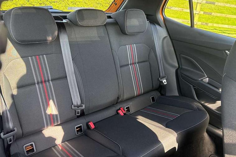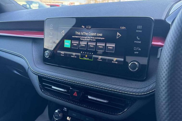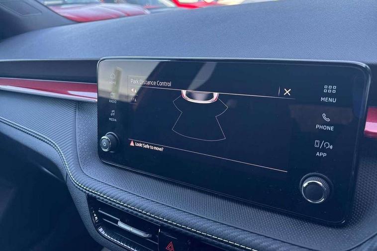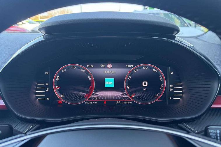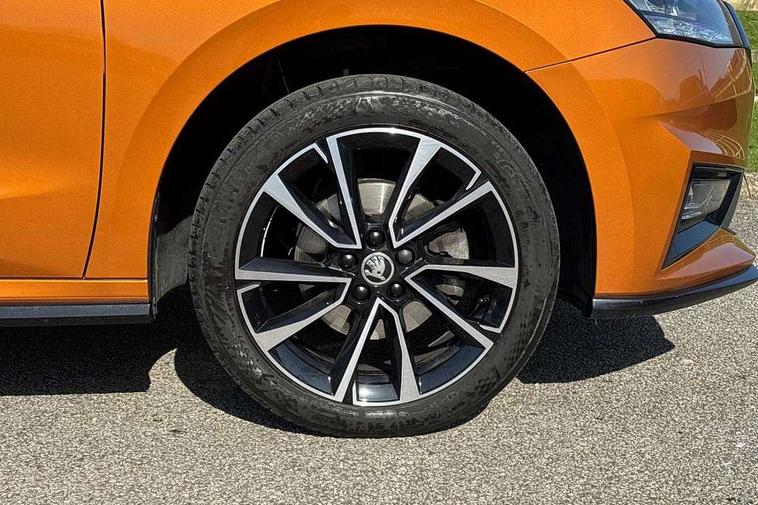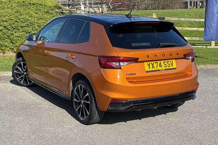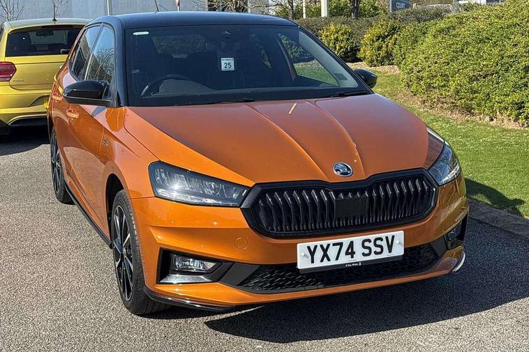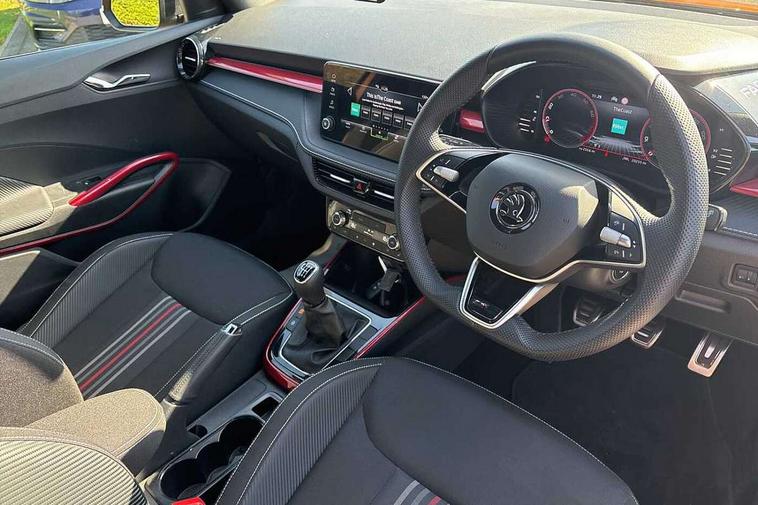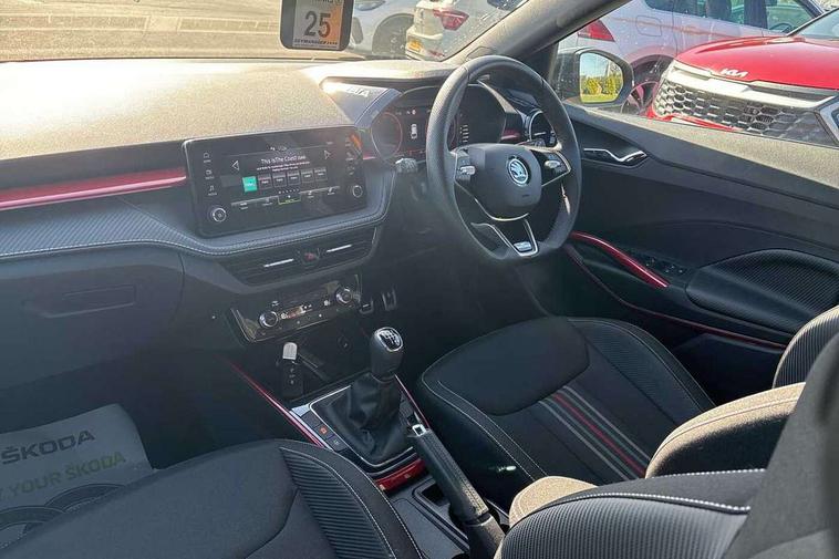 Advanced driver attention and drowsiness monitor, Bluetooth connection, Electromechanical power steering, Exterior temperature gauge, Service interval indicator, Traffic sign recognition, Virtual cockpit with 10.25" colour display, Wireless SmartLink for Apple CarPlay and Android Auto, 6 Speakers (4 in front and 2 in rear), Auxiliary socket for external MP3 player, DAB digital radio reception, Auto dimming rear view mirror, Black radiator grille, Body coloured bumpers, Door mirror integrated indicators, Front and rear electric windows, Front window wiper intermittent control, Headlight range control - Automatic, Ice scraper in fuel cap, LED daytime running lights with coming and leaving home feature, LED rear lights, Monte Carlo badging, Privacy glass, Rear LED fog light, Rear side wing doors, Rear window wiper with washing nozzles, Roof mounted spoiler, SKODA tailgate lettering in black, Sports bumpers, Third brake light, 2 reading lights in front and 2 reading lights in rear, 3 rear headrests, Aluminium pedals, Backrest split and folding, Black headlining, Central console with removable cup holder and storage box, Chrome handbrake release button, Door sills with fabia badging, Dual zone air conditioning with climatronic electronic control, Fabric/artificial leather upholstery, Front centre armrest, Front sports seats, Gearshift knob/handle in leather, Hand brake lever handle in leather, Height adjustable front headrests, Height adjustable front seats, Height adjustable steering wheel, ISOFIX and TopTether anchorage points to the outer rear seats, ISOFIX and TopTether on the front passenger seat, Luggage compartment lighting, Manually adjustable lumbar support in front seats, Metallic painted red central console cover, Metallic red interior door handles, Pollen filter, Rear seat bench unsplit, Single front passenger seat, Sun visors with mirror and airbag label on passenger side, Textile floor mats, Ticket holder, Umbrella in drivers door, 3-point height adjustable front seats belts with pretensioner and force limiter, Automatic warning lights in case of crash, Driver and passengers airbag with switch off function, e-Call+, ESC including ABS, MSR, ASR, EDS, HBA and XDS, Front and rear seat belt warning, FRONT ASSIST (AEB City and AEB Inter Urban), Front side airbags, Head airbags, One tone horn, Pedestrian protection, Three rear 3-points safety seat belts with pretensioner and force limiter including stop function for outer rear seat belts, Tyre pressure monitoring system, Anti-theft alarm system including immobiliser, interior monitoring, backup horn, and towing protection, Central locking with radio remote control, interior controls, SAFE function and 2 foldable keys, Carbon effect door and side trim panels, Carbon effect lower decorative trim with white stitching, Monte carlo air vents, Red metallic upper decorative trim, Anti-theft wheel bolts protection, Super-low rolling resistance tyres,