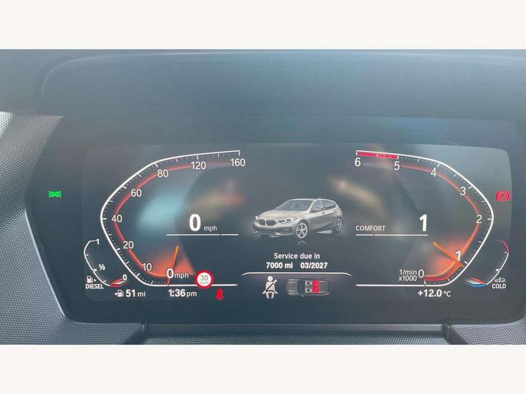 Active guard plus, Attentiveness assist, BMW ConnectedDrive online services, BMW Teleservices, Check Control warning system for monitoring of lights and door/luggage compartment open warning, Cruise control with speed limiter, Eco pro mode, Electric power steering with Servotronic steering optimised at all speed ranges, Front axle single joint with specific axle kinematics to minimise drive influences on steering + provide increased rigidity agile driving behaviour, Integrated owners handbook, Lane departure warning system, Oil sensor for level and grade, On board computer, Optimum shift indicator, Personal Profile, Pull away assistant, Rigidly mounted rear subframe - Multi link construction with separate spring / damper configuration and excellent driving characteristics, Speed limit Info including no-overtaking indicator, AdBlue tank, Aluminium lightweight construction, Anti roll bar front and rear, Balancer shaft, Diesel particulate filter, Drive Performance Control, Electronic differential lock, Single turbo charger with variable vane geometry, Suspension with twin tube gas filled shock absorbers with degressive characteristic curve, DAB Digital radio, Auto dimming rear view mirror, Automatic windscreen wipers and automatic headlight, Body colour door handles, Body colour mirror caps, Body colour roof trims, Chrome exhaust twin tailpipes round 90mm in left, Direction indicator side lights in exterior mirrors, Electrically adjustable exterior mirror with mirror adjustment switch on drivers armrest and aspheric on driver side, convex on passenger side, Fading support, Follow me home headlights, Front and rear bumper system with replaceable deformation elements, Front and rear electric windows with open and close fingertip control, anti trap facility and comfort closing, Front bumper in Body colour with exclusive Sport air inlets finished in High gloss Black, Front door sill finishers in black plastic with BMW designation in metallic look, Green tinted heat protection glazing, High gloss shadowline window frame, Recess cover mirror frames and B/C pillar embelisher trim, High level third brake light, Integrated front windscreen with washer jets, Kidney grille in chrome frame with highgloss black struts, LED daytime running lights, LED eyebrow turn indicators, LED front fog lights, Lightweight engineering, Manual headlight beam throw control, Manual headlight levelling, Matt black air guide grilles, Matt black wheel arch trim, Model designation on electric bootlid, Nearside reverse light in rear light cluster, Preparation for high beam assistant, Rear bumper in Body colour with exclusive Sport design elements finished in High gloss Black, Rear fog lights, Rear side wing doors, Rear window wiper, Shark fin antenna, Trailer stabilisation logic, Visible VIN plate, Welcome lighting, 12V power socket in front centre console with blanking plug, 3 rear seat head restraints, 3 seat bench in 2nd row, 3 spoke sports leather steering wheel in black leather with black stitching and decorative finisher in pearl chrome + gearshift lever knob in leather, Black boot net with lashing eyes, Cargo function on 2nd seat row, Child seat ISOFIX attachment for two outer rear seats and front passenger seat with anchorage points, Conditioned based service, Driver and front passenger backrest net on rear, Driver side folding compartment in instrument panel, Folding rear clothes hook, Four grab handles integrated in roof lining, Front and rear door pockets with bottle holders, Front and rear side armrest integrated into door trim, Front armrest, Front sports seats, Glove compartment, Height adjustable front head restraints, Luggage compartment for bag hooks on left and right, foldable luggage compartment liner and four lashing eyelets, Manual adjust steering wheel, Multi-function controls for steering wheel, Single front passenger seat, Storage compartment in centre console, Storage compartment in luggage compartment, Stowage of the parcel shelf in luggage compartment trim, Sun visors with vanity mirrors and insert tab, Two front centre console cupholders, Two zone automatic air conditioning, Type C two USB ports in rear centre console, Velour floor mats, BMW live cockpit professional pack- 1 Series, Connected pack professional - 1 Series, Interior lights pack - 1 Series, 2 tone horn, 3 point seatbelts on all seats, front pyrotechnic belt tensioners, stopper and belt force limiters, rear coded belt buckles, Airbags - Front driver/passenger, front and rear curtain head protection, front side, manual deactivation of front passenger airbag, Anti lock braking system (ABS) with brake assist, BMW emergency call, Brake drying, Braking readiness, Child proof locking system in rear door, City braking function, Comfort modes, Cornering brake control, Crash sensor activating of airbags, Unlocking doors, hazard warning lights, interior light, safety battery terminal, Driver and front passenger seat belt security check, Dynamic stability control + (DSC+), Dynamic Traction Control - DTC, Electrically operated hand brake, Front and rear disc brakes, Seatbelt warning, Side impact protection, Tyre pressure monitoring system, Warning triangle and first aid kit, Central locking switch for all doors, fuel filler cap and luggage compartment, Deadlocking function system to all doors, Drive away locking system on all doors and luggage compartment with de-activated in iDrive settings, Incorrect fuel protection system, Locking wheel bolts, Remote central locking with two Integrate key, one button for opening and closing all lock, open and close window, button for open luggage compartment, Start/stop button illuminated in centre console with keyless engine start and auto start stop deactivation button, Thatcham Cat.1 alarm and immobiliser, Wheel slip limitation close to the actuator (ARB), Contrast stitching on instrument panel, Illuminated Berlin interior trim, Electrically powered 12V compressor, Reduced rolling resistance tyres,