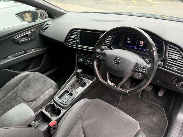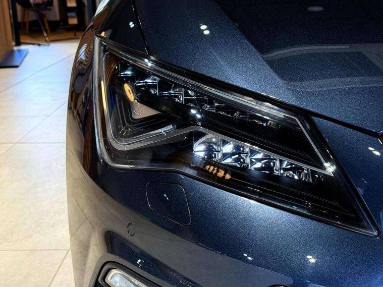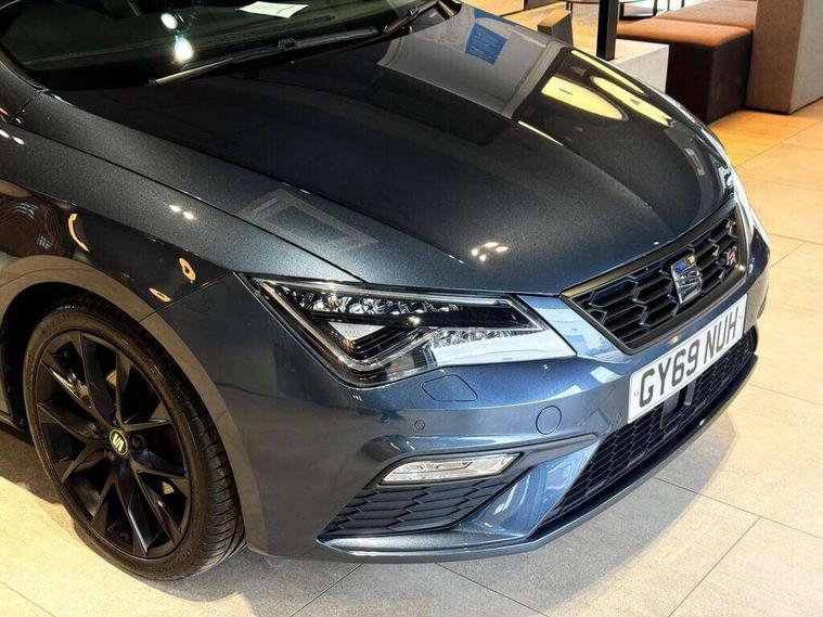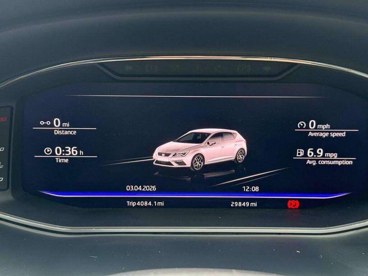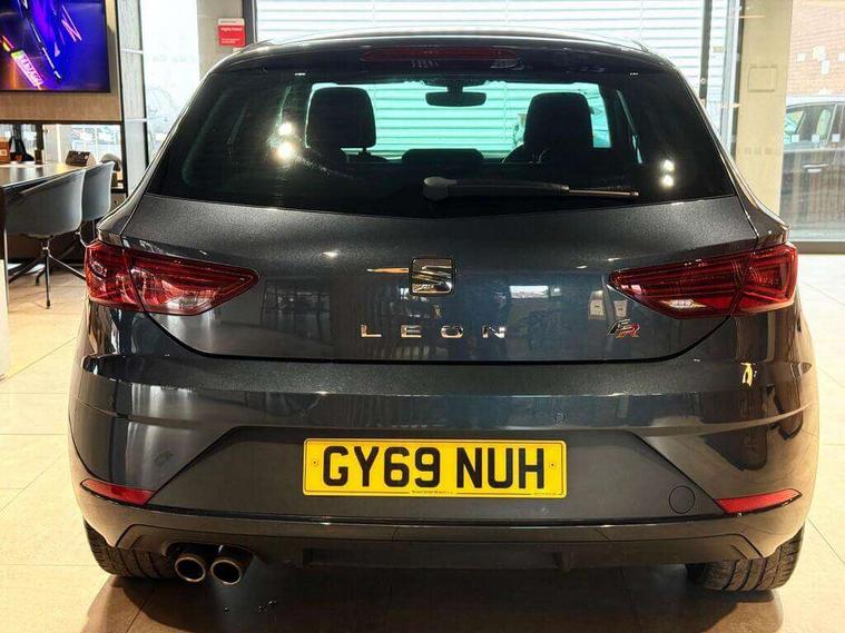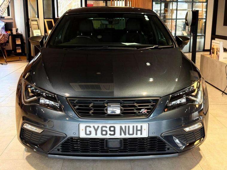 Digital cockpit, Electro-mechanical power steering, Front and rear parking sensors, Front assist with pedestrian protection, Full Link Smartphone Integration with Mirror Link, Apple Car Play, Google Android Auto with USB cable for Apple and Android compatibility, Media system plus with 8" display, 4 USB, 8 speakers, CD, voice control, DAB, bluetooth and handsfree, steering wheel mounted audio and phone control, Navigation system 3D map display, high resolution colour driver display, two SD card slots, RPM, trip computer, outside temp gauge, instrument light brightness, low fuel warning light, lights on reminder, gearshift indicator, SEAT drive profile with 4 modes (Eco/Normal/Sport/Individual), throttle response and gearshift mode, SEAT logo boot release, Service interval indicator, Lowered sports suspension, XDS electronic differential lock, Auxiliary input socket, SEAT USB media cable, Black front grille, Body colour door handles, Body coloured bumpers, Dark tinted rear windows, Electric folding door mirrors, Electric front/rear windows, Electrically adjustable and heated door mirrors, Exclusive FR front and rear bumpers, Full LED headlights with LED day time running lights + LED rear tail lights + LED licence plate lights and LED front and rear fog lights, High gloss black finish B and C pillars, Illuminated aluminium front door sill with FR logo, Matt black door mirrors with integrated LED indicators, Matt black front grille frame, Rear wash/wipe, Visible twin exhaust tailpipes, 12v power point in centre console, 60/40 split folding rear seat with armrest, Additional heating and ventilation outlet in rear of centre console, Black interior roof, Boot storage net, Cargo rings in boot, Driver and passenger seat height adjust, Driver and passenger sun visor, covered and illuminated mirror, driver sun visor with card holder, Driver seat lumbar adjustment, Dual zone climate control, Dust/pollen filter, Flat bottomed perforated leather steering wheel with red stitching and FR logo and leather gear knob, Front centre armrest with storage compartment, Front cupholders x 2, Front passenger seat lumbar adjustment, Front seatback storage pockets, Front sport seats in microsuede, Front/rear floor mats, Height adjustable front and rear headrests and third rear headrest, Height/reach adjust steering wheel, High centre console with integrated box & cup holder, rear air outlet, with armrest in front seats, ISOFIX points in outer rear seats with top tether anchorage points, Luggage tie-down hooks, Multi-colour ambient interior lighting, Steering wheel gearshift paddles, Storage box under drivers and passenger seat, Convenience pack+ - Leon, Winter pack - Leon, 3 point seatbelts on all rear seats, ABS, traction control system, electronic stability control, Child proof door locks, Driver and front passenger airbags with front passenger airbag de-activation, front side, curtain, driver knee airbags, EBA, Electric handbrake, Electronic parking brake with auto hold, Front seatbelt pretensioners, Front seatbelt reminder, Hill hold control, Multi-Collision braking, Tyre pressure monitoring system, 2 folding remote keys with window open/close function and boot opening/door mirror folding function, Central locking fuel filler cap, Engine immobiliser, Locking wheel bolts, Remote central locking + deadlocks, Volumetric alarm with back up horn, Chrome interior detailing,