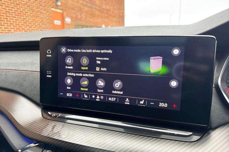 1x USB Type C port in rear view mirror (charging only), 2x USB Type C ports in rear of front centre armrest (charging only), Bluetooth system, Columbus satellite navigation with 10" touchscreen display, Driver fatigue sensor, E mode button for electric/hybrid drive, eCall emergency system, Front and rear parking sensors with manoeuvre assist, Front assist system, Progressive dynamic steering, Smartlink (includes android auto and mirrorlink), Speed limiter, Turn Assist, Unique iV instrument panel, Virtual Cockpit - 10.25" digital display, Voice control system, Wireless SmartLink for Apple Car Play, 10 amp mains UK 3 pin charge cable mode 2, 16 amp AC charge cable for wallbox/charge points mode 3, E-noise generator for electric drive with noise emitted upto speed of 50km/h, Front and rear stabilizers, 2x USB Type C ports (for charging and data transfer), 8 Speakers, DAB Digital radio, Aero front windscreen wipers with intermittent function, Auto dimming rear view mirror, Black roof rails, Body colour door handles, Chrome exhaust tailpipes, Door sills with vRS logo, Electric front and rear windows, Exterior gloss black sports styling including front grille, side strip, window surrounds, door mirror and badging, Full LED Matrix headlights with AFS and cornering front fog lights, Headlight washers, Heated rear windscreen, High level third brake light, Ice scraper in fuel cap, LED daytime running lights, Rain and light sensors, Rear fog light on one side, Rear privacy glass, Rear side wing doors, Rear spoiler, Rear window wiper, Unique iV badge on tailgate, 3 seat bench in 2nd row, 4 foldable roof handles, Aluminium pedals, Black headlining, Black microsuede padded dash panel with red contrast stitching, Charging socket cover on front left fender, Chrome inner door handles, Front centre armrest, Front head restraints, Heated front seats, Illuminated glovebox, Leather trimmed gearshift lever, Luggage compartment lighting with two side lamps, Mechanical rear seat release, Parcel shelf - rolling, Single front passenger seat, Sport button for hybrid drive delivering maximum system performance, Storage compartment for charging cables under the luggage compartment mat, Sunglasses storage, Textile floor mat set, Three spoke leather sports multifunction steering wheel with paddles, Ticket holder, Umbrella in door panel, Unsplit rear bench seat and split folding backrest, LED interior light pack - Octavia, 3 point front/outer rear seatbelts+pre-tensioners, Alarm with interior monitoring, tilt sensor and back up horn, Automatic door unlocking in case of crash, Automatic fuel cut off in case of crash, Automatic warning lights in case of emergency braking, Curtain airbags and front side airbags, Driver and front passenger airbags, Drivers knee airbag, Electronic parking brake, Emergency call and proactive services, ESC including ABS, EBV, MSR, ASR, EDS, HBA, DSR, Front and rear disc brakes, Front central airbag, Hill hold control, Hill start assist, ISOFIX on front passenger seat and outer rear seats, Manual rear child locks, Passenger airbag deactivate switch, Red brake calipers, Two tone horn, Tyre pressure monitor, Visual and acoustic seat belt reminder, Warning reflectors in front door, Door locks with immobiliser, Keyless entry and start/stop including rear doors, Remote central locking, Carbon optic decorative inserts, Gloss black air vent surrounds, Unique decorative door sills front and rear, 19" Altair anthracite alloy wheels, Tyre repair kit,