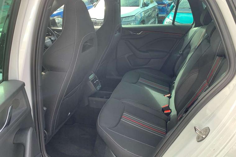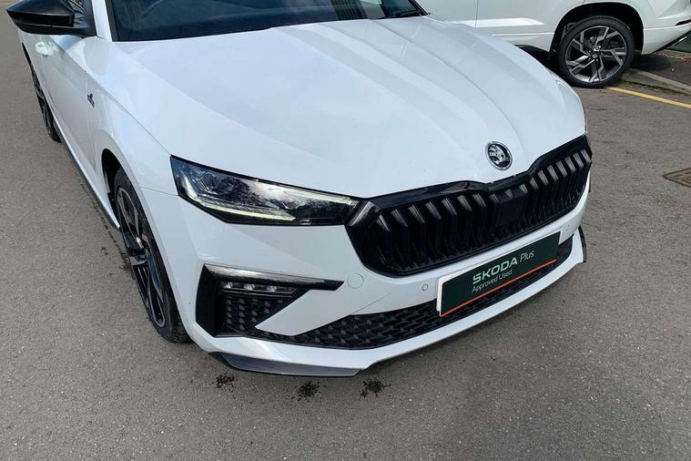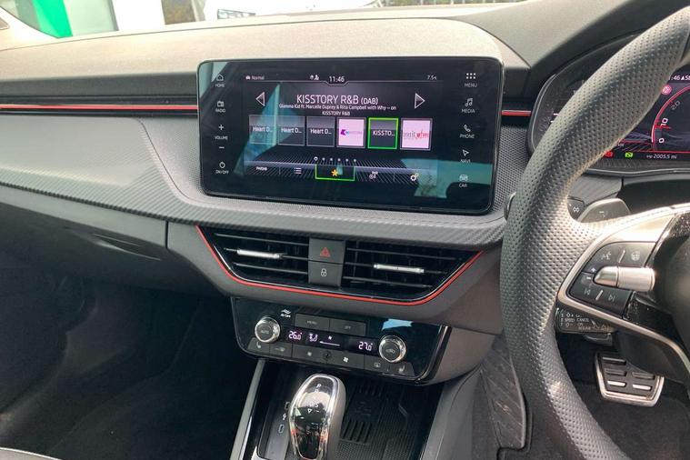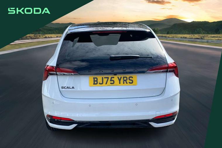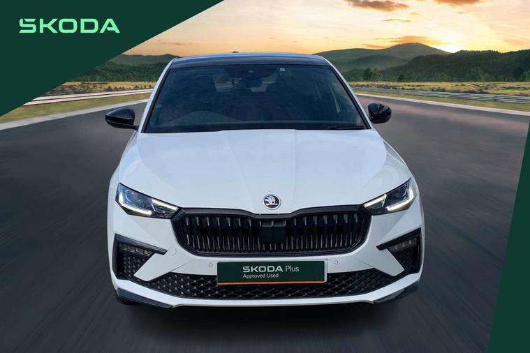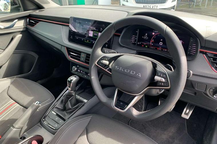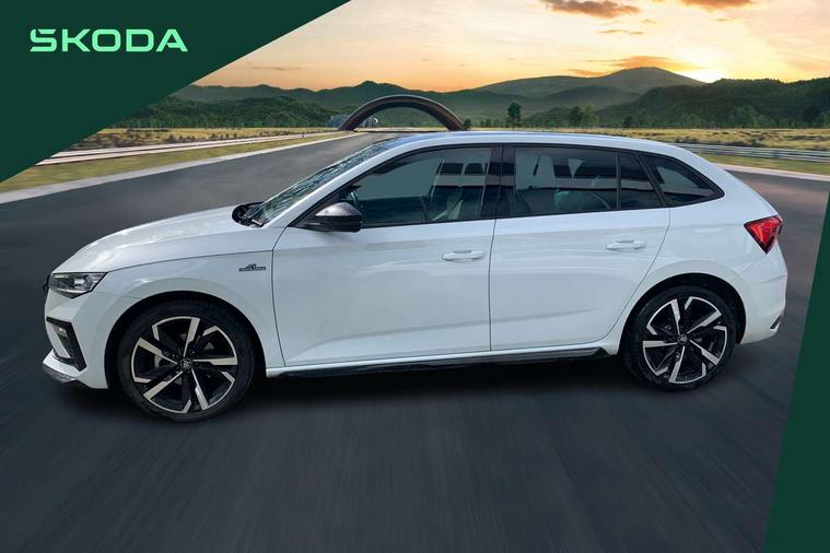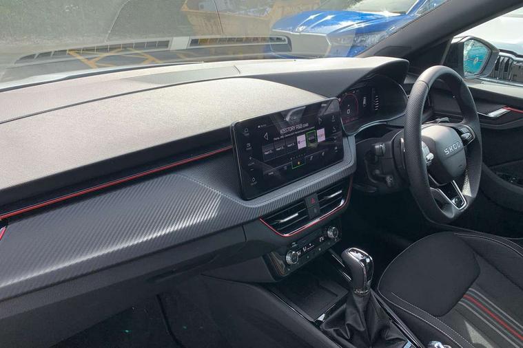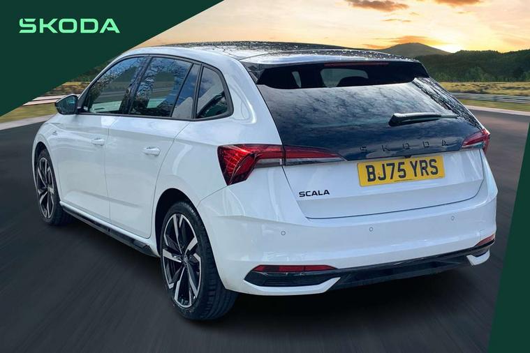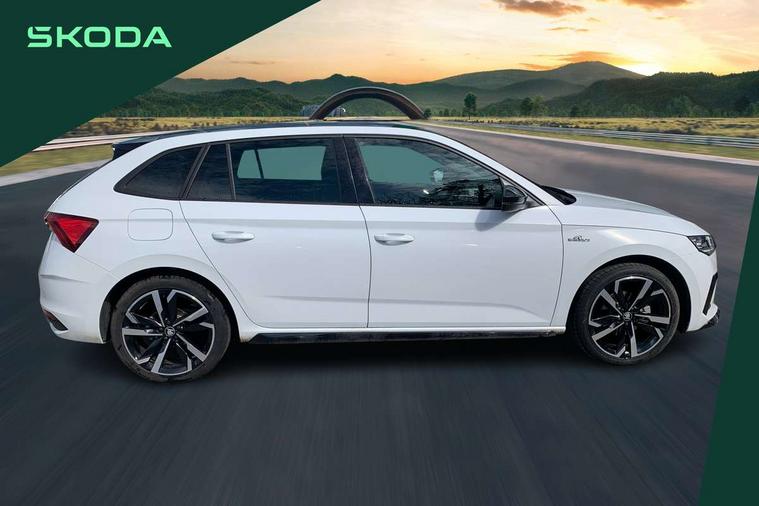 Advanced driver attention and drowsiness monitor, Bluetooth, e-Call (emergency call), Front assist system, PAS, Rear parking sensors, Rear view camera, Speed limiter, Tailgate, Traffic sign recognition, Virtual Cockpit - 10.25" digital display, Voice control system, Wireless smartlink, Drive mode select with Sport Chassis Control and ECO mode, 4 USB C ports, 8 Speakers, 9.2" Skoda navigation display, DAB radio, Auto dimming rear view mirror, Automatic headlight control with manual coming and leaving home feature, Automatic intermittent wipers, Black door mirrors, Black lettering on boot lid, Black radiator grille, Black rear diffuser, Black roof spoiler, Black window frames, Body colour bumpers, Body colour door handles, Extended tailgate glass, Front and rear electric windows, Heated rear window, LED 3rd brake light, LED daytime running lights, LED high beam, LED low beam, Light sensors, Monte carlo plaque, Panoramic glass roof, Privacy glass, Rear LED fog light, Rear side wing doors, Rear wiper, Tinted windows, Unique dark chrome design logo on alloy wheels, 12V socket in luggage compartment, 3 seat bench in 2nd row, Aluminium pedals, Ambient lighting in white/red, Black / White armrest stitching, Black roof headlining, Cargo elements, Chrome inner door handles, Door inserts in art.leather carbon, Driver and passenger sun visors with vanity mirror, Dual zone climate control, Front and rear roof lights, Front centre armrest, Front head restraints, Height adjustable driver seat, Height adjustable passenger seat, Ice scraper, Illuminated glove compartment, Inner circulation control with pollen filter, ISOFIX for front passenger seat, Isofix preparation for back seats, Leather gearknob and handbrake lever, Luggage net under rear parcel shelf, Manual lumbar support for front seats, Monte Carlo cloth upholstery, Net package and top tether hooks in boot space, Pocket on the back of both front seats, incl. mobile phone pockets, Rear centre armrest, Red hotstamping, Single front passenger seat, Skoda lettering on steering wheel, Sport seats, Textile floor mats, Third rear headrest, Ticket holder, Top tether for front passenger seat, Umbrella in driver's door, Light and view plus pack - Scala, 3x3 point rear seatbelts, ABS, Child locks, Curtain airbags and front side airbags, Disc brakes, Driver and front passenger airbags, ESP, Hill hold control, Manual leather parking brake, One tone horn, Passenger airbag switch off function, Seatbelt reminder for driver and front passenger, Tyre pressure monitoring system, Anti theft alarm system with interior monitoring, backup horn and towing protection, Anti-theft wheel bolts, Remote central locking with 2 remote folding keys, SAFE function for remote central locking, Carbon effect decorative inserts, 18" Ursa black diamond cut alloy wheels,