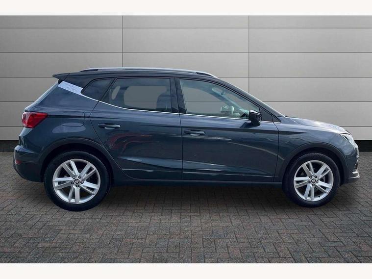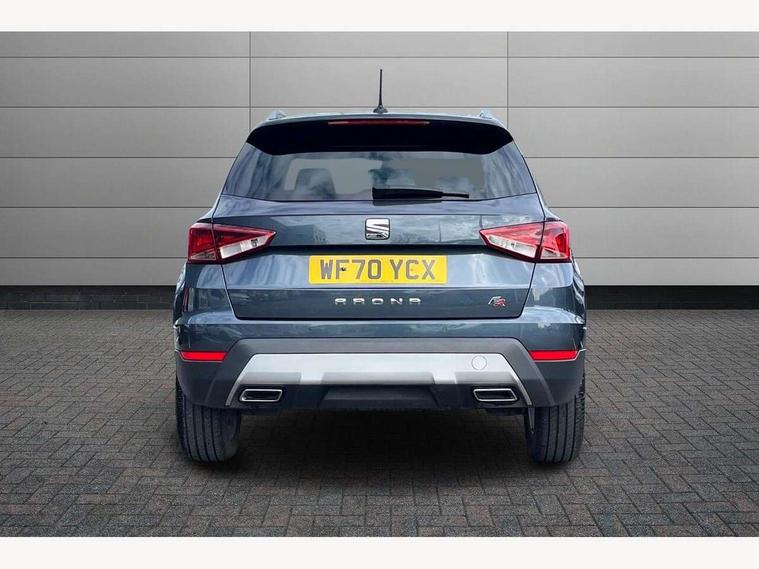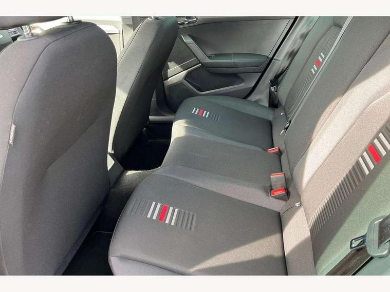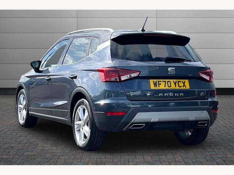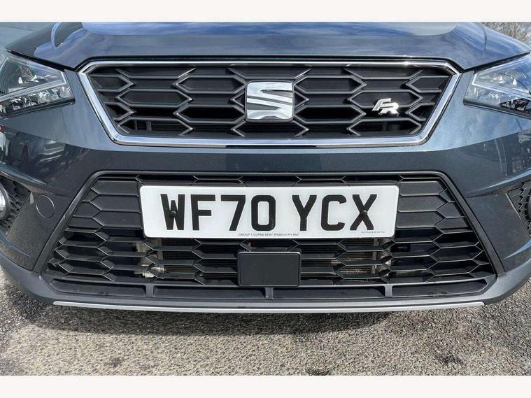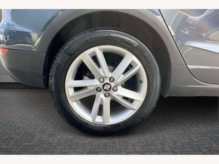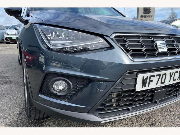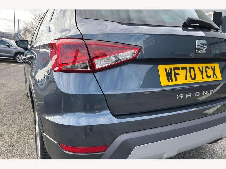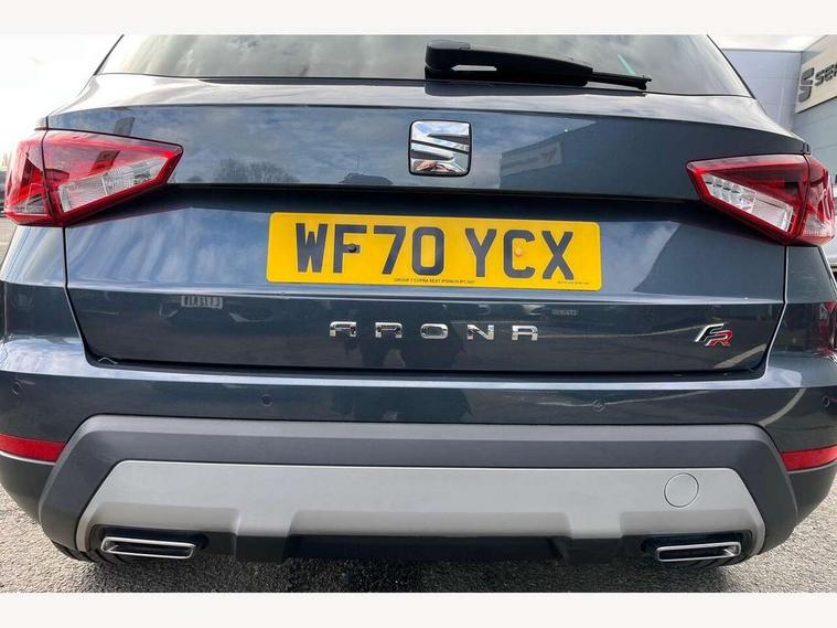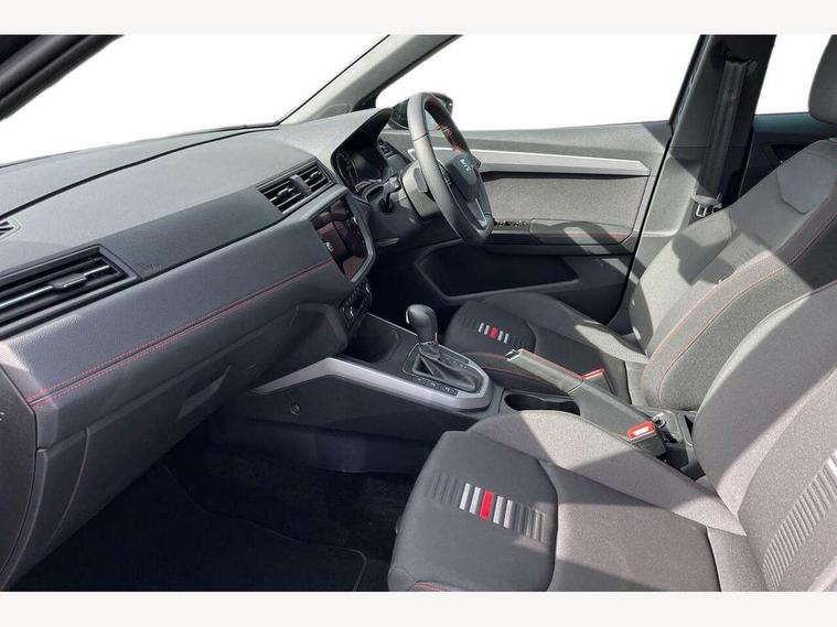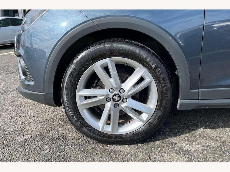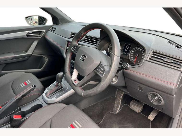 'Lights On' Reminder warning buzzer, Cruise control and speed limiter, Digital clock, Electric speed sensitive power steering, Full Link Smartphone Integration with Mirror Link, Apple Car Play, Google Android Auto with USB Type C cable for Apple and Android compatibility, Low fuel warning light, Outside temperature display, Rear parking sensor, RPM counter, Seat connect with safety, service, remote and online, SEAT Drive profile - Four different models normal-sport-eco-individual, steering response, throttle response and gear shifts mode, Trip computer, Sports suspension, 6 speakers, Bluetooth interface for hands free and audio streaming, DAB digital radio and AM/FM radio, Steering wheel mounted audio controls, Anti theft roof antenna, Auto dimming interior rear view mirror, Automatic activation of hazard warning lights, Automatic headlights, Body coloured bumpers, Body coloured door handle inserts, Chrome front grille frame, Chrome roof rails, Chrome window trim, Coming/leaving home lighting function, Dark tinted rear windows, Electric front/rear windows with one touch/auto up/down, Electrically adjustable, heated and folding door mirrors, Full LED headlights dipped and mainbeam + front and rear fog lights, LED daytime running lights, LED rear tail lights and licence plate lights, Protective side mouldings, Rain sensing wipers, Rear window wash/wipe, Roof colour door mirrors, Twin exhaust pipe styling hidden exhaust pipe, Visible VIN plate, Windshield wiper with intermittent control and potentiometer, 2 cupholders, 60/40 split folding rear seat, Aircare filter, Black interior roof, Double boot floor, Driver sunvisor with covered mirror + card holder, Dual zone climate control, Front courtesy light with front reading lights, Front sport seats, Gear shift indicator, Height adjustable front seats, Height/reach adjustable steering column, Illuminated boot, Instrument lighting with brightness control, Interior light in footwell, central console and door panel, ISOFIX points in outer rear seats with top tether anchorage points, Multi-colour ambient interior lighting, Nora cloth upholstery, Passenger sunvisor with vanity mirror, Perforated flat bottomed leather steering wheel/gear knob/handbrake with red stitching and FR logo, Steering wheel mounted gearshift paddles, Two front and three rear height adjustable headrests, Connectivity pack plus - Arona, Interior chrome pack - Arona, 3 point seatbelts on all rear seats, ABS, Active front headrests, Child locks on rear doors, Driver and front passenger airbags with front passenger airbag de activation, front side and curtain airbags, Electronic stability control, Emergency Brake Assist (EBA) and front assist, Front and rear seatbelt reminder, Hill hold control, Multi-Collision braking, Tiredness recognition system, Traction control, Tyre pressure monitoring system, 2 folding remote keys with window open/close function, Alarm with back-up horn, Electronic engine immobiliser, Locking wheel bolts, Remote central locking + deadlocks, Tow away protection, Interior chrome line trim, Leatherette dashboard, 17" Dynamic alloy wheels,