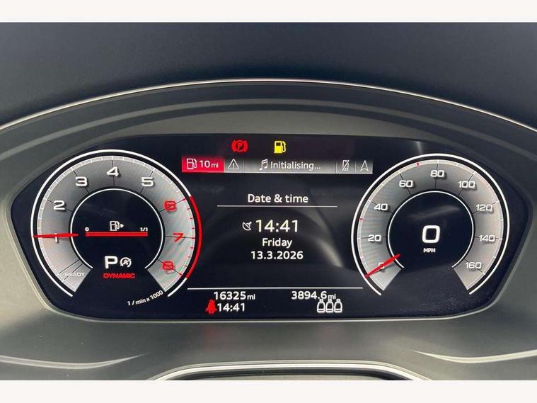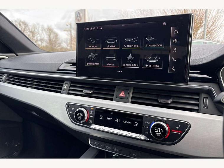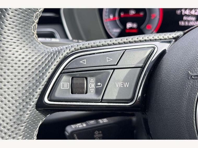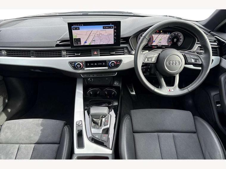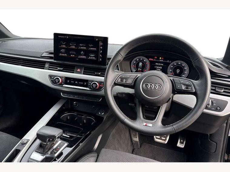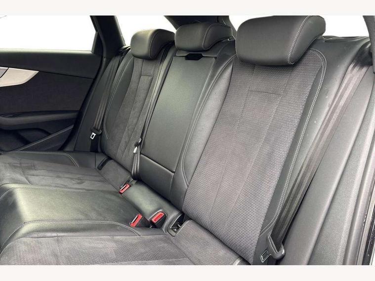 Audi connect safety and service (e-call), Audi connect with Amazon Alexa Integration, Audi drive select, Audi smartphone interface, Audi virtual cockpit, Automatic start-stop system with coasting functionality and efficiency programme, Bluetooth interface, Electromechanical power steering, Email, calendar and text messages displayed via MMI, MMI Navigation plus with MMI touch includes 10.1" high resolution colour MMI display, 3D map, Power operated tailgate, Voice control system, 54 litre fuel tank, Sports suspension lowered by 23mm, 2 USB charging ports, 8 passive loudspeakers, DAB digital radio reception, Aluminium roof rails, Auto dimming rear view mirror, Body colour door handles, Body colour front spoiler lip, Body colour side sill trim, Body coloured door mirrors, Electrically folding auto dimming/adjustable/heated door mirrors with LED side indicators and kerb view function for passenger side, Grained matt black side air inlets with matt aluminium silver inlay, High beam assistant, Honeycomb structure radiator grille in grained matt black, LED headlights with LED rear lights + dynamic rear indicators + headlight adjustment and high beam, turning light + LED daytime running lights, LED third brake light, Matt aluminium silver tailpipe trim, Privacy glass, Rain and light sensors, Rear side wing doors, Rear wiper, S Line badges on the front wings, S line front and rear bumpers with side skirts, S Line rear diffuser in matt anthracite black with trim strip in matt aluminium silver, S Line roof edge spoiler, Variable intermittent front wash/wipe, Windscreen with acoustic glazing, 3 spoke high multi-function sports leather steering wheel grips in perforated leather with S badging including paddle shift, 4 way electric lumbar support for driver and front passenger, 40/20/40 split folding 3 rear seat bench in 3 parts with rear centre armrest, Black cloth headlining, Black perforated leather gearknob, Contrast stitching on seats, steering wheel and gear lever gaiter, Deluxe 3 zone electronic climate control, Door sill trims with aluminium inlay, Electric load area cover, Front and rear head restraints, Front centre armrest, Heated front seats, Illuminated door sill trims with S logo, ISOFIX child seat mounting and top tether, Manual seat adjustment, Single front passenger seat, Stainless steel pedals and foot rest, High gloss package - A4, LED Interior light pack - A4/S4, 3 rear seatbelts, 6 airbags - Driver, front passenger, curtain and side windows, Electronic Stabilisation Control (ESC) including ABS, ASR and EDL, Hill hold assist, Multi collision brake assist, Pop-up bonnet for pedestrian protection, Pre sense city, Rear door child safety locks, Seatbelt monitoring, Warning triangle and first aid kit, Anti theft alarm, Anti theft wheel bolts, Central locking, Keyless Go, Matt brushed aluminium inlays, Tool kit, Tyre repair kit,
