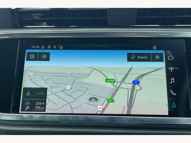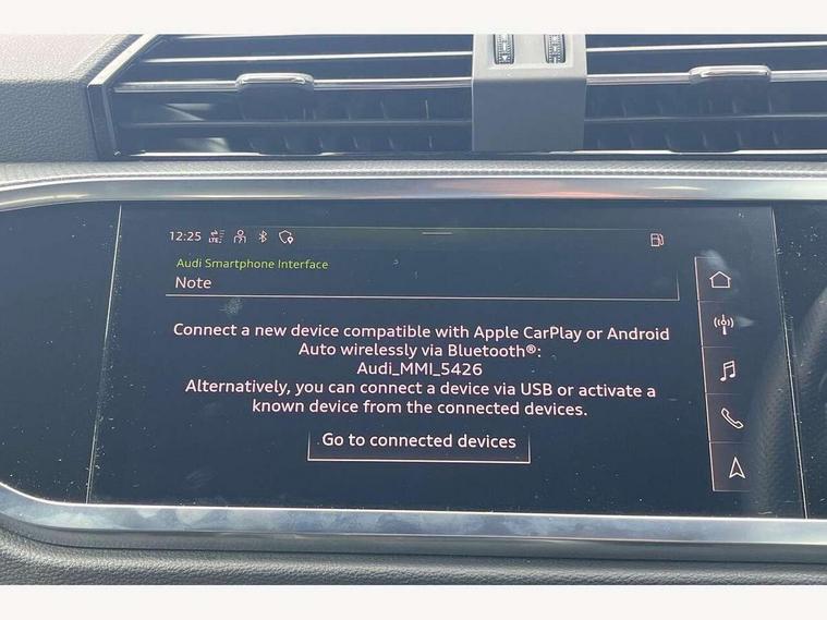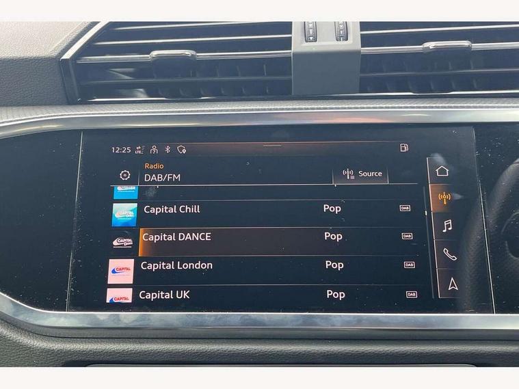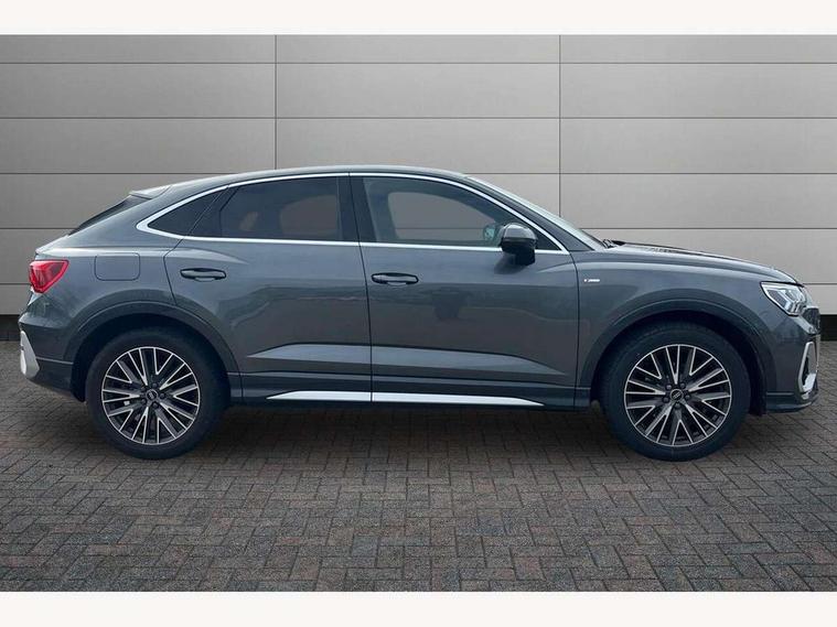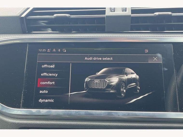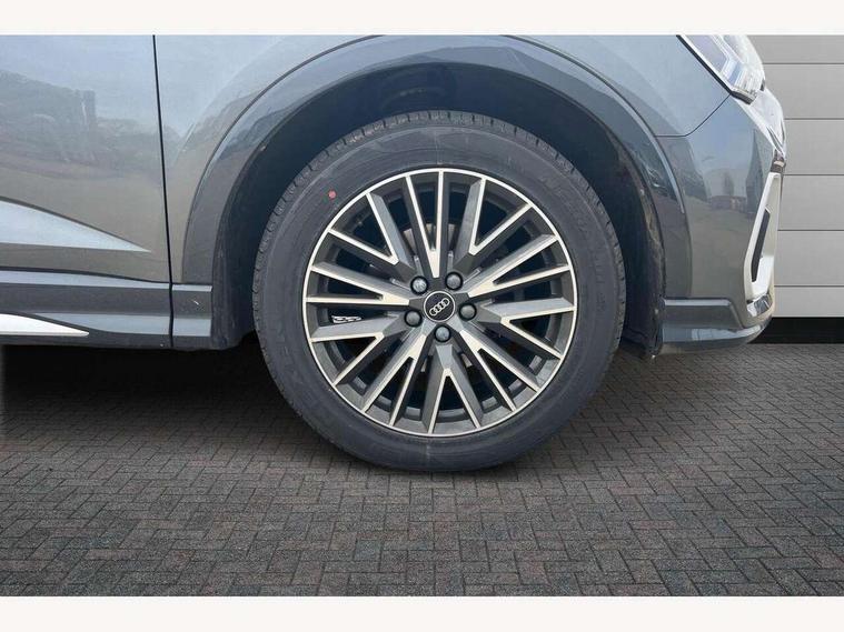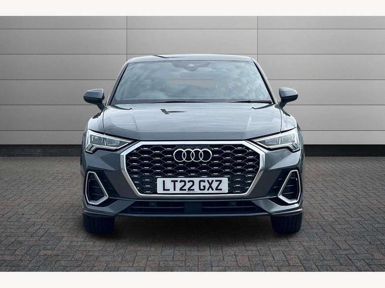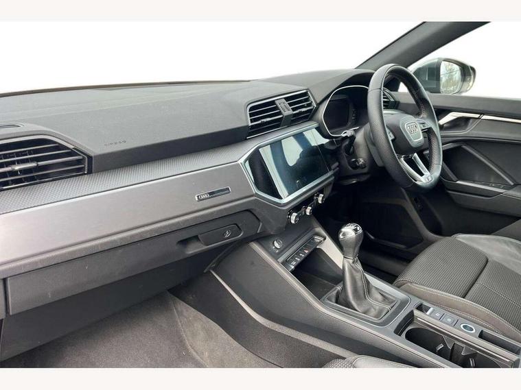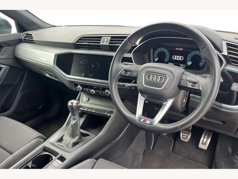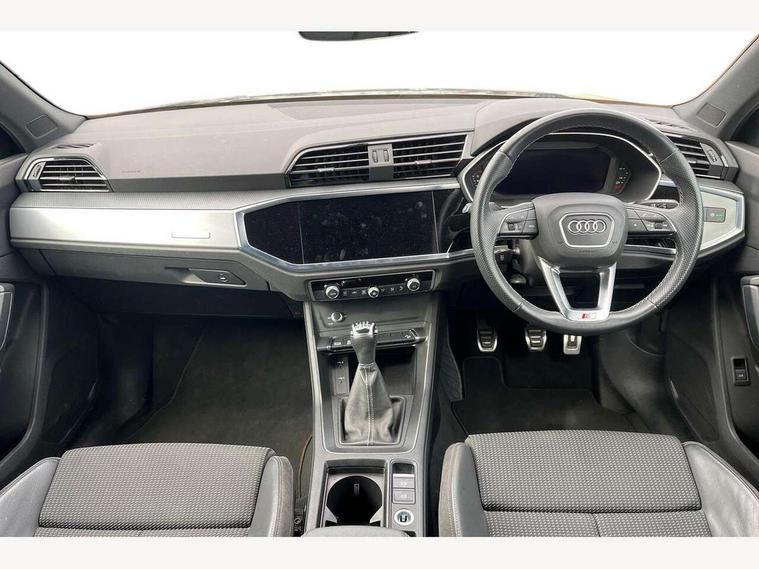 Audi connect safety and service (e-call), Audi drive select, Audi lane departure warning, Audi Virtual Cockpit - 10.25" display, Bluetooth interface, Camera based traffic sign recognition, Cruise control + speed limiter, MMI Navigation Plus with high resolution 10.1 inch touchscreen colour display, Power operated tailgate, Progressive steering, Rear parking sensors, Service interval indicator, Smartphone interface includes wireless Apple carplay/Android Auto, Start stop system with recuperation, Voice control system with natural language interaction, Sports suspension, 2 USB-C ports with charge and data functions, 6 passive loudspeakers, DAB digital radio module, Acoustic windscreen, Aluminium window trim, Auto dimming frameless rear view mirror, Diffuser grille in grained matt black, Diffuser trim in selenite silver, Electrically folding, adjustable and heated door mirrors with integrated LED side indicators and kerb view function for passenger side, Front and rear electric windows, Front fog lights, Front side air inlets in selenite silver, Front underbody protection in manhattan grey paint finish, Grille surround in aluminium silver matt, High gloss black finish B and C pillars, LED headlights with LED daytime running lights, LED rear lights, LED third brake light, Privacy glass dark tinted rear and rear-side windows (from B-pillar backwards), Radiator grille in titanium black with inlay in matt aluminium silver, Rain and light sensors, Rear side wing doors, Rear underbody protection in matt black, Rear wiper, S line badges on front wings, Side skirt insert in matt Platinium grey, Tinted rear windows, Variable front intermittent wipers, 12V socket in rear centre console, 3 seat bench in 2nd row, 40:20:40 folding with manual adjustment for 60:40 forwards/backwards position and backrest angle, Adjustable rear seat bench/backrest with centre armrest and cupholder, Black cloth headlining, Dual zone electronic climate control, Front and rear black floor mats with contrast stitching, Front and rear headrests, Front and rear roof module including reading lights, Front centre armrest, Glove compartment lighting, Height and reach adjustable steering wheel, Illuminated door sill trims with S logo, ISOFIX child seat mounting for front passenger with airbag deactivation and outer rear seat including top tether attachment point for outer rear seats, Luggage compartment light, Manual front seats with height adjustment, Perforated leather gearknob, Single front passenger seat, Stainless steel luggage compartment sill finisher, Stainless steel pedals, Non smoking pack - Q3, 3x3 point rear seatbelts, 6 airbags - Driver, front passenger, curtain and side windows, Audi pre-sense front with pedestrain and cyclist recognition, Electrically operated child locks on rear doors, Electromechanical parking brake, Electronic stabilisation control including ABS, ASR and EDL, Front seatbelt reminder, Hill descent control, Hill hold assist, Pre sense basic, Seatbelt monitoring, Tyre pressure warning, Warning triangle and first aid kit, Anti theft alarm, Anti theft wheel bolts, Immobiliser, Remote central locking, Black dashboard, Dark matt brushed aluminium inlay, Detail dashboard around MMI touch colour display in glass look, black with surround in aluminium look, Leatherette door armrest,