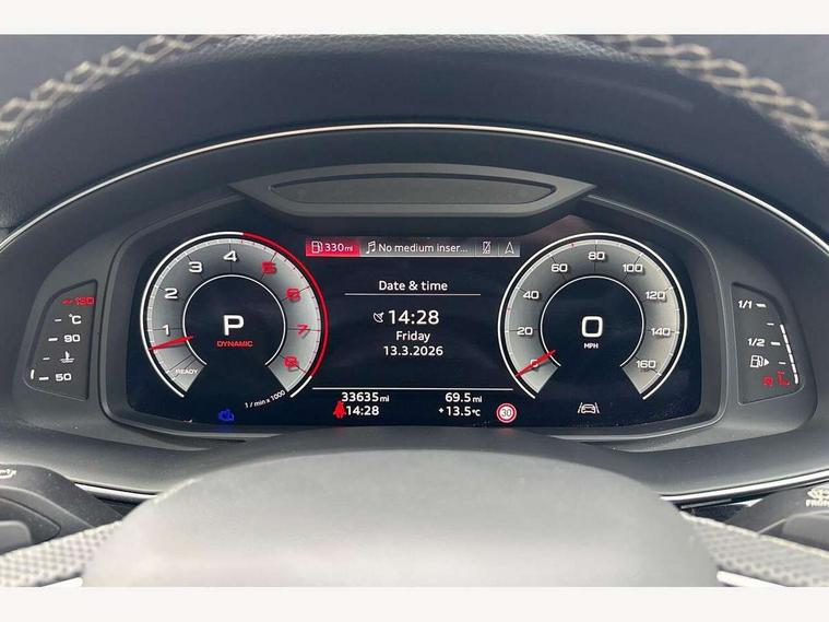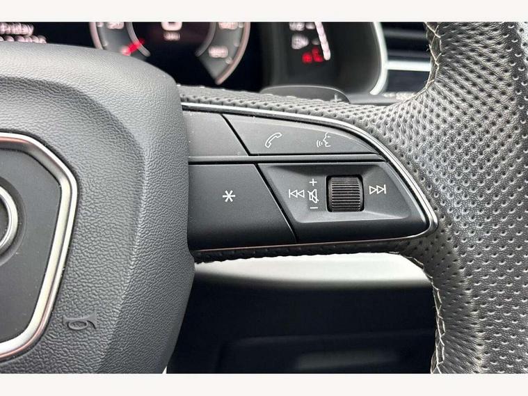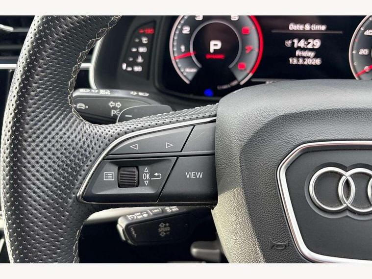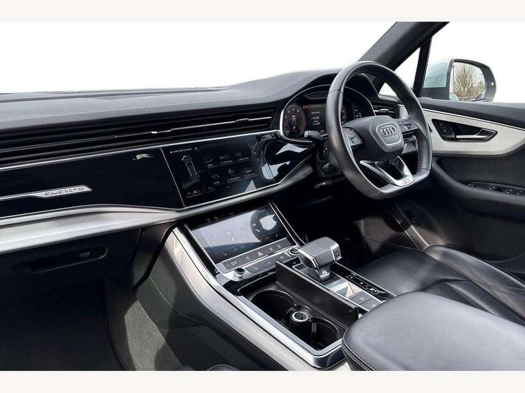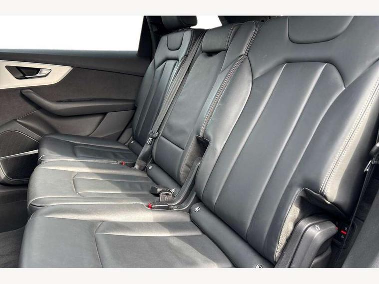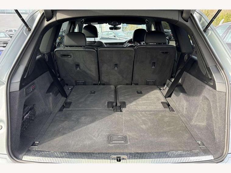 Audi connect safety and service (e-call), Audi connect with Amazon Alexa Integration, Audi drive select (Auto, Comfort, Dynamic, Efficiency, Individual, Off-road and All road), Bluetooth interface, Camera based traffic sign recognition, Electromechanical steering, MMI navigation plus with MMI touch screens includes 10.1" and 8.6" screens with haptic feedback, Natural voice recognition, Parking system plus with 360 degree display (front, rear and side sensors) - acoustic and visual park assist system, Power operated tailgate, Rear view camera, Smartphone interface includes wireless Apple carplay/Android Auto, Start/stop system, 48V Mild hybrid technology, 85 litre fuel tank, Adaptive air suspension, Quattro all wheel drive with self locking centre differential, Audi music interface - front 2 USB-C ports with charger and data functions, Audi sound system with 6 channel amplifier, 180 watt amplifying capacity and 10 loudspeakers including subwoofer, DAB digital radio module, 3rd brake light, Aluminium roof rails, Aluminium window trim, Auto dimming frameless rear view mirror, Body coloured door mirrors, Dark tinted Matrix LED headlights with dynamic front and rear indicators, Electrically adj heated/folding + automatically dimming exterior mirrors with memory + automatic kerb side function for passenger side exterior mirror, Heat insulating glass in windshield, Integrated LED indications in door mirrors, LED daytime running lights, LED rear tail lights, Privacy glass - dark tinted rear and rear side windows from B-pillar backwards, Rear side wing doors, Rear wiper, S Line badge on wings, S line bumpers in full body colour paint finish, S line roof spoiler, S line styling side ventilation grilles and side skirts, 2 seat bench in 3rd row, 2 zone automatic climate control, 3 seat bench in 2nd row, 7 seat layout with ISOFIX points for the front passenger seat and rear passenger seat, Black cloth headlining, Comfort front centre armrest, Electric adjustable front seat with 4 way lumbar support, driver memory functionality, Folding rear seats, Front head restraints, Front/rear floor mats, Heated front seats, Illuminated door sill trims with S logo, LED interior ambient lighting, Luggage compartment cover, Luggage compartment sill protection in stainless steel, Rear head restraints, Single front passenger seat, Stainless steel pedals, Sunvisors with illuminated vanity mirrors, 3 point seatbelts on all rear seats, Audi pre sense front, Child locks on rear doors, Driver and front passenger, front side and curtain airbags, Electromechanical parking brake, Electronic Stabilisation Control (ESC) including ABS, ASR and EDL, Extended pedestrian protection measures, Hill hold assist, Seatbelt monitoring, Tyre pressure loss indicator, Warning triangle and first aid kit, Anti theft alarm, Anti-theft wheel bolts and wheel loosening detection, Keyless Go, Remote central locking, Darkened matt brushed aluminium inlays, Tool kit, Tyre repair kit,