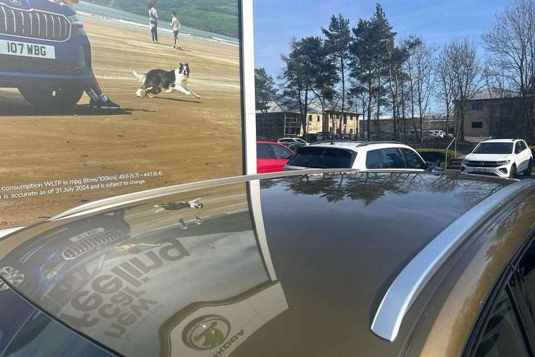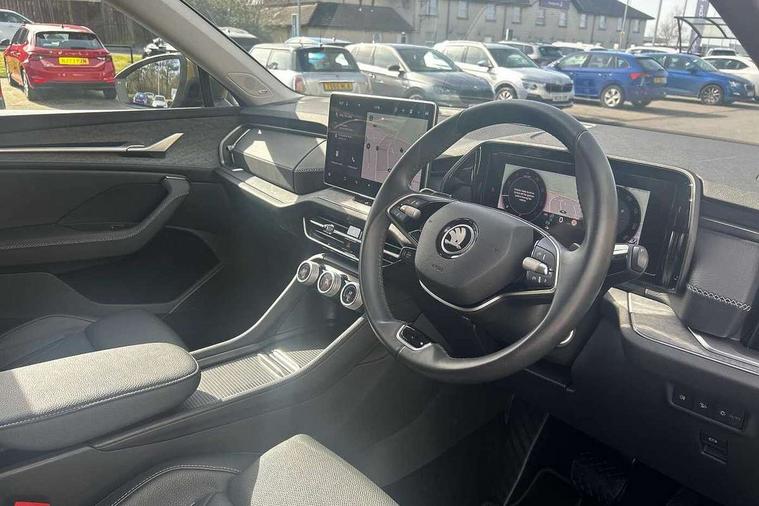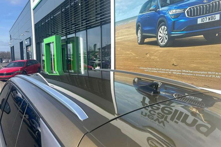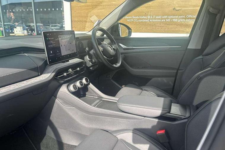 13" satellite navigation touchscreen display, Blind spot detection with door exit warning, Bluetooth system, ChatGPT functionality, Drive mode selector, Driver alert with fatigue sensor, Driver drowsiness alert system, Dry display cleaner, e call+, Front cross traffic assist, Lane assist, PAS, Rear traffic assist, Tailgate unlocking from outside, Traffic sign recognition, USB C Port x 2 in front centre console, Virtual Cockpit - 10.25" digital display, Voice control system, Wireless charging for two smartphones (15W) with cooling function, Wireless SmartLink for Apple CarPlay and Android Auto, Stop/start function, 2x USB-C in the rear, DAB Digital radio, Aero front windscreen wipers with intermittent function, Auto dimming rear view mirror, AWL (all weather lighting) and all weather light with cornering function, Black wheel arch surrounds, Body colour bumpers, Body colour door mirrors and handles, Cornering light and poor weather light, Electric folding /adjustable/separted heated/folding door mirrors, auto dimming with boarding sports and memory function, Electric front and rear windows, Exterior black decorative trims, Heat insulating glass in windshield, Heated rear window, Ice scraper in fuel tank cap, Invisible tailpipe, LED daytime running lights, LED third brake light in rear spoiler, Light assistant with automatic headlight control and coming home feature, Logo projection in door mirrors, Privacy glass, Rear side wing doors, Rear spoiler, Rear window wiper, Red decorative strip between rear LED lights, Safety reflectors on front and rear doors, Unique dark chrome design logo on alloy wheels, Window control switches with black trim, Windscreen wipers with rain sensor, Without engine designation, 1.5l bottle holder points in all door, 12V socket in boot, 1x centre rear reading light, 2 seat bench in 3rd row, 3 configurable smart dials with 32mm coloured display, 3 seat bench in 2nd row, 4 foldable roof handles with rear coat hooks, Ambient interior lighting - Dashboard, front-door stowage compartments, front and rear door panels and footwell lighting, Automatic gear selector on steering wheel, Chrome interior door handles, Driver/front passenger reading lights, Fabric headlining, Fixed bench 40:60:40 split folding backrests, Front and rear floor mats, Front centre armrest with jumbo box storage compartment, cup holder and 12V socket, Front courtesy lights, Height adjustable front headrests, Isofix child seat fittings in outer middle row rear seats and front passenger with top tether, Manually adjustable steering column, Pollen filter, Rear centre armrest with cupholders, Rear seat boot backrest release, Retractable luggage compartment cover, Single front passenger seat, Skoda lettering on steering wheel, Sliding trunk cover, Small Bags on the inner sides of the front backrests, Storage pocket including mobile phone pockets on the backs of the front seats, Sunvisors with illuminated vanity mirrors, Three rear height adjustable headrests, Ticket holder on A Pillar, Tri zone climate control, Umbrella in door panel x1 made from sustainable materials, Upper and lower glovebox with card holder and coin compartment, USB C port by rear view mirror for charging only (15W), Exterior styling pack - Kodiaq, Auto door release and activation of warning lights in the event of an accident, Driver and front passenger airbag with knee airbag and front passenger airbag deactivation, Electric child locks, Electronic parking brake, ESC (incl. ABS+EMD+MSR+ASR+EDL+HBA+DSR+RBS+ESBS+MCB+TSA+XDS), Front assist with braking reaction to vehicles, pedestrians and cyclists, Front disc brakes, Fuel cut off safety device, Height adjustable front 3 point seatbelts + pretensioners, Hill hold control, Junction assist with automatic emergency braking, Rear disc brakes, Safety vest holder in door, Seat belt reminder for all seats, Three point rear seat belts, Two tone horn, Tyre pressure monitor, Anti-theft wheel bolts, Immobiliser, Remote central locking with 2 keys, Breakdown kit,