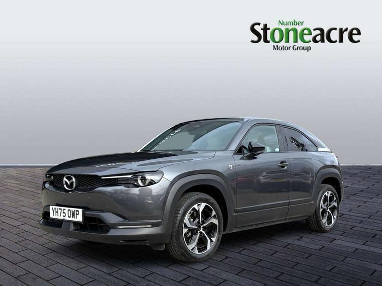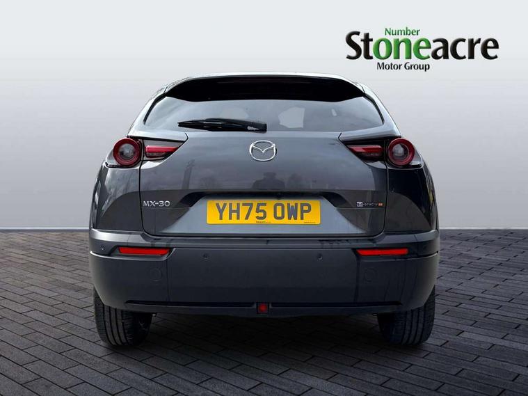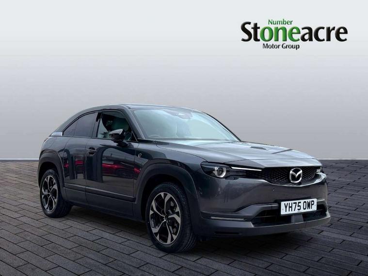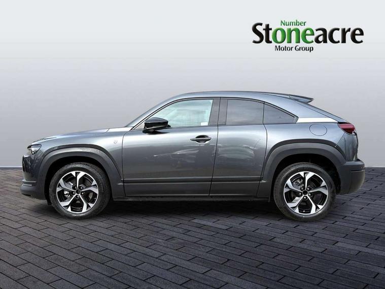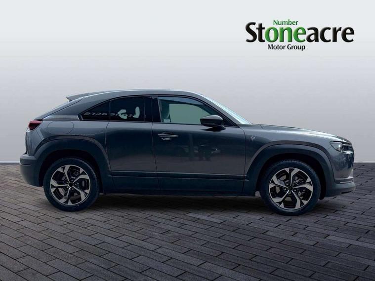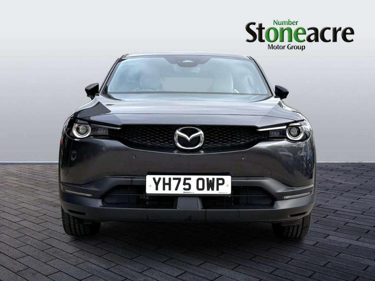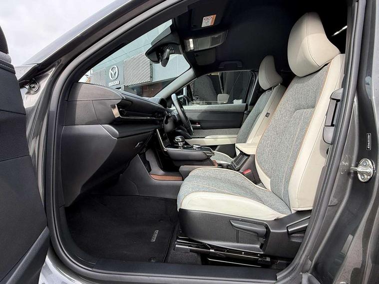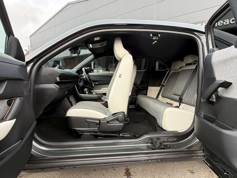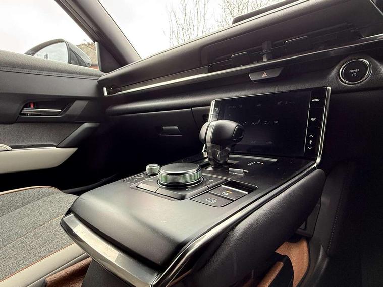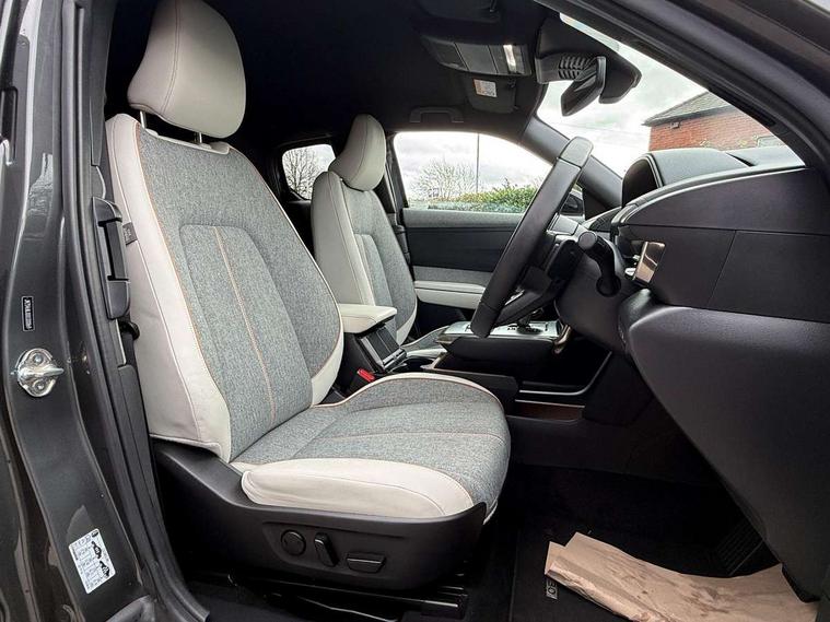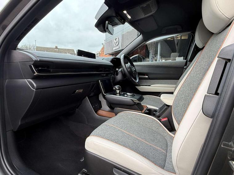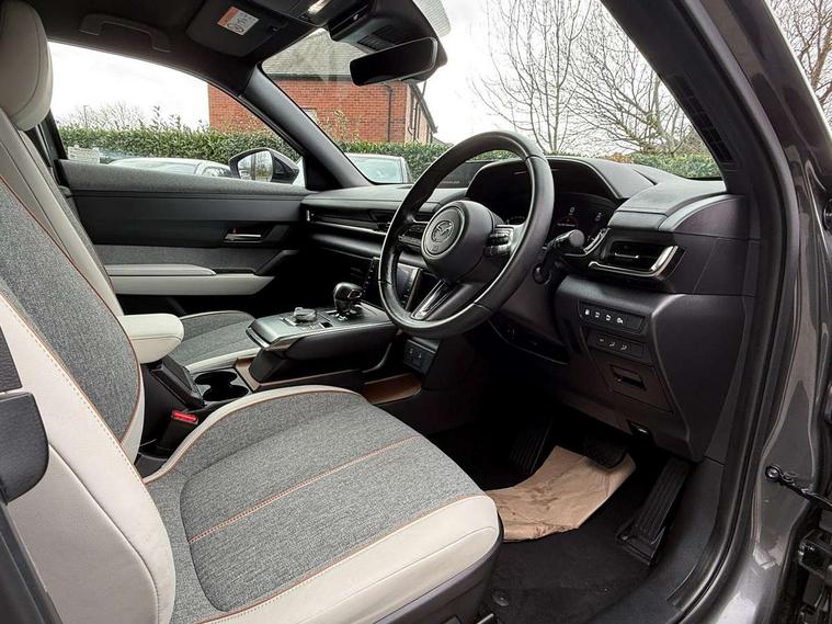 10.25" TFT colour centre display with Mazda Connect infotainment, 7" TFT Colour driver instrument panel display, Adaptive cruise control (Mazda radar cruise control) features stop and go, Apple car play/Android Auto, Blind spot monitoring with rear cross traffic alert, Drive mode switch, Driver attention alert system, E-call with GPS, Emergency lane keeping with blind spot assist and road keep assist, Emergency stop signalling system, Front and rear parking sensors, Integrated bluetooth, Integrated Mazda navigation system, Intelligent speed assist, Lane keep assist system (LAS) with Lane departure warning system (LDWS), PAS, Power start/stop button, Reversing camera, Service indicator, Trip computer, Windscreen projected colour active driving display (head up display) with traffic sign recognition, 11 kW triphase onboard charger, DC socket for rapid charging up to 40KW, Internal Combustion Engine Sound Emulator, Type 2 for mode 2 AC charging via 3-point plug, Type 2 for mode 3 AC charging via home or public charge points, 8 Speakers, DAB Digital radio, FM, Multimedia Commander including separate volume dial, Steering wheel mounted audio/bluetooth controls, Satin black - Lower bumper and wheel arch and side mouldings, Auto dimming driver's door mirror, Auto headlight levelling, B-pillar and C-pillar garnishes in gloss black finish, Black front grille, Body coloured bumpers, Coming/leaving home lights, Door mirrors with adjustable memory and tilt down function when in reverse, Dusk sensing headlights, Electric front windows with one touch auto up/down, Electrically adjustable door mirrors, Frameless auto dimming interior rear view mirror, Front, rain-sensing wipers with adjustable sensitivity and speed, Gloss black rear roof spoiler, Heated and auto power-folding door mirrors in black with integrated indicator lights, High beam control, Kodo turn signal, LED 3rd brake light, LED daytime running lights, LED Headlights, LED rear combination lights, Privacy glass (rear side windows and rear screen), Rear side wing doors, Rear wiper, Unique R-EV exterior badging, 12v electrical power outlet, 2x USB C and 12V Outlet, 3 seat bench in 2nd row, 60/40 split fold down rear seats, 8-way power adjustable driver seat with memory linked to door mirror and Active Driving Display, Black roof lining, Bright finish power button surround, Bright interior trim accents with steering wheel centre bezel, surround of engine start / stop button and glove box handle, Climate control air conditioning operated by the central 7" touchscreen control panel, Cloth/artificial leather upholstery, Door panel trim - cloth with artificial leather armrest and cork inserts around inner door handle, Driver and front passenger two rear grab handles with rear coat hooks, Driver, front passenger and two rear door pockets, Drivers and front passengers sun visors with vanity mirrors and driver's ticket holder, Front and rear LED lighting, Front centre armrest with storage and two cupholders, Front passenger seat manual slide, recline and height adjust, Heated front seats with 3 stage setting, Illuminated glovebox, ISOFIX child seat anchorage points attached on outer rear seats, Leather wrapped steering wheel and shift lever, Luggage compartment LED lighting, Mazda heritage cork accents on the console tray and cupholder lids, Power driver lumbar support, Rear centre armrest with two cup holders, Remote pre-heating/cooling, Roof mounted sunglasses holder, Seatback pocket at rear of the front passenger seat, Single front passenger seat, Steering wheel telescopic and tilt adjustment, Tonneau cover, Two front and three rear height-adjustable head restraints, 3 point ELR front seat belts x2 with pretensioners, 3x3 point rear seat belts, Anti-lock braking system (ABS), Collision avoidance braking, Driver central airbag, Drivers knee airbag, DSC - Dynamic Stability Control, Electric G-Vectoring control plus, Electronic parking brake with auto disengage function and auto hold function, Front and rear curtain airbags, Front dual stage driver and single stage front passenger airbags, Front passenger airbag cut-off switch, Front side airbags, Hill hold assist, Pre-crash safety system - Smart brake support (SBS) with turn-across traffic, Rear door child safety locks, Regenerative braking system (5 modes. Selected via paddle shift switches), Seatbelt reminder audible warning for driver, passenger and rear seats, Traction control system (TCS), Tyre pressure monitoring system (TPMS), Keyless Go, Remote central locking with deadlocking and automatic door lock when driving, Smart keyless entry, Thatcham accredited alarm and immobiliser, 18" Black diamond cut alloy wheels, Emergency tyre repair kit,
