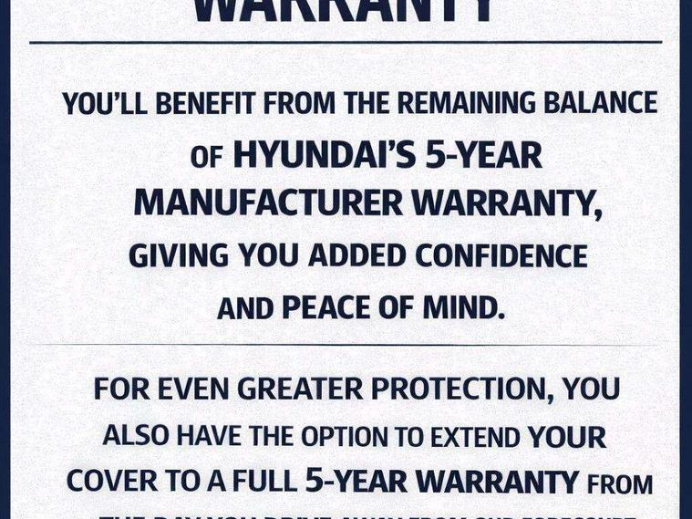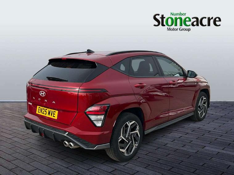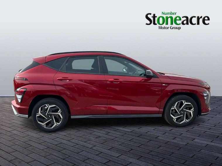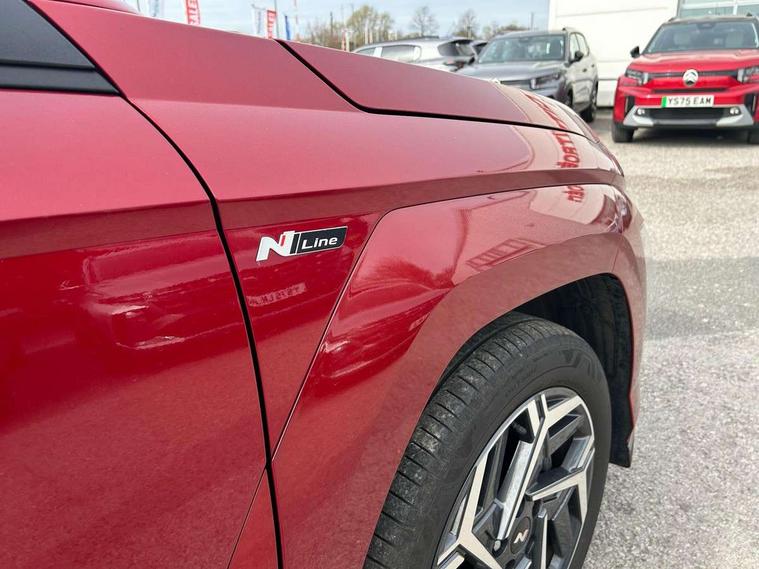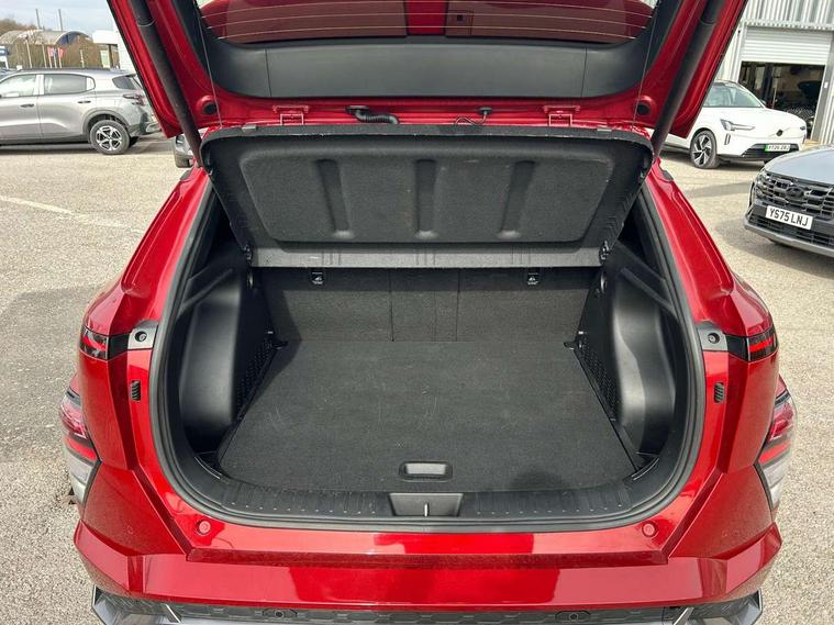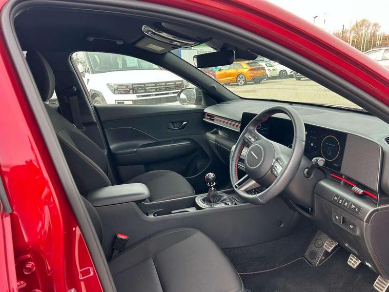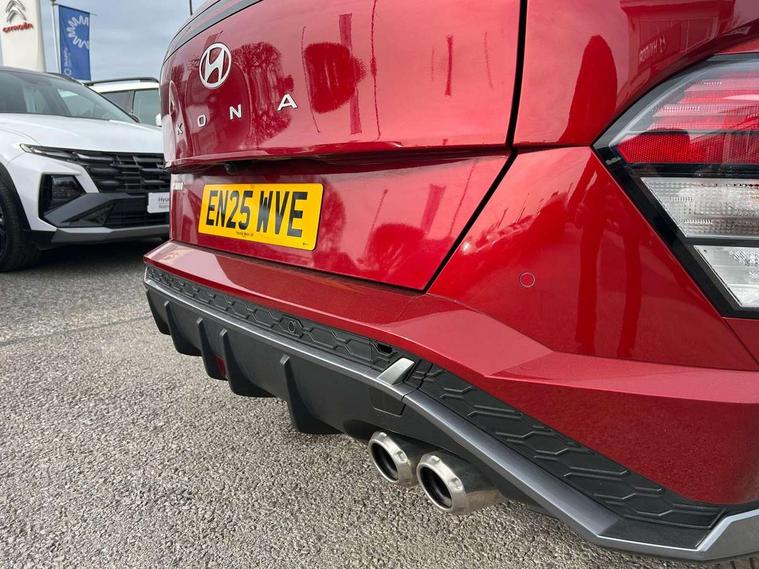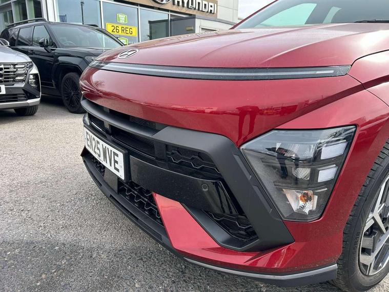 12.3" touchscreen centre console display satellite navigation with bluelink, live services and mapcare, Bluetooth connectivity with voice recognition, Cruise control, Driver status monitor (DSM), Driver supervision instrument cluster with 12.3" LCD display, eCall emergency call system, Feature on demand - Enabled, Forward collision avoidance assist (FCA 1.5) - Car, pededstrian, cycle and junction turning, Front parking sensor, Height adjustable power tailgate, Intelligent speed limit assist, Lane follow assist, Lane keep assist, Leading vehicle departure alert (LVDA), Parking system with rear camera and guidance system, PAS, Rear parking sensor, Roadside assistance, Wireless phone charging pad, Wireless Smartphone Integration includes Apple CarPlay and Android auto, 2 front USB C and 2 rear USB C charging points, DAB Digital radio, Speakers - Front, rear and tweeters, Steering wheel audio, phone and cruise controls, Auto dimming rear view mirror, Automatic headlights with dusk sensor, Automatic windscreen wipers with rain sensor, Body colour exterior door handles, Body coloured wheel arch inserts, Door mirror LED indicator lights, Electric front windows with anti-trap mechanism and one touch control, Electric rear windows, Electrically adjustable and heated door mirrors, Full LED MFR headlights, Gloss black door mirrors, LED daytime running lights, LED upper and lower rear lights, Power folding door mirrors, Privacy glass - Rear windows and tailgate, Rear roof spoiler with integrated LED brake light, Rear side wing doors, Rear wiper, Roof rails, Solar glass with front door glass and windscreen, Tinted glass in front and rear doors, Windscreen auto defog function, 12V power outlet in front console, 2 zone climate control, 3 seat bench in 2nd row, 40/20/40 split folding rear seat, Adjustable head restraints, Aluminium pedals, Ambient lighting, Driver and passenger front seat pockets, Driver's seat lumbar support, Driver/passenger manual seat height adjustment, Driver/passenger sunvisors and illuminated vanity mirrors, Floor mats, Heated front seats, Heated rear seats, Heated steering wheel, Height/reach adjustable steering column, Leather wrapped steering wheel and gear knob, LED centre interior light, LED front interior light, Luggage compartment LED lighting, Luggage shelf, Metal paint effect interior door handles, N Line cloth upholstery, Rear centre armrest with cupholders, Single front passenger seat, Vertical adjustment rear head restraints, N Line exterior design pack - Kona, Trailer wiring package - Kona, Airbag - front, front side, curtain and centre front airbag, Anti-lock brake system (ABS), Childproof rear door locks, Downhill brake control, Electric parking brake, Electronic stability control, Fixed 3 point for second row centre passenger seatbelt, Hill start assist control (HAC), Rear seat alert, Tyre pressure monitoring system, Alarm/immobiliser, Rear occupant alert, Remote central locking, Smart key with keyless entry and start/stop button, Five year annual vehicle health checks, Temporary mobility kit (TMK),