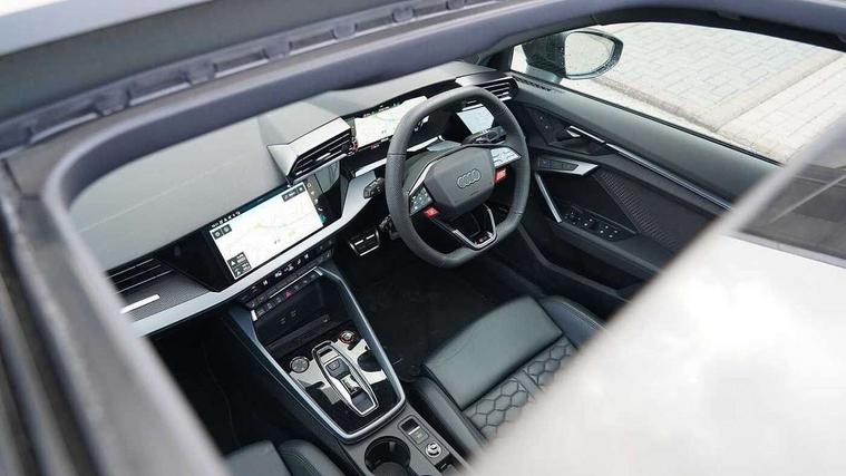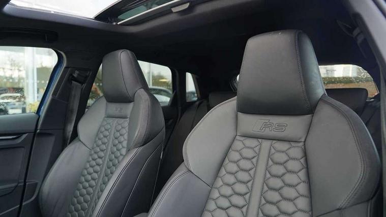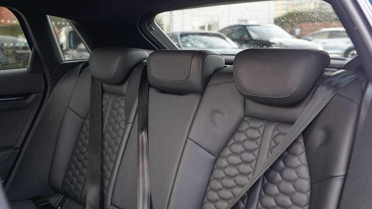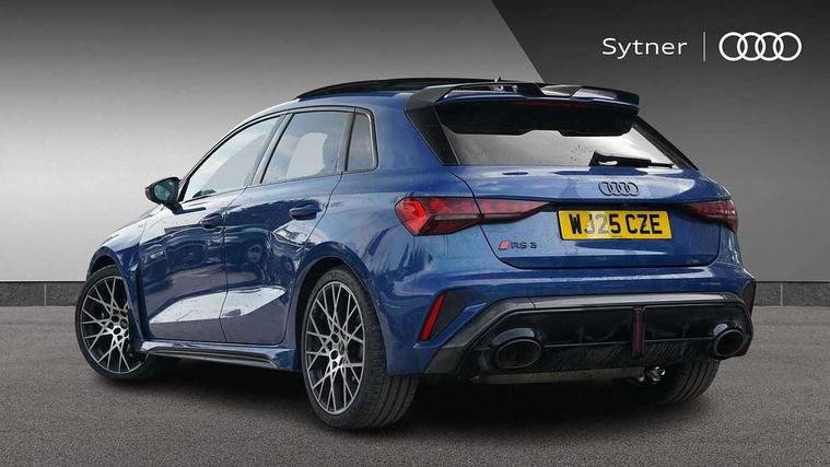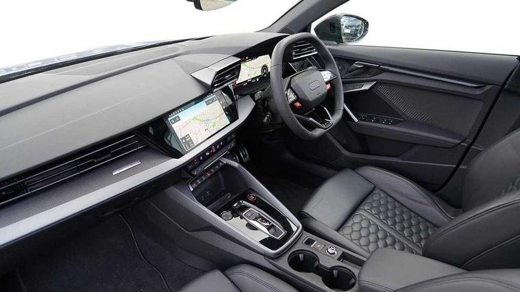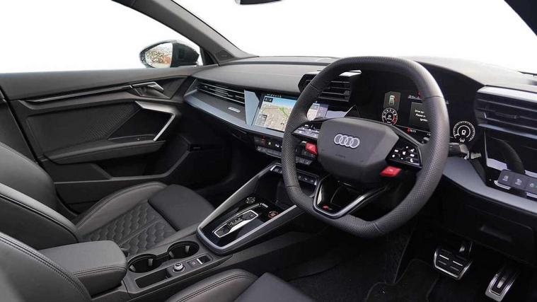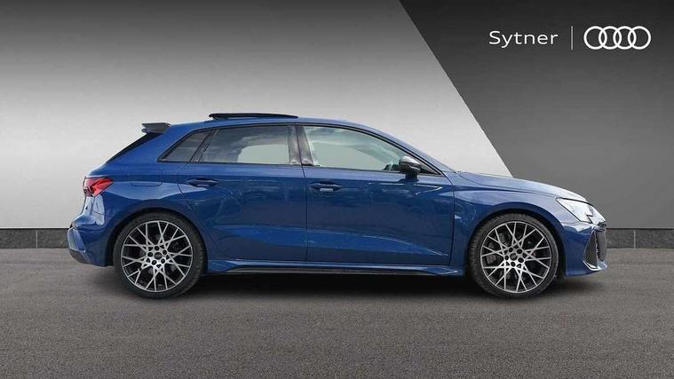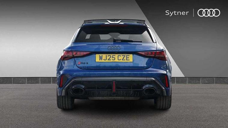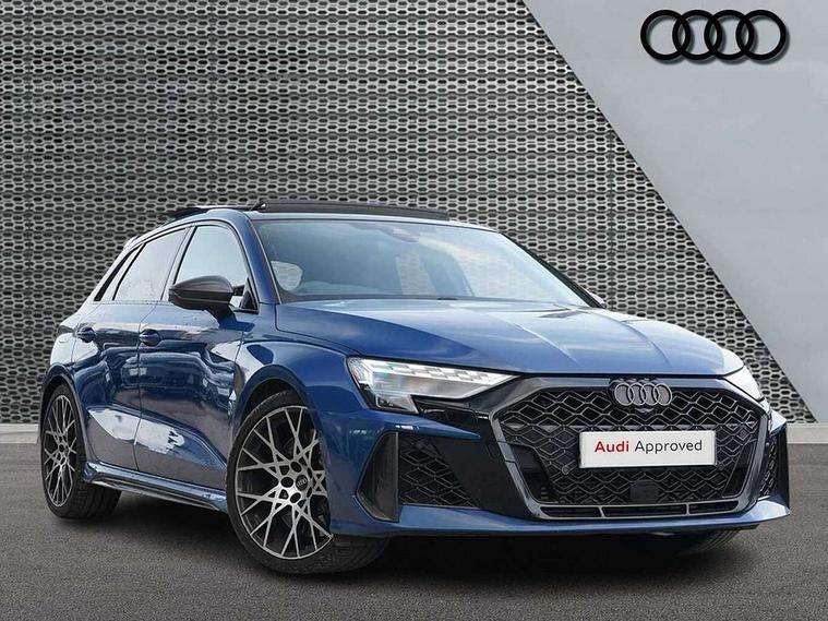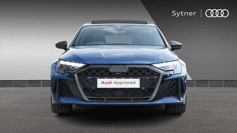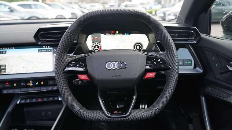 Adjustable speed limiter, Audi drive select comfort, auto, dynamic and efficiency, Audi smartphone interface with app store includes wireless Apple carplay, Android auto and Amazon alexa integration, Audi virtual cockpit plus with RS specific design and 12.3" display with additional graphic display options, Automatic start/stop system with recuperation, Bluetooth interface, Camera based traffic sign recognition, Collision avoidance assistant, Distraction and Fatigue warning, e-Call (emergency call), Lane departure warning system, MMI Navigation Plus with high resolution 10.1" colour touch screen display, Park Assist with parking system Plus, Progressive steering, RS specific driving modes - RS Individual, RS Performance and RS Torque rear, Voice control system with natural language interaction, Adaptive suspension with audi drive select, Increase of top speed to 174 mph, Quattro permanent four wheel drive, Audi Phonebox light with wireless charging, DAB Digital radio, USB ports with charging function in the rear, Audi beam LED projection of RS logo on ground as you exit, Auto dimming frameless rear view mirror, Automatic dynamic range control, Carbon door mirror housings, Carbon fibre engine cover, Dipped beam, main beam, position light and turning light, Electrically adjustable/heated/folding/auto dimming door mirrors with integrated LED indications + kerb view function for passenger side, Exterior model badging, Front electric windows, Heat insulating glass windscreen, LED 3rd brake light, LED brake lights, LED daytime running x3, LED rear number plate lights, LED reverse light, LED tail lights, Light and rain sensors, Privacy glass - dark tinted rear window, rear door and side windows, Rear electric windows, Rear side wing doors, Rear wiper, Roof edge spoiler in carbon, RS dual branch exhaust system with two chrome plated oval tailpipe trims, 12V socket and storage compartment in front centre console, 3 seat bench in 2nd row, 3 Spoke flat top and bottomed black leather multi function steering and gear shift paddles, 3-zone deluxe automatic air conditioning, 40/20/40 split folding rear seat bench, Black cloth headlining, Front and rear headrests, Front centre armrest, Front door sill trims with RS 3 logo, Front sports seats RS embossed logo, Front/rear floor mats, Heated front seats, Height and reach adjustable steering wheel, Manual boot compartment lid, Rear centre armrest with cupholder, Seat side bolsters, Single front passenger seat, Stainless steel pedals and front footrest in black, Vanadium look - Interior door handles, Door trim, power latching, Air vents, window controls, mirror adjust, rear door lock, Selector lever in centre console, Black Styling plus package - RS3, Extended ambient lighting package Pro with Multi-coloured contour lighting of instrument panel - RS3, RS exterior features pack in carbon and gloss black - RS3, RS sport suspension pack - RS3, Storage package - RS3 Sportback, 3x3 point rear seat belts, Driver and front passenger airbag with passenger airbag deactivation, Electronic Stabilisation Control (ESC) including ABS, ASR and EDL, First aid kit with warning triangle and 2 safety vests, Hill hold assist, Pre-sense front with pedestrian and cyclist detection, RS steel brakes, Seatbelt monitoring, Tyre pressure loss indicator, Anti theft alarm, Anti-theft wheel bolts, Electronically operated child locks, Inlays in carbon atlas structure, Tyre repair kit,