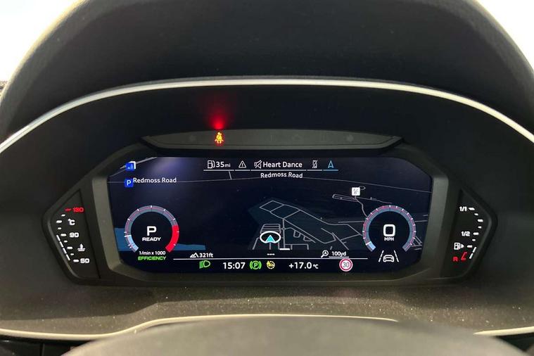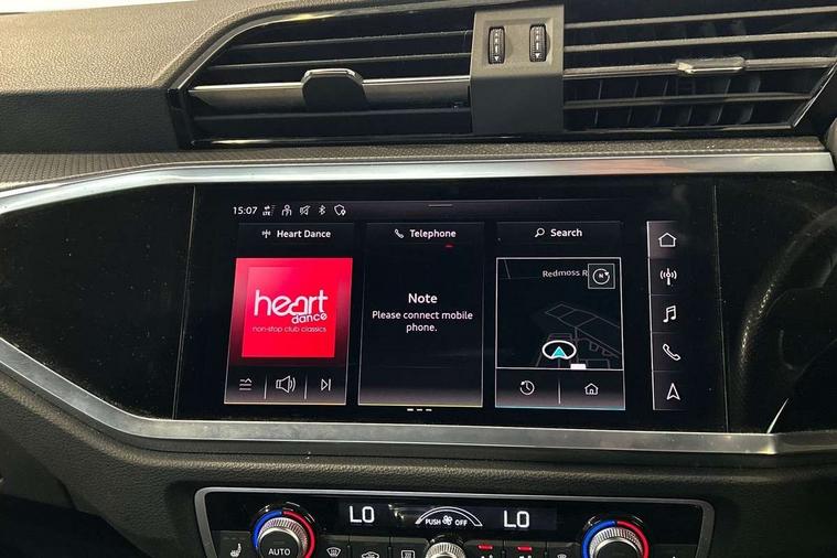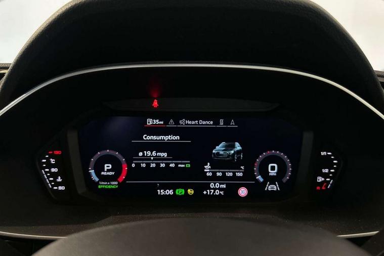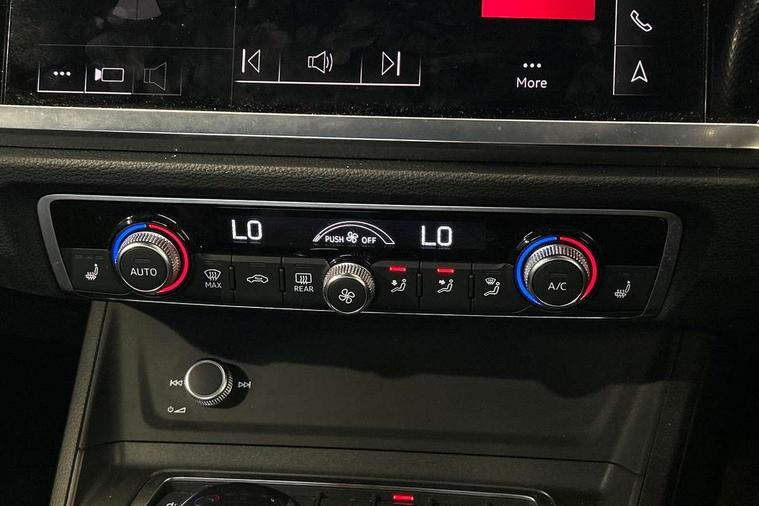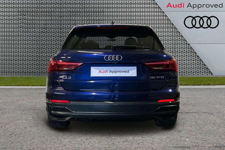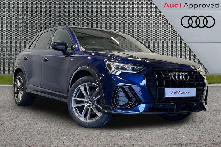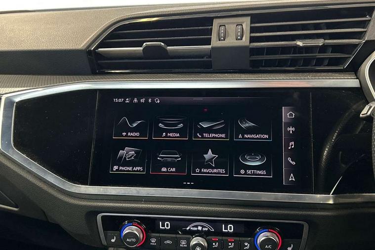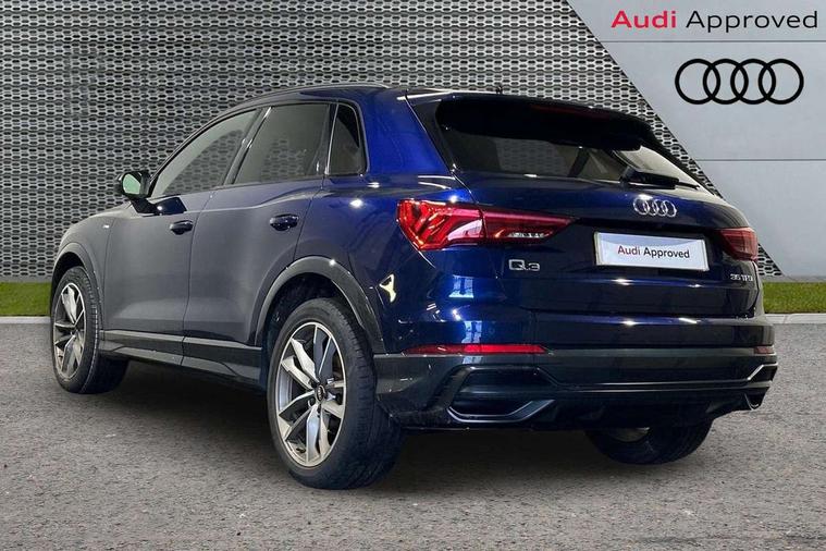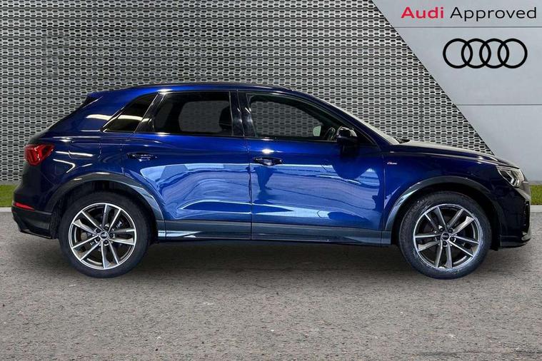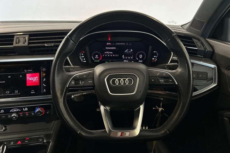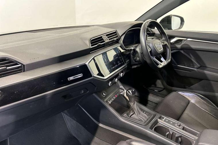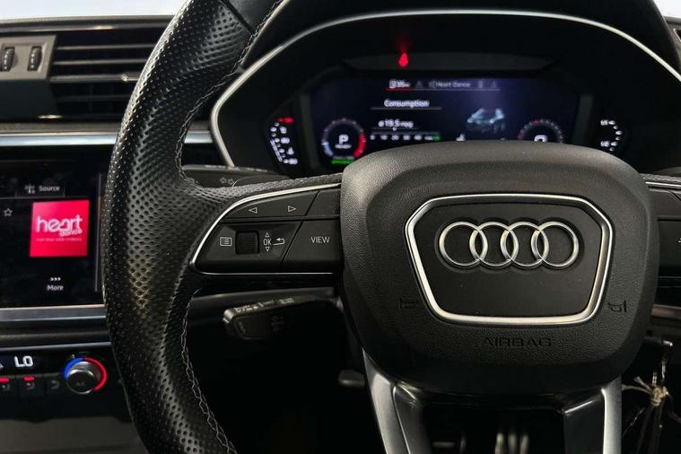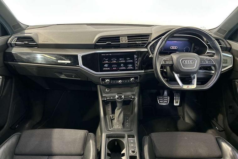 Amazon alexa Integration, Audi connect safety and service (e-call), Audi drive select, Audi lane departure warning, Audi Virtual Cockpit - 10.25" display, Bluetooth interface, Camera based traffic sign recognition, MMI Navigation Plus with high resolution 10.1 inch touchscreen colour display, Power operated tailgate, Progressive steering, Service interval indicator, Smartphone interface includes wireless Apple carplay/Android Auto, Start stop system with recuperation, Voice control system with natural language interaction, 48V Mild hybrid technology, Sports suspension, 2 USB-C ports with charge and data functions, 6 passive loudspeakers, DAB digital radio module, Acoustic windscreen, Auto dimming frameless rear view mirror, Black roof rails, Electrically folding, adjustable and heated door mirrors with integrated LED side indicators and kerb view function for passenger side, Front and rear electric windows, Front fog lights, Grille vertical bars in aluminium silver/Matt, High gloss black finish B and C pillars, LED headlights with LED daytime running lights, LED rear lights, LED third brake light, Privacy glass dark tinted rear and rear-side windows (from B-pillar backwards), Rain and light sensors, Rear diffuser strip in matt titanium black, Rear side wing doors, Rear wiper, S line bumpers in contrasting Manhattan grey, Variable front intermittent wipers, 12V socket in rear centre console, 3 seat bench in 2nd row, 40:20:40 folding with manual adjustment for 60:40 forwards/backwards position and backrest angle, Adjustable rear seat bench/backrest with centre armrest and cupholder, Black cloth headlining, Dual zone electronic climate control, Front and rear black floor mats with contrast stitching in rock grey, Front and rear headrests, Front and rear roof module including reading lights, Front centre armrest, Glove compartment lighting, Height and reach adjustable steering wheel, Illuminated door sill trims with S logo, ISOFIX child seat mounting for front passenger with airbag deactivation and outer rear seat including top tether attachment point for outer rear seats, Luggage compartment light, Manual front seats with height adjustment, Perforated leather gearknob, Single front passenger seat, Stainless steel luggage compartment sill finisher, Stainless steel pedals, Black styling pack - Q3, Non smoking pack - Q3, 3x3 point rear seatbelts, 6 airbags - Driver, front passenger, curtain and side windows, Audi pre-sense front with pedestrain and cyclist recognition, Electromechanical parking brake, Electronic stabilisation control including ABS, ASR and EDL, Front seatbelt reminder, Hill descent control, Hill hold assist, Manual child lock in rear doors, Pre sense basic, Seatbelt monitoring, Tyre pressure warning, Warning triangle and first aid kit, Anti theft alarm, Anti theft wheel bolts, Immobiliser, Remote central locking, Detail dashboard around MMI touch colour display in glass look, black with surround in aluminium look, Leatherette door armrest, Piano black inlay, Tool kit, Tyre repair kit,