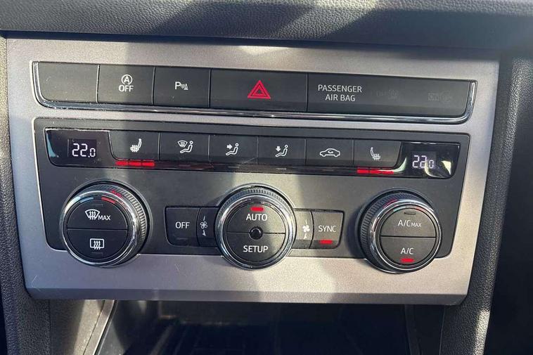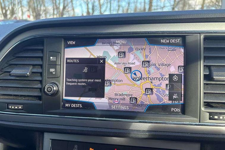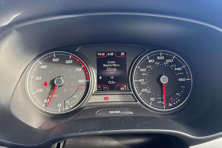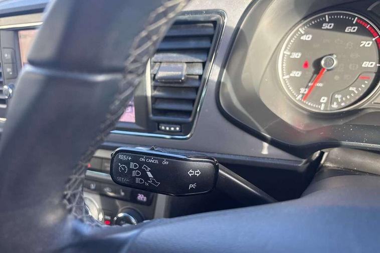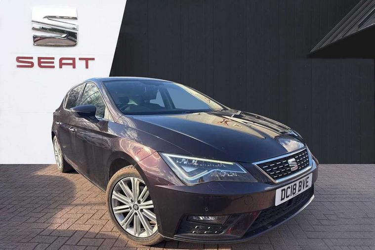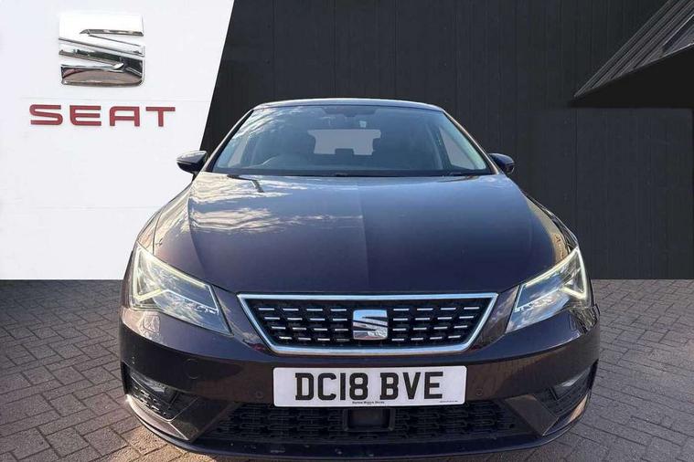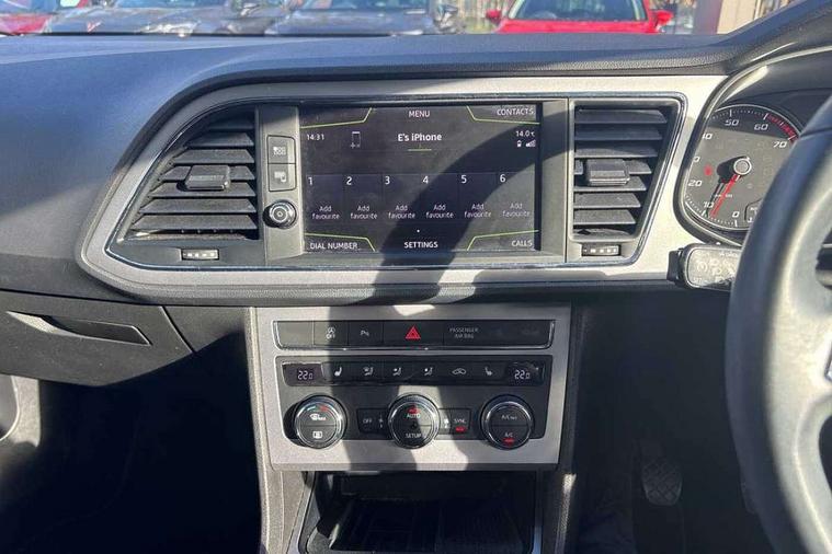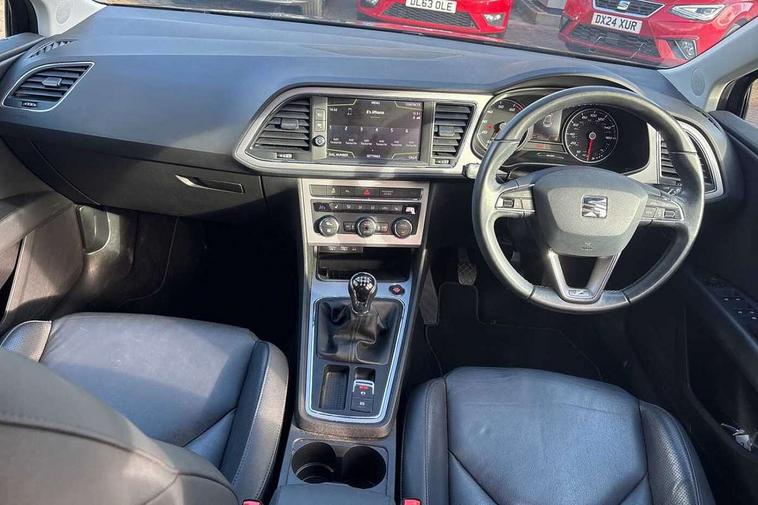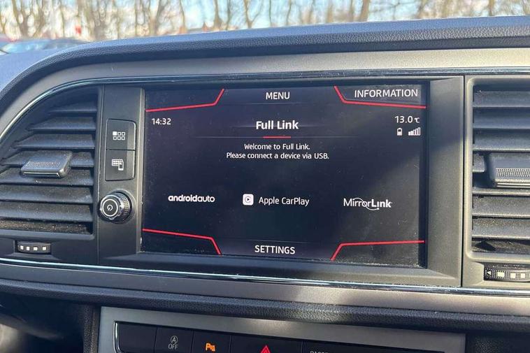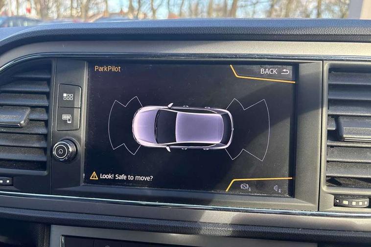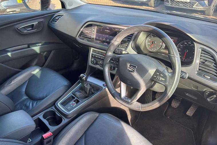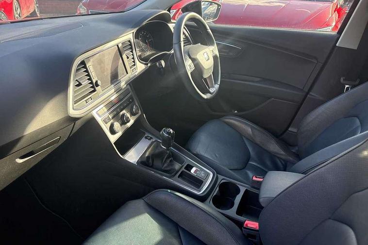 'Lights On' Reminder warning buzzer, 8" touch screen, Bluetooth Handsfree Phone Connection, Front parking sensors, Low fuel warning light, Outside temperature gauge, Rear parking sensors, Remote fuel flap release, SEAT logo boot release, Service interval indicator, Trip computer, Voice control system, XDS electronic differential lock, 2 USB ports, 2 USB sockets in rear, 2x SD card slot, Auxiliary input socket, Bluetooth audio streaming, Connecting box + Keyless entry, DAB Digital radio, Radio/CD + MP3, Steering wheel mounted audio/phone controls, Aluminium front door sills, Body colour door handles, Body coloured bumpers, Body coloured door mirrors, Chrome radiator grille and surround, Chrome window surround, Dark tinted rear windows, Electric adjustable/heated/folding door mirrors, Electric front/rear windows with one touch/auto up/down, Electric headlamp adjustment, High gloss black finish B and C pillars, LED daytime running lights, LED front fog lights, LED Headlights, LED indicators in door mirrors, LED number plate light, LED tail lights, Rear wash/wipe, Reverse activated kerb-view adjustment on passenger's door mirror, Twin exhaust pipes, 12v power point in centre console, 3 height adjustable rear headrests, 60/40 split folding rear seat, Active head restraints, Additional heating and ventilation outlet in rear of centre console, Boot net, Driver seat height adjust, Driver seat lumbar adjustment, Driver/passenger sunvisors with illuminated vanity mirrors, Dual zone climate control, Dust/pollen filter, Front adjustable head restraints, Front armrest with storage box, Front cupholders x 2, Front seat and rear pockets, Front sports seats, Front/rear floor mats, Height/reach adjust steering wheel, Illuminated door sills, Illuminated glovebox, Illuminated rear centre console, Instrument lighting with brightness control, Leather handbrake, Leather steering wheel, Leather steering wheel and gear knob, Leather upholstery, Luggage tie-down hooks, Passenger seat height adjuster, Passenger seat lumbar adjust, Rear armrest, Rear top tether child seat ISOFIX attachment, Storage boxes under front seats, Convenience pack+ - Leon, Winter pack - Leon, 3 point seatbelts on all rear seats, ABS + traction control, Active pedestrian safety system, Child proof door locks, Collision mitigation braking system, Curtain airbags, Driver/Front Passenger airbags, Drivers knee airbag, Electronic parking brake with auto hold, ESP+EBA, Front assist including city emergency braking, Front seatbelt pretensioners, Front Seatbelt warning, Front side airbags, Hill hold control, Manual passenger airbag deactivation function, Tyre pressure monitoring system, 2 folding remote keys with window open/close function, Engine immobiliser, Remote central locking + deadlocks, Volumetric alarm with back up horn, Chrome interior trim,