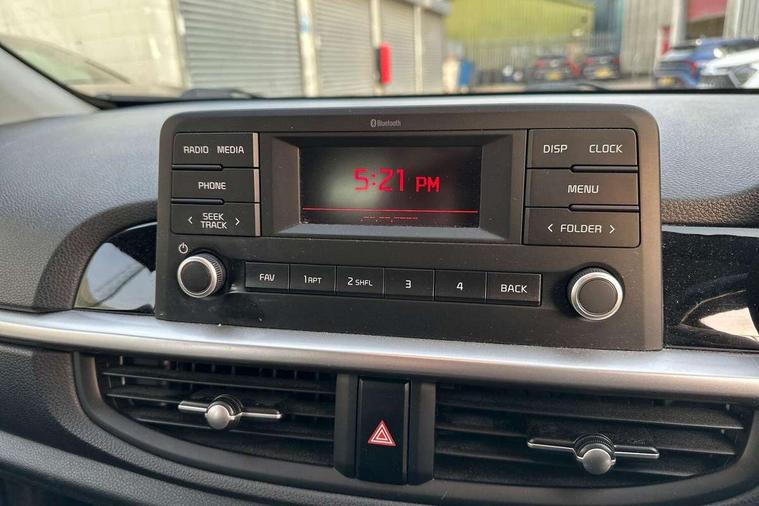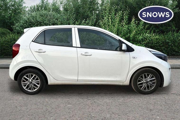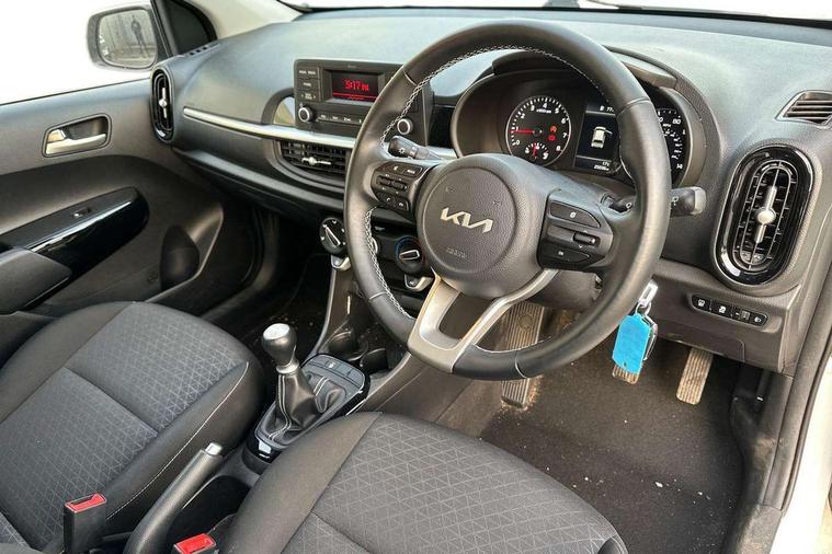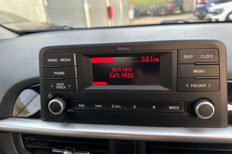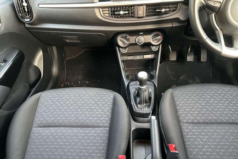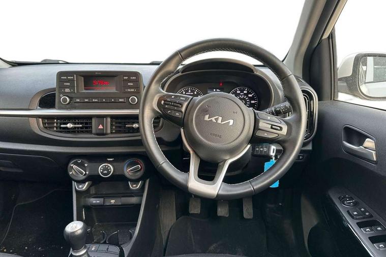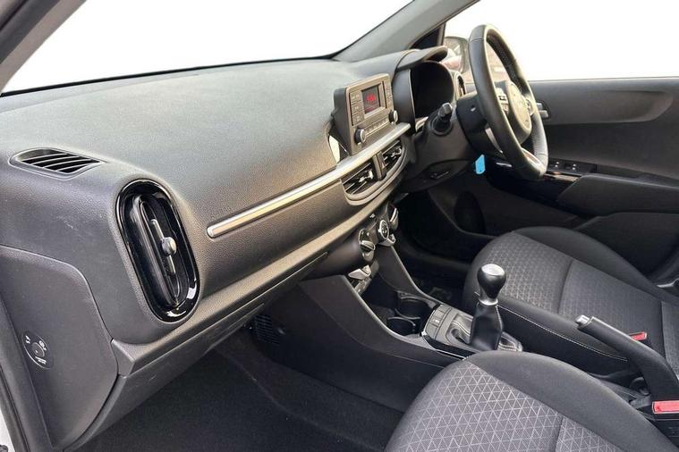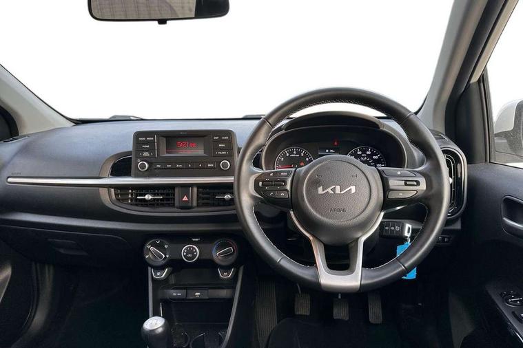 3.8" monochrome audio display with RDS and DAB, Emergency call service, Emergency stop signalling system, External temperature gauge, Motor driven power steering, Tachometer, Tailgate, Trip computer, 4 speaker audio system, Bluetooth with music streaming, Steering wheel mounted controls, USB ports for connection of a media device, Automatic headlight control system, Black radiator grille with chrome surround, Body colour bumpers, Body colour mirrors and door handles, Day/night rear view mirror, Daytime running lights, Electric adjustable heated door mirrors, Front and rear electric windows with drivers's auto up/down function, Headlamp levelling, Heated rear window, High mount brake light, MFR - Multi Focus Reflector halogen headlights with black bezel, Rain sensor, Rear fog lights, Rear side wing doors, Rear wash/wipe, Speed variable front wipers, Tinted glass, Visible VIN plate, Welcome and follow-me home light functionality, 1 x rear coat hook, 12V power point front, 2 seat bench in 2nd row, 3 x passenger assist grips, 60/40 split/folding 2nd row of seats, All round height adjustable headrests, Cupholders in centre console, Driver and front passenger sunvisor with vanity mirror, Driver seat height adjust, Front cabin lights, Glovebox, High gloss lower centre fascia trim, door armrest and air vents, ISOFIX Child seat top tethers and anchor fixings, Leather trimmed steering wheel and gearshift, Luggage area light, Luggage area parcel shelf, Manual air conditioning, Passenger front seatback pockets, Premium cloth upholstery, Silver paint finished interior door handles, Single front passenger seat, Slide/reclining front seats, Tilt adjustable steering wheel, Advanced Driver Assistance Pack - Picanto, 2 x 3-point rear seatbelts, ABS/EBD, Automatic unlocking of doors in case of impact, Dual front airbags, ESC + BAS + VSM + HAC, Front passenger airbag cut-off switch, Front seatbelt height adjusters, Front seatbelt pretensioners + load limiters, Hill hold control, Knee airbags, Rear child proof door locks, Seatbelt warning, Side impact protection, Torque vectoring brake based and straight line stability (SLS), Traction control, Twin curtain airbags, Twin front side airbags, Tyre pressure monitoring system, Anti theft alarm, Engine immobiliser, Folding key, Locking wheel nuts, Remote central door locking, 14" alloy wheels, Tyre mobility kit,