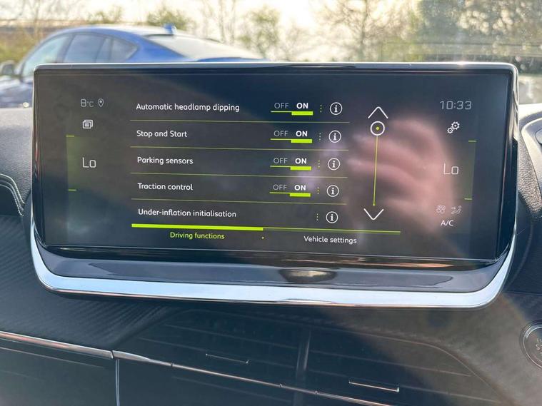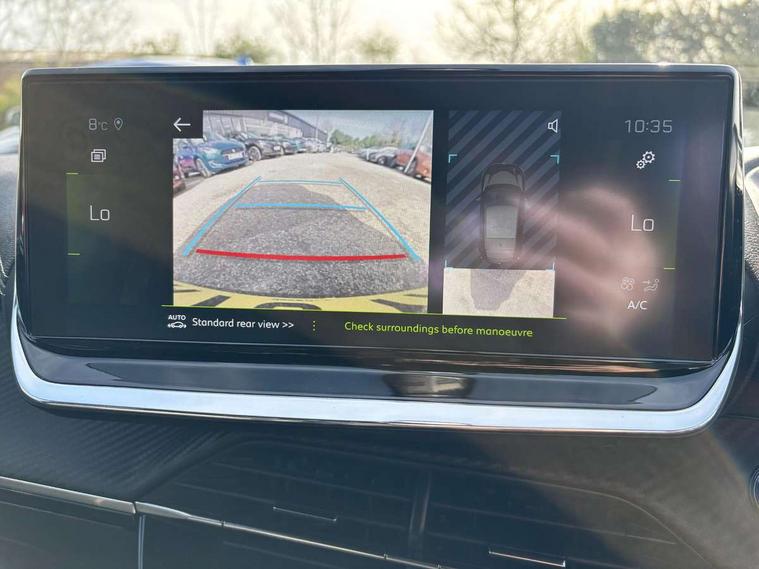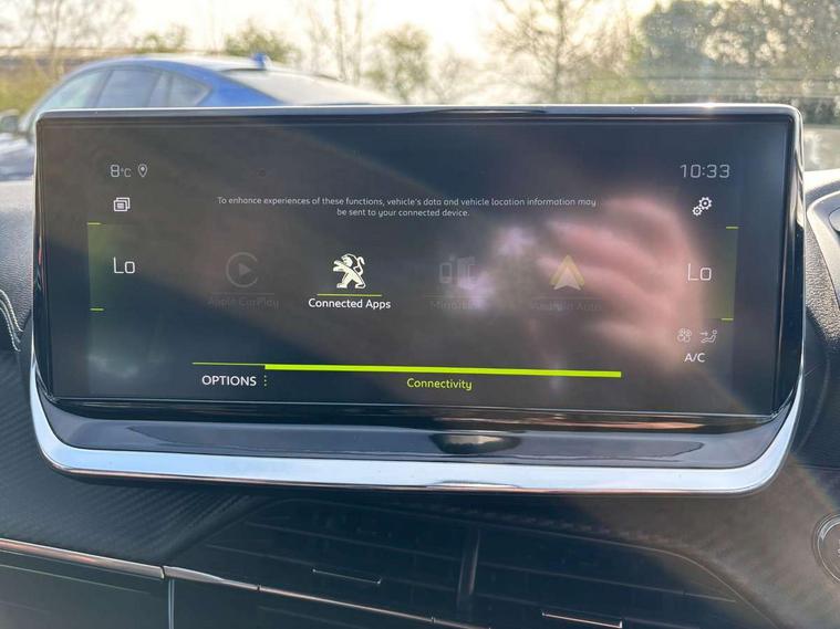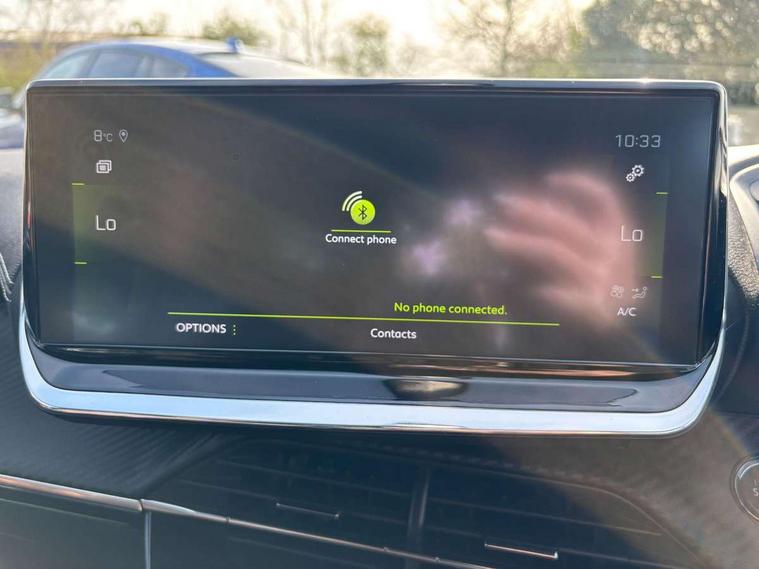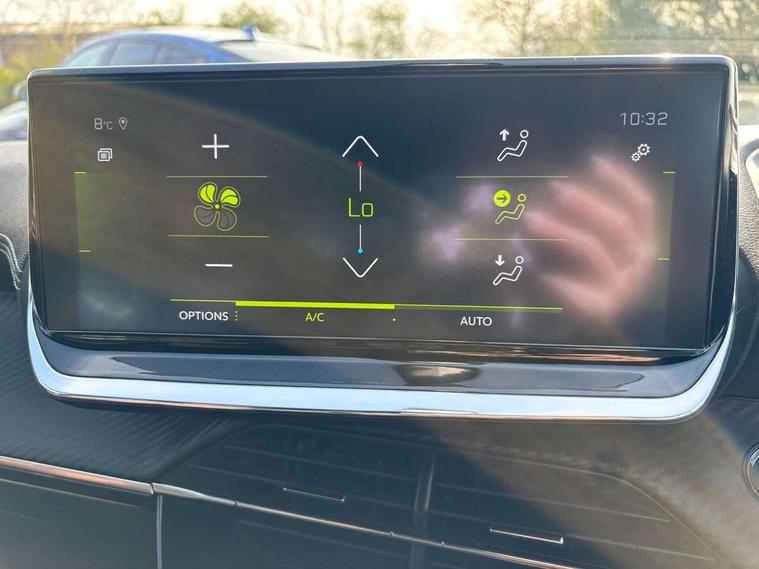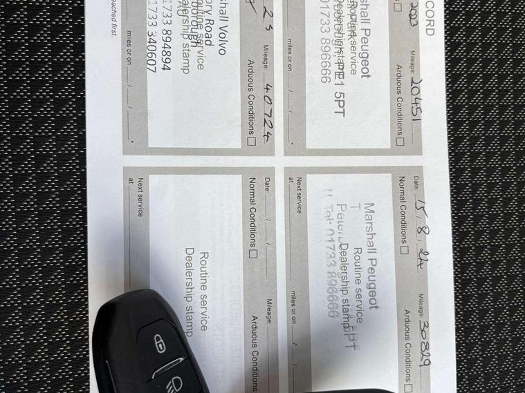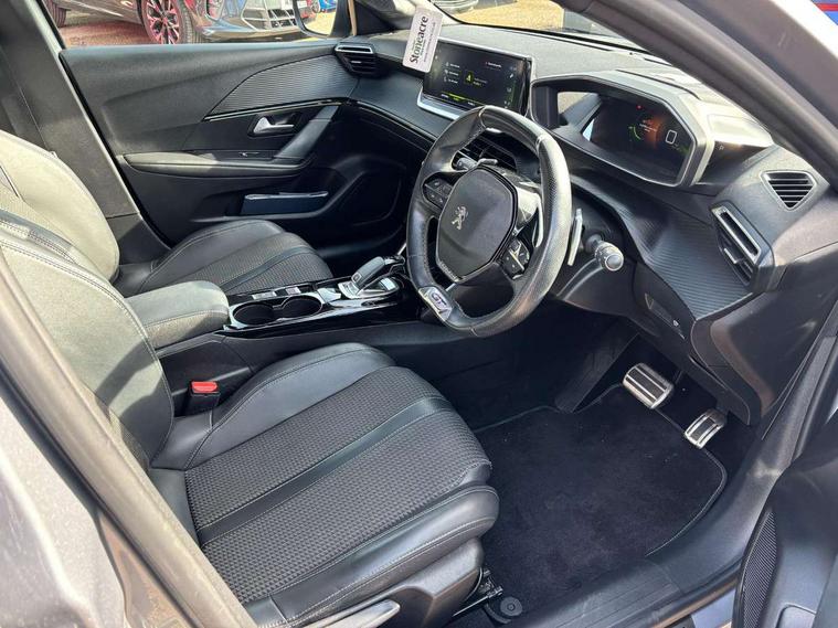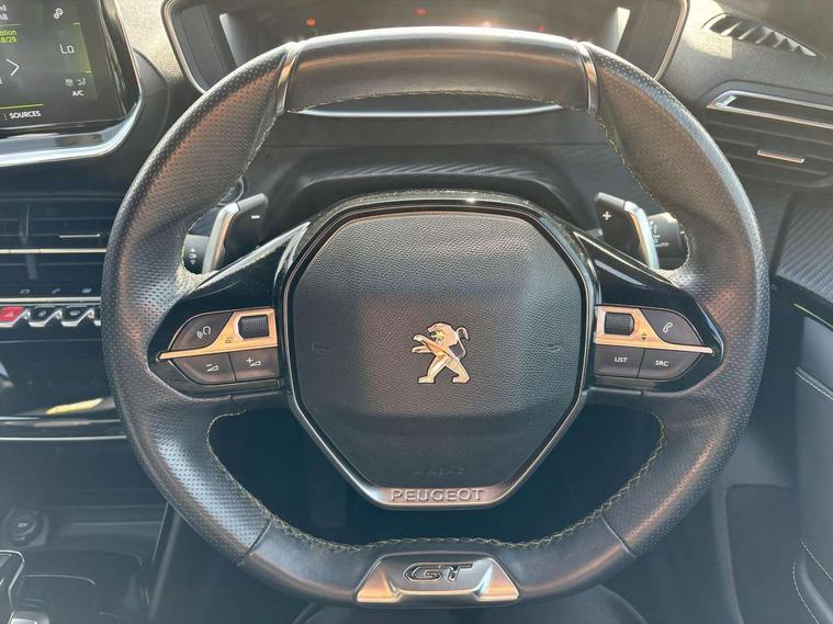 Bluetooth telephone facility, Driver attention warning, Exterior temperature indicator with ice warning, Front and rear parking sensors, Mirror screen with mirror link, apple carplay and android auto, Multi function trip computer, Peugeot connect SOS and assistance, PEUGEOT i-Cockpit with compact steering wheel, PEUGEOT i-Cockpit with configurable 3D headup instrument panel, Push button start, Smart phone docking station, Smartphone charging plate, Speed limit recognition and recommendation, Visio Park 1 with 180 degree Colour reversing camera, 2 front USB socket with USB-C, 2x USB sockets in rear, 6 speakers radio with mp3 compatible, DAB Digital radio, Voice recognition for radio, navigation and telephony features, 2 X Rear number plate lights, Automatic lights, Automatic windscreen wipers, Body coloured exterior door handles, Dark tinted Rear side and tailgate windows, Diamond Black roof, Electric front windows + one touch + anti-pinch, Electric rear windows with one touch/anti-pinch, Electrically adjustable, heated and power folding door mirrors, Extended diamond black rear spoiler, Follow me home headlights, Frameless electrochrome interior rear view mirror, Front windscreen wiper with magic wash cleaning system, Full LED headlights with smartbeam assist, Gloss black finish on B pillar, Gloss black rear cluster connecting strip, Gloss black wheel arch extensions, Gloss black window surround, GT Line model designation badging on C pillar, GT Line model designation badging on tailgate, Headlights left on audible warning, LED daytime running lights with 3 claw headlight with distinctive tooth design, LED side indicator lights integrated into door mirrors, Model designation badges front and rear, Nera black door mirror shells, Radiator grille - Dark chrome chequered and gloss black edge trim, Rear bumper with gloss black finish, Rear full LED 3D peugeot signature claw effect lights with daylight function, Rear lower bumper diffuser effect trim in gloss black, Rear reversing lights, Rear windscreen wiper triggered automatically in reverse gear, Stainless steel door sill scuff plates, Tailgate with heated rear windscreen and wiper blade, Twin chrome exhaust tailpipes, 1/3 to 2/3 split folding rear seats, 12V socket, 8 Colour personalisable ambient lighting, Aluminium pedals and foot rest, Automatic gear lever in full grain leather and satin chrome, Driver and front passenger seat manual adjustment in longitudinal and back rest angle, Driver and front passenger seat mechanical height adjustment, Driver and front passenger sport seats, Dual zone electronic climate control, Electric power steering with reach and rake adjustable steering column, Front and rear carpet mats in black with lime green stitch detail, Front centre armrest with storage compartment, Front LED interior light with 2 reading spotlights and rear interior light with timer, High centre console with 2 cup holders, ISOFIX child seat mounting points on passenger seat, Lime green contrast stitching to armrest, front centre console, door panels and dashboard facia, Map pockets on the backs of the front seats, Mistral full grain perforated leather steering wheel with aikinite stitch detail and satin chrome 'GT' emblem, Piano keys gloss black plated toggle switches to access main functions of the vehicle, Roof lining - Mistral black, Seatbelt unfastened on the move audible and visual alert for front and rear seats, 2x 2nd row ISOFIX child seat mountings, 3 rear 3 point seatbelts, ABS (Anti-lock Braking System) with EBD (Electronic Braking Distribution) and EBA (Emergency Braking Assistance), Active safety brake with night function/cyclists/pedestrians, Child locking functionality on rear doors, Driver and passenger airbags with Passenger airbag deactivation system, Driver/front passenger side airbags, Electric parking brake, ESP with Hill Assist, Front and rear curtain airbags, Front and rear disc brakes, Front optimised safety headrests and 3 x rear retractable headrests with height adjustable, Front three point retractable seatbelts with force limiters, Tyre pressure sensor, Automatic door locking when moving off, Automatic hazard light activation upon heavy brake application, Deadlock, Electronic code immobiliser, Thatcham Cat.1 alarm, Carbon effect Dashboard, front and rear door panel finish, 17" Camden diamond cut two tone alloy wheels, Space saver spare wheel,