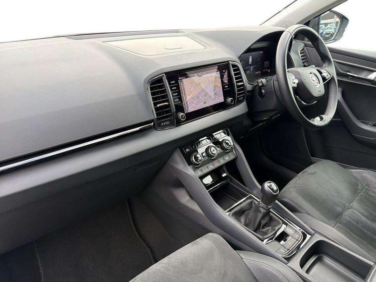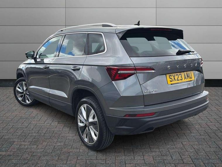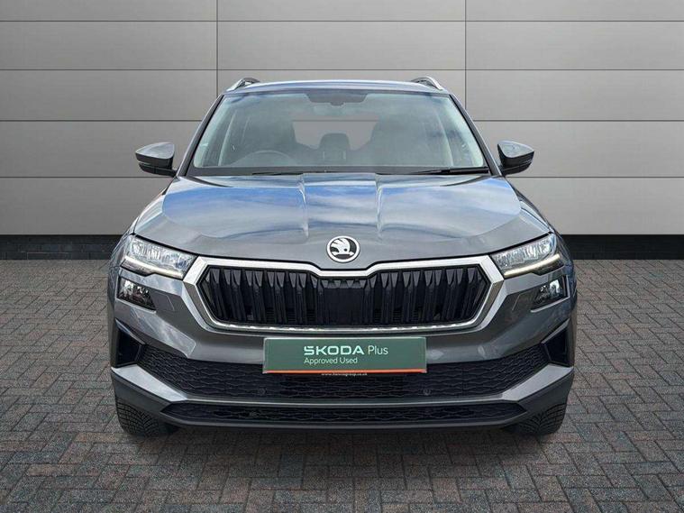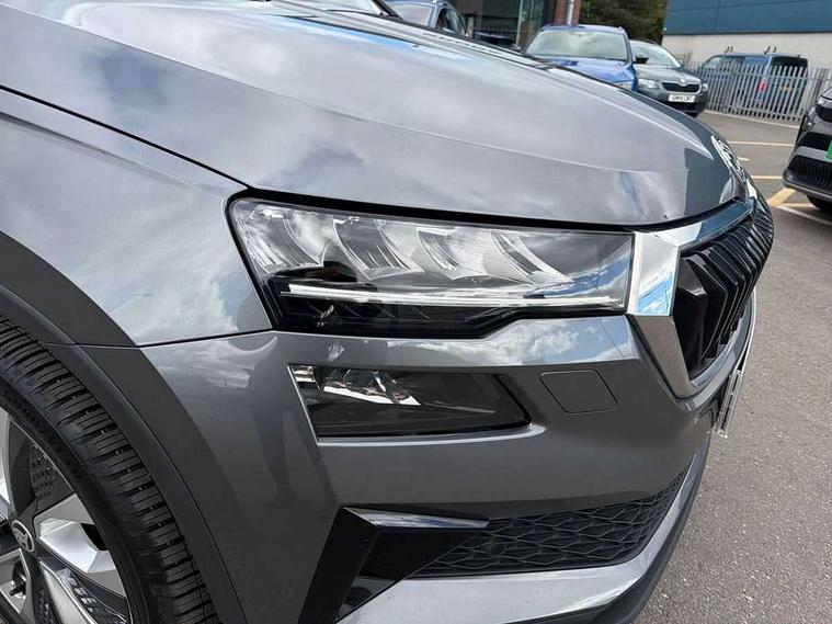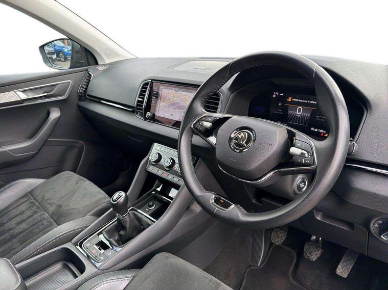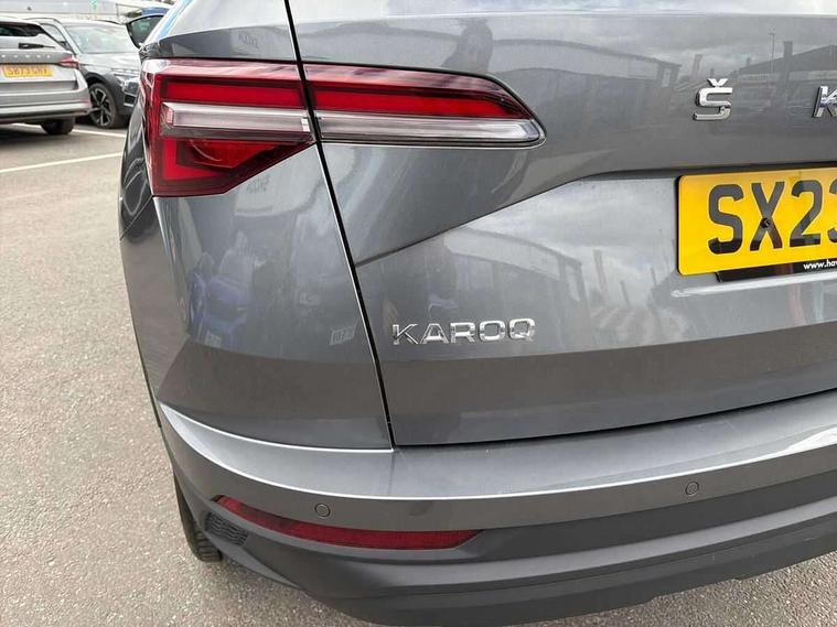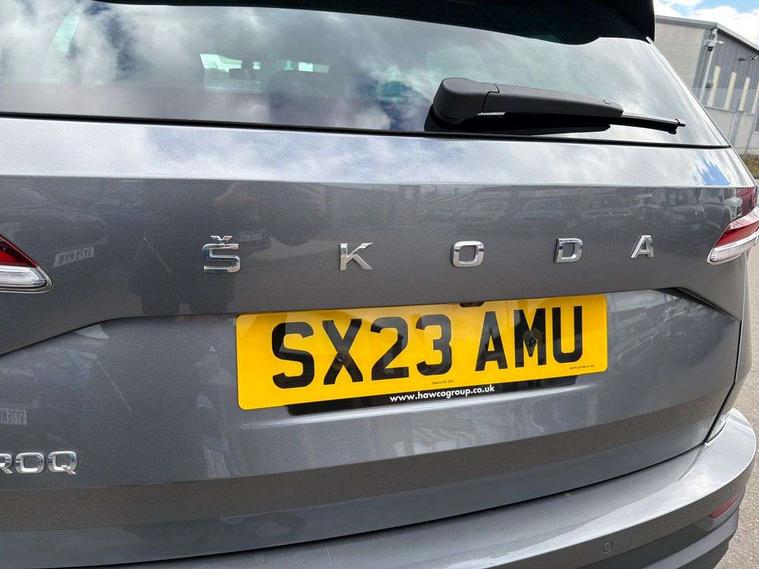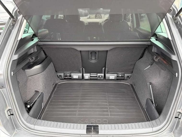 8" Digital display, Care connect, Drive mode selector, Driver fatigue sensor, Electro-mechanical PAS, Emergency services call system, Outside temperature gauge, Service interval indicator, SmartLink wireless for Apple and wired for Android, Start/stop system with regenerative braking, USB C Port x 2 in front centre console, Diesel particulate filter, 8 Speakers, DAB radio with Bluetooth, USB connection, Acoustic glass, Aero front windscreen wipers with intermittent function, Auto dimming rear view mirror with light and rain sensors, Black electric window control buttons, Body colour door mirrors and handles, Dynamic headlight range control with cornering light function, Electric front and rear windows with child proof lock, Heated rear windscreen, LED daytime running lights, LED rear lights with high functionality welcome effect and dynamic indicators, Light assistant (coming/leaving home/tunnel light), Plastic scuff plates, Privacy glass, Rear side wing doors, Rear spoiler, Rear window wiper with washer system and intermittent control, Safety reflectors on front doors, Third brake light, 1.5 litre bottle holders in driver and front passenger door panels, 12V socket in boot, 12v socket in front centre armrest with storage compartment and rear air vents, 2 spoke leather heated multifunction steering wheel, 2 x Tablet holder, 3 rear height adjustable headrests, 3 seat bench in 2nd row, 4 foldable roof handles with rear coat hooks, Black floor carpet, Chrome inner door handles, Decorative door sills with KAROQ badging, Double sided boot floor, Foldable hooks in the boot, Front head restraints, Height adjustable front three point seats belts with tensioners, Height/reach adjust steering wheel, Ice scraper, Illuminated glovebox, Illuminated luggage compartment, Interior noise suppression, Isofix child seat preparation for front passenger seat, Isofix child seat preparation outer rear, Manual lumbar support for front seats, Pen holder, Pollen filter, Rear boot cover, Rear reading lights, Rubbish bin door, Safety vest holder, Single front passenger seat, Storage box in upper central dashboard closed, Sunvisors with illuminated vanity mirrors, Textile floor mats, Ticket holder, VarioFlex seats with standard rear seat release, Boot pack - Karoq, Chrome roof rails + chrome pack - Karoq, Parking pack - Karoq, Automatic door unlocking in case of crash, Automatic fuel cut off in case of crash, Child locks on rear doors, Driver airbag, Electronic parking brake with auto hold function, Emergency rear braking signal, ESC including ABS, MSR, ASR, EDS, HBA, DSR, RBS, MKB and traction control, Front side airbags, Hill hold control, Knee airbags, Passenger airbag with switch-off function, Pedestrian monitor, Seatbelt reminder signalisation and pretensioner for all seats, Three point seatbelts rear, Two tone horn, Tyre pressure display, Tyre pressure monitor, Alarm with interior monitoring, back up horn and tilt sensor with safe function, Electronic engine immobiliser, Keyless entry and start/stop, Remote central locking with 2 remote folding keys, Chrome framed air vents, 18" Procyon silver alloy wheels with anthracite aero inserts, Anti-theft wheel bolts protection, Storage on wheel cover, Tool kit,
