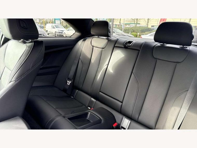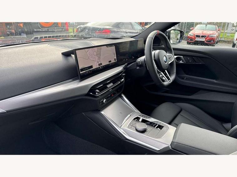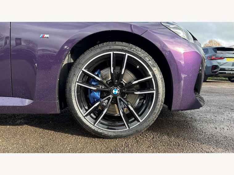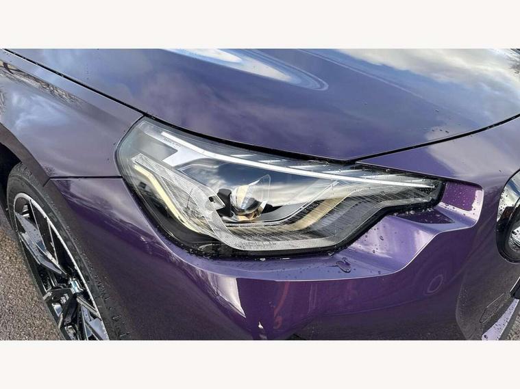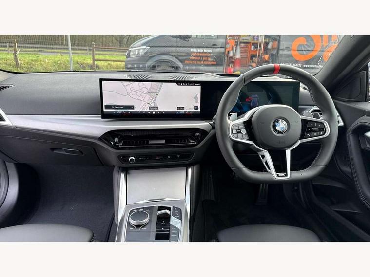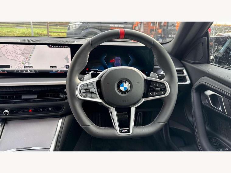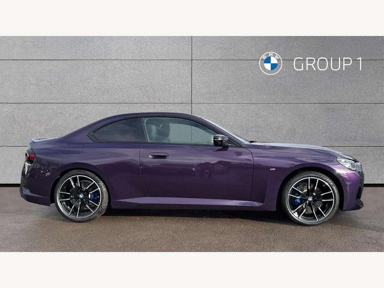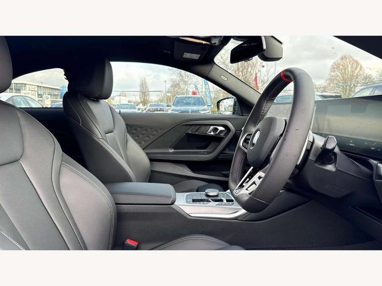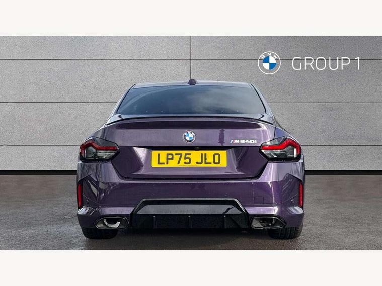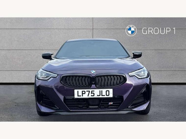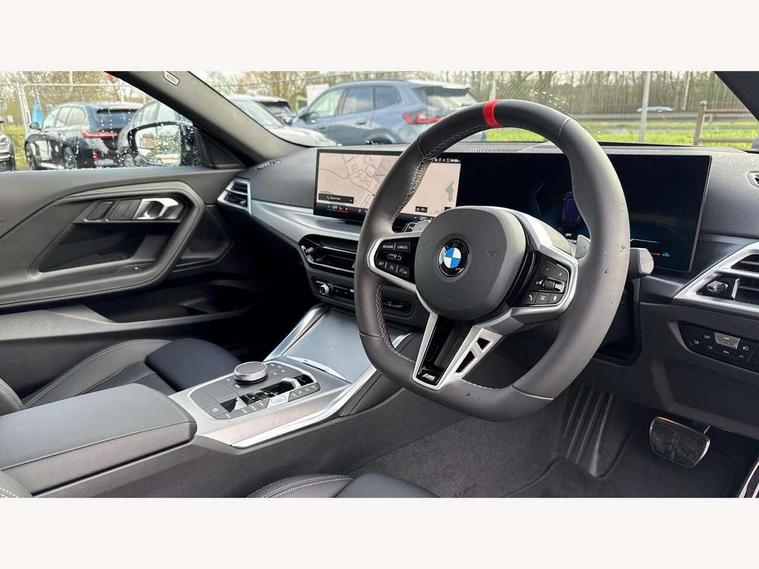 Active guard plus, Attentiveness assist, Bluetooth with USB, BMW ConnectedDrive online services, BMW Intelligent Personal Assistant, BMW Live cockpit plus, BMW Maps, BMW Teleservices, Check Control warning system for monitoring of lights and door/luggage compartment open warning, Control Infotainment, Direct selection buttons, Drive off assistant, eSim with 5G connectivity, Front and rear parking sensors, iDrive controller with turn and press function, Intelligent functions, Oil sensor for level and grade, Optimum shift indicator, Parking assistant with active park distance control, reversing assistant, lateral parking aid and rear view camera, Personal Profile, Smartphone integration, Touch operation on control display, Variable sport steering, Widescreen display with 12.3" fully digital instrument cluster and 14.9" control display, WiFi interface for wireless connection of mobile terminal devices, Aluminium lightweight construction, Balancer shaft, BMW TwinPower Turbo inline 6-cylinder petrol engine, Double VANOS, Dynamic stability control, High precision injection, M Sport differential, Petrol Particulate Filter, Sport automatic steptronic transmission with gearshift paddles, manual gearshift time display, launch control, coasting idle ECO PRO/COMFORT modes, Twin scroll turbocharger with Valvetronic, xDrive with rear orientated application, 1 x USB Type A with data transfer and 1.5 Ampere charging function in the centre console, 1 x USB Type C with 3 Ampere charging function in the front centre armrest, DAB tuner, Acoustic windscreen wipers for reduced driving noise, Automatic windscreen wipers and automatic headlight, Body color M rear spoiler, Body colour door handles flush with door surface, Body colour front and rear bumpers, Daytime running lights, Electric windows - front and rear, with open/close fingertip control and trap release, Exhaust tailpipes in high gloss black, Extended high gloss shadow line exterior trim, Exterior air inlets in front bumper with embellishers in high gloss black, Fading support, Flap controlled M Sport exhaust system, Front and rear bumper system with replaceable deformation elements, Front door sill finishers in black plastic with BMW designation, Front windscreen wipers with integrated washer jets, Green tinted heat protection glazing, High gloss black exterior M mirror caps, High gloss black radiator grille frame, High level third brake light, Indicators integrated int mirror housing, Interior rear-view mirror with automatic anti-dazzle function, LED registration plate light, LED technology rear tail lights, brake lights and turn indicators, M Aerodynamics front and rear aprons in vehicle colour and diffuser insert in black high-gloss, M entry sills, front, M high gloss shadowline, M logo in front air inlet, M model badge on front side panel, left and right, M pedal mechanism, Model and M badges in pearl chrome, Rear boot, Rear fog lights, Reversing light in rear light cluster, Roof trim strip in vehicle colour, Shark fin antenna, Side frame trim strip in high gloss black, Side sill trim panels in vehicle colour, Single part LED rear lights with smoked glass components, Sun protection glass, Trailer stabilisation logic, Visible VIN plate, Window recess finisher strip in high gloss black, xDrive designation on left tailgate, 12V power socket in front centre console with blanking plug, 2 cupholders in front centre console, 2 zone automatic air conditioning, 3 spoke flat bottom M leather steering wheel with center red mark, Ambient door pocket lighting in the cetre console, Ambient inside door handle light, Area lighting in the door trim panel, Conditioned based service, Door entry lights in the front door trim panel, Dynamic ambient lighting for welcome, goodbye, open doors, phone call, English handbook, Folding rear seat head rests, Front ambient footwell lighting, Front ambient lighting, Front and rear side armrests integrated into door trim, Front armrest, Front door pockets, Front head restraints, Heated front seats, Illuminated glove compartment with separate small compartment, M headliner Anthracite, M240i badge in instrument cluster, Manually adjustment steering wheel column, Rear seat backrest with manual 40:20:40 split folding, Rear seat centre foldable armrest with integrated cup holder, Single front passenger seat, Storage compartment between rear seats, Storage tray and compartment with cover in centre console, Sun visors with vanity mirrors and insert tab, Through loading system with 40/20/40 split folding 2 rear seat in 2nd row, Velour floor mats, Connected pack professional - 2 Series Coupe, Storage compartment pack - 2 Series Coupe, 2 tone horn, Anti lock braking system (ABS) with cornering brake control, BMW emergency call, Brake drying, Child seat ISOFIX attachment for the two outer rear seats, Crash sensor activating of airbags, Unlocking doors, hazard warning lights, interior light, safety battery terminal, Deactivation of fuel pump in the event of a crash, Driver and front passenger airbags, Driver and front passenger side airbags, integrated in the door side seat backrest bolsters for all seat variants, Dynamic brake control, Dynamic Traction Control - DTC, Electrically operated hand brake including automatic hold function and automatic release when driving off, Front and rear disc brakes, Front centre airbag between driver and front passenger seats, Front passenger airbag deactivation, Head airbags for all 4 outer seats, M Sport brakes with dark blue metallic calipers, PC iBrake (Post crash approach control warning with light braking function), Seat belt security check for driver and front passenger, Seatbelt warning, Side impact protection, Three point seat belts on 4 seats including front belt stopper, pyrotechnic belt tensioners and belt force limiters, Tyre pressure monitoring system, Warning triangle and first aid kit, Alarm system (Thatcham 1) with remote control and electronic engine immobiliser, Central locking switch f