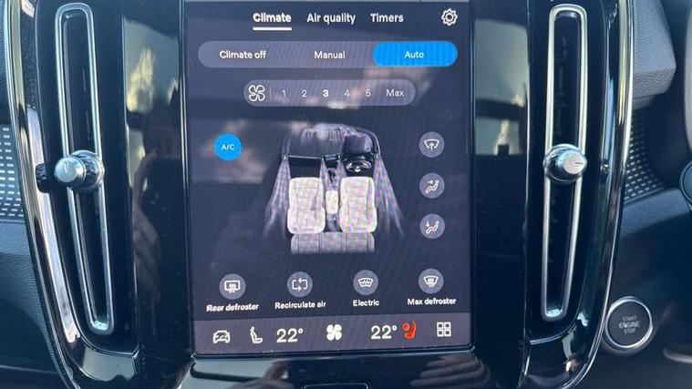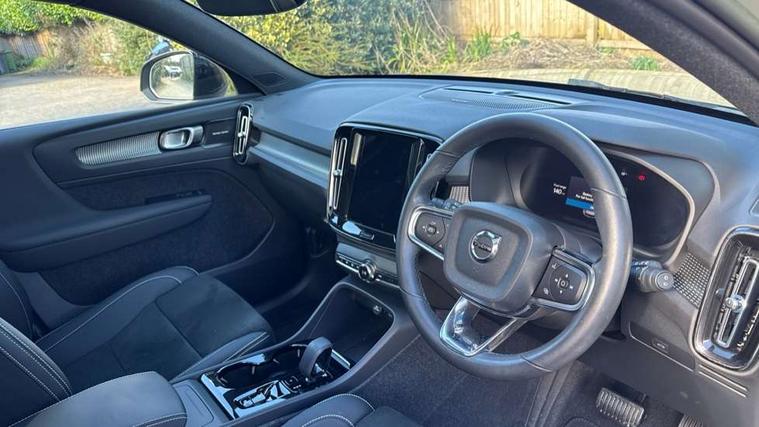12.3" Progressive Driver Display, 360 degree surround view parking camera with side proximity sensors, 9" centre console portrait touch screen, Adjustable steering wheel force, Bluetooth hands free telephone kit, E-call, Front park assist, Google automatic services - Nav with google maps, apple carplay/android auto, voice recognition with google assistant, Hands free power tailgate, Lane keep assist with driver alert control, Oncoming Lane Mitigation, Rear park assist, Speed limiter, Speed sensitive steering, Wireless/Inductive Mobile Phone Charging, Dynamic chassis, DAB Digital radio, Premium Sound by Harman Kardon, Dolby Pro Logic II Surround Sound, Dirac Unison, 12 speakers/600W and subwoofer, Steering wheel mounted remote controls, Active bending pixel LED headlights with adaptive shadow technology, Active high beam incorporating daytime running lights, Adaptive brake lights with high level LED brake lights, Auto dimming interior mirror, Automatic headlamp levelling, Dark tinted windows for rear door side windows and cargo compartment, Front aluminium tread plates, Front and rear electric windows, Headlight cleaning system, High gloss black front and rear skid plate, High gloss black mesh front grille with high gloss black surround, High gloss black window trim, Home safe and approach lighting, Integrated roof rails in high gloss black, LED front fog lights, Power glass tilt and slide panoramic sunroof with sun curtain, Puddle lights, Rain sensor with automatic windscreen wiper activation, Rear side wing doors, Rear wiper, Roof antenna, Roof spoiler, Visible VIN plate, 12V socket in front tunnel console and luggage compartment, 2-Zone electronic climate control with CleanZone air quality system and pollen filter, 3 seat bench in 2nd row, 3 Spoke tailored steering wheel with chrome trim, 60/40 versatile split folding rear seat, A-pillar parking ticket holder, Ambient front door and instrumental panel lighting, Centre console cupholders and storage, Flexible load floor and grocery bag holder, Floor mats, Front door pocket and front cupholder illumination, Front footwell illumination, Front headrests, Front reading light and theatre lighting, Front seat cushion extensions, Front tunnel pocket, Glovebox bag hook, Heated front seats, Height adjustable passenger seat, Height/reach adjustable steering column, High gloss centre tunnel deco, Illuminated glovebox, Illuminated luggage compartment, Illuminated tailgate, Illuminated vanity mirrors, Integrated waste bin, Isofix attachments on outer rear seats, Load protection net, Multi directional lumbar support, Power driver seat with memory + exterior mirrors memory, Power folding rear headrests, Power passenger seat, Rear armrest / integral cup holders / storage tray, Rear reading and courtesy lights, Single front passenger seat, Underfloor cargo storage, Climate pack without heated front seats - XC40, Driver assist pack - XC40, 3x3 point rear seatbelts, City safety with steering support with Pedestrian + cyclist + front collision warning with full auto brake and rear auto brake, Drivers knee airbag, Dual stage driver/passenger airbags, Electronic parking brake with auto hold, First aid kit, Front and outer rear seatbelt reminder and pretensioners, Front seats SIPS airbags, Hill descent control, Hill start assist, Inflatable curtain, Passenger airbag cut-off device, Power child locks on rear doors, Road sign information display, Run off Road Mitigation, Run off Road Protection, SIPS (Side Impact Protection System), Slippery road and hazard light alert, Stability and Traction Control with Spin control, Engine Drag Control and Corner Traction Control, Tyre pressure monitoring system, Vehicle deceleration control with Anti-lock Brake System, Electronic Brake Distribution and Emergency Brake Assist, Warning triangle, WHIPS whiplash protection system - front, Anti-theft alarm including immobiliser/volume sensor + level sensor, Key integrated remote control central locking + fuel flap with deadlocking system and auto open/close power windows, Keyless drive includes keyless entry and keyless start, Locking wheel nuts,