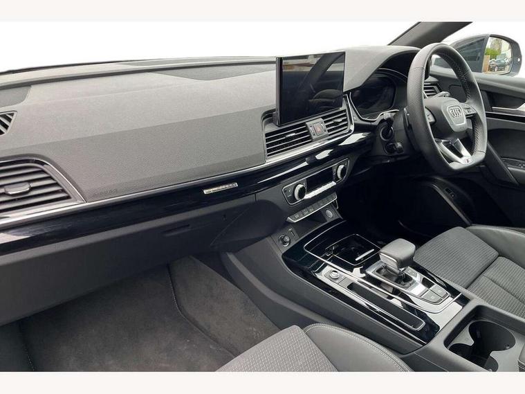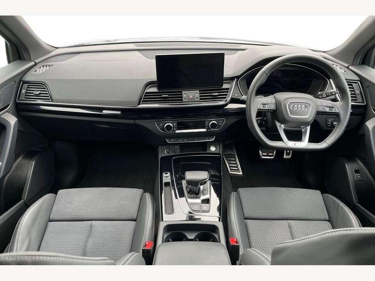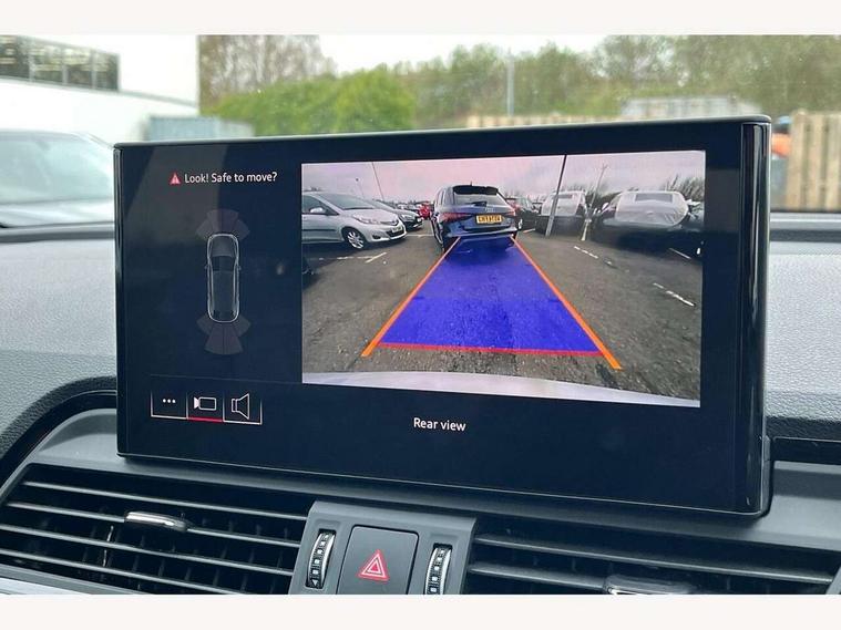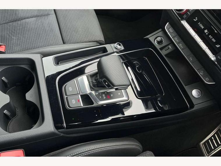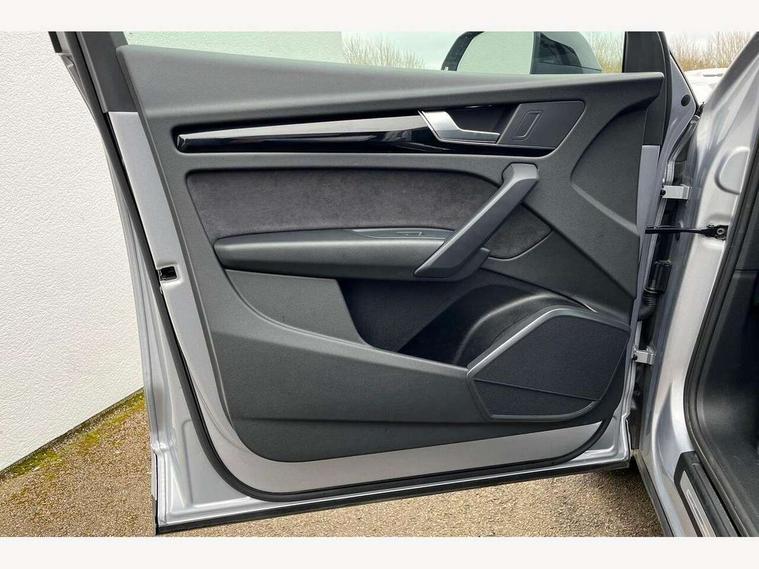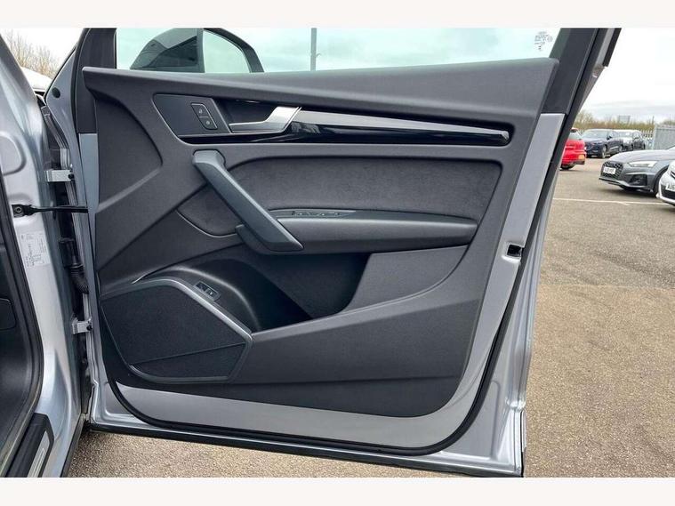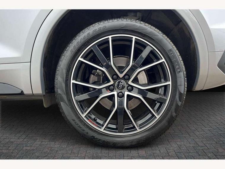 Acoustic front and rear parking sensor, Audi connect safety and service (e-call), Audi drive select, Audi virtual cockpit plus with 12.3" screen and three different layout designs, Audi wireless smartphone interface, Automatic start-stop system with coasting functionality and efficiency programme, Bluetooth interface, Camera based traffic sign recognition, Electro - mechanical power assisted steering, Lane departure warning, MMI navigation plus with 10.1" touch screen, Power tailgate, Reversing camera, Service interval indicator, Voice control system with Audi hotword activation "Hey Audi", Diesel particulate filter, Quattro on demand, S line sports suspension, 2 x USB charging port with aux input socket, 8 loudspeakers, DAB Digital radio, Acoustic windscreen, Auto dimming door mirrors, Auto dimming frameless rear view mirror, Automatic headlight adjustment, Automatic headlights and windscreen wipers, Black roof rails, Black styling with black rings, Body colour bumpers, Body colour rear diffuser with matt aluminium silver surrounds, Body colour underbody protection, Chrome plated exhaust trims, Daytime running lights, Door sills in Selenite silver, Electric adjustable/heated/folding door mirrors, Front air inlet surrounds in aluminium, Front and rear electric windows, Front radiator grille in honeycomb design, LED 3rd brake light, LED headlights and LED tail lights, Loading edge protection in stainless steel, Lower bumpers painted in contrast Manhattan grey, Rear chrome trim strip below lights, Rear privacy glass and rear side windows, Rear side wing doors, Rear wiper, Roof bars, S Line badges on the front wing panels, S Line front and rear bumpers, S Line rear spoiler, S Line side skirts, 3 rear headrests, Black cloth headlining, Comfort front centre armrest, Contrast stitching on seats, steering wheel and gear lever gaiter, Deluxe 3 zone electronic climate control, Front head restraints, Front sport seats with S embossed logo, Front/rear floor mats, Gear lever in black leather, Heated front seats, Height/reach adjustable steering column, Illuminated door sill trims with S logo, Luggage compartment cover, Manual seat adjustment with 4-way electric lumbar support, Single front passenger seat, Stainless steel pedals, Sunvisors with vanity mirrors, Top surface of the rear centre armrest in artificial leather, High gloss pack - Q5, LED interior light pack - Q5, 3 point seatbelts on all seats, 6 airbags - Driver, front passenger, curtain and side airbags, Attention and drowsiness assist, Electrically operated child locks on rear doors, Electromechanical parking brake, Electronic stabilisation control including ABS, ASR and EDL, First aid kit with warning triangle and vests, Front passenger airbag deactivation, Hill descent control, Hill hold assist, ISOFIX child seat mounting for front passenger seat and ISOFIX child seat mounting with Top Tether for outer rear seats, Multi collision brake assist, Pop-up bonnet for pedestrian protection, Pre sense city, Seatbelt monitoring, Tyre pressure warning, Anti theft alarm, Anti-theft wheel bolts, Remote central locking, Remote control key with SAFELOCK and keyless go, Air vents inserts and centre console in gloss black, Tool kit, Tyre repair kit,