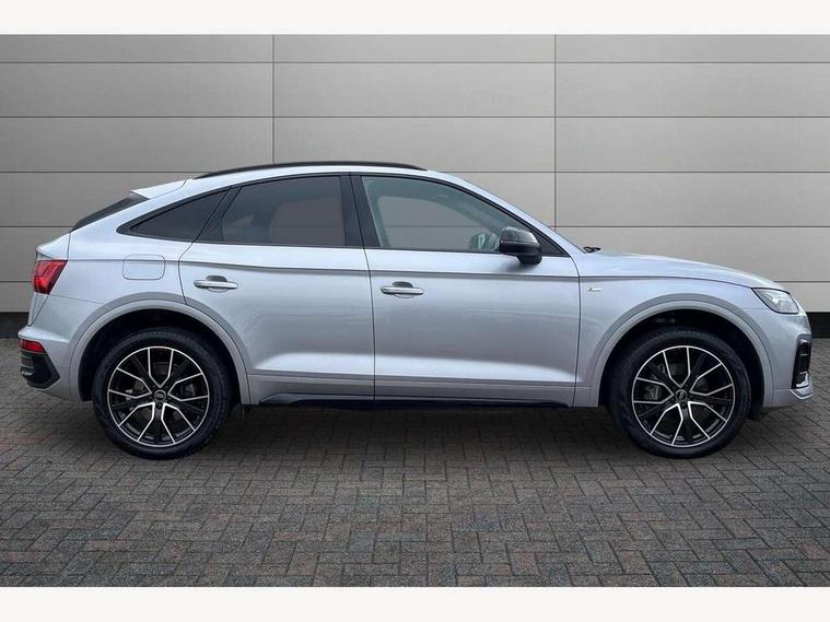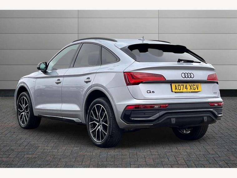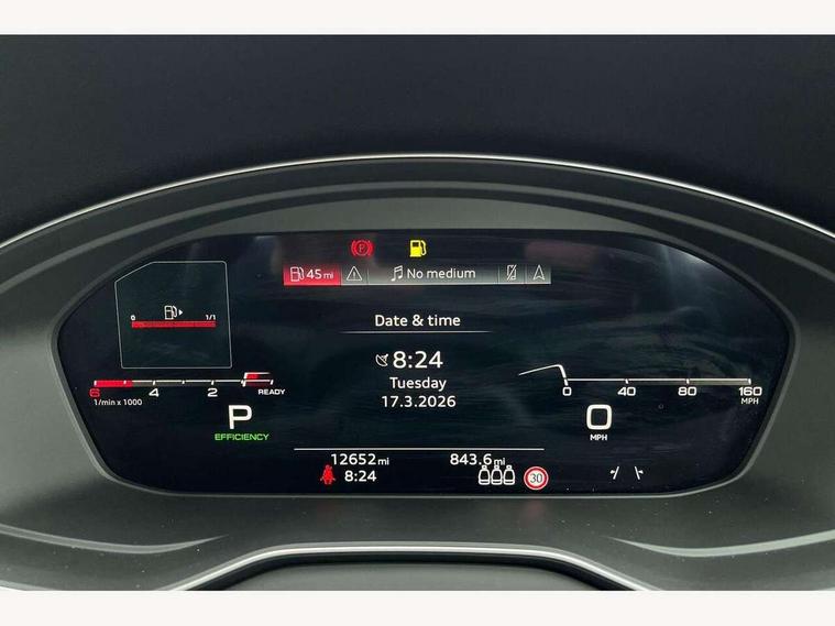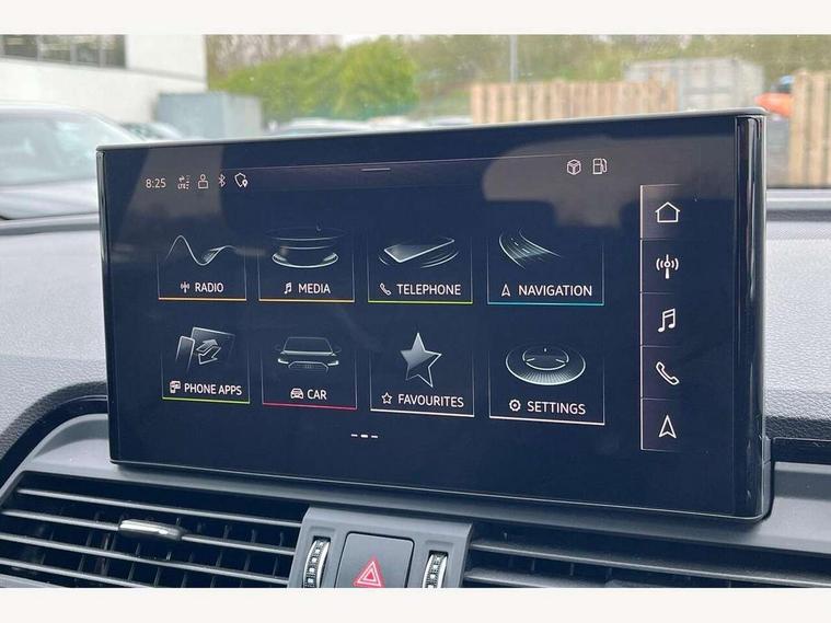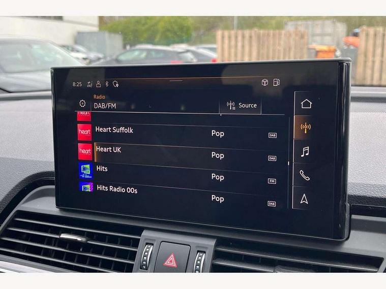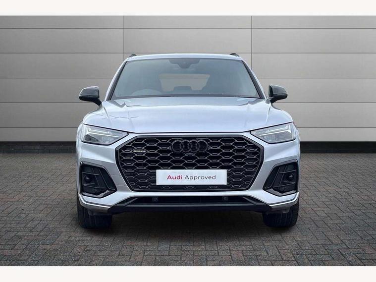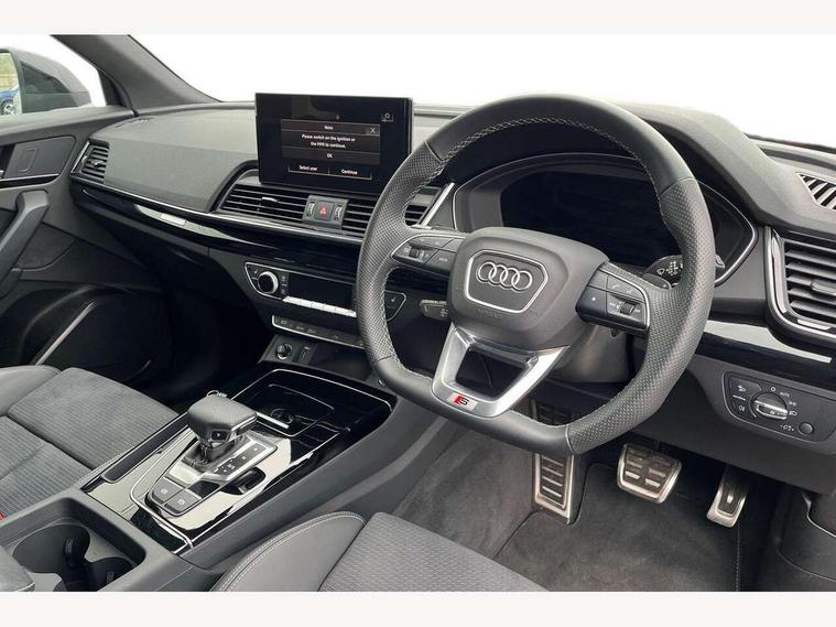 Acoustic front and rear parking sensor, Audi connect safety and service (e-call), Audi drive select, Audi virtual cockpit plus with 12.3" screen and three different layout designs, Audi wireless smartphone interface, Automatic start-stop system with coasting functionality and efficiency programme, Bluetooth interface, Camera based traffic sign recognition, Electro - mechanical power assisted steering, Lane departure warning, MMI navigation plus with 10.1" touch screen, Power tailgate, Reversing camera, Service interval indicator, Voice control system with Audi hotword activation "Hey Audi", Diesel particulate filter, Quattro on demand, S line sports suspension, 2 x USB charging port with aux input socket, 8 loudspeakers, DAB Digital radio, Acoustic windscreen, Auto dimming door mirrors, Auto dimming frameless rear view mirror, Automatic headlight adjustment, Automatic headlights and windscreen wipers, Black roof rails, Black styling with black rings, Body colour bumpers, Body colour rear diffuser with matt aluminium silver surrounds, Body colour underbody protection, Chrome plated exhaust trims, Daytime running lights, Door sills in Selenite silver, Electric adjustable/heated/folding door mirrors, Front air inlet surrounds in aluminium, Front and rear electric windows, Front radiator grille in honeycomb design, LED 3rd brake light, LED headlights and LED tail lights, Loading edge protection in stainless steel, Lower bumpers painted in contrast Manhattan grey, Rear chrome trim strip below lights, Rear privacy glass and rear side windows, Rear side wing doors, Rear wiper, Roof bars, S Line badges on the front wing panels, S Line front and rear bumpers, S Line rear spoiler, S Line side skirts, 3 rear headrests, Black cloth headlining, Comfort front centre armrest, Contrast stitching on seats, steering wheel and gear lever gaiter, Deluxe 3 zone electronic climate control, Front head restraints, Front sport seats with S embossed logo, Front/rear floor mats, Gear lever in black leather, Heated front seats, Height/reach adjustable steering column, Illuminated door sill trims with S logo, Luggage compartment cover, Manual seat adjustment with 4-way electric lumbar support, Single front passenger seat, Stainless steel pedals, Sunvisors with vanity mirrors, Top surface of the rear centre armrest in artificial leather, High gloss pack - Q5, LED interior light pack - Q5, 3 point seatbelts on all seats, 6 airbags - Driver, front passenger, curtain and side airbags, Attention and drowsiness assist, Electrically operated child locks on rear doors, Electromechanical parking brake, Electronic stabilisation control including ABS, ASR and EDL, First aid kit with warning triangle and vests, Front passenger airbag deactivation, Hill descent control, Hill hold assist, ISOFIX child seat mounting for front passenger seat and ISOFIX child seat mounting with Top Tether for outer rear seats, Multi collision brake assist, Pop-up bonnet for pedestrian protection, Pre sense city, Seatbelt monitoring, Tyre pressure warning, Anti theft alarm, Anti-theft wheel bolts, Remote central locking, Remote control key with SAFELOCK and keyless go, Air vents inserts and centre console in gloss black, Tool kit, Tyre repair kit,